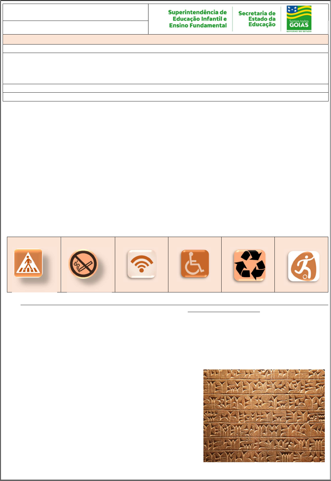 ATIVIDADES INSCRIÇÃO GRÁFICA: Todas as formas de inscrição gráfica se originam da necessidade humana de se comunicar e se exprimir. Mesmo antes da invenção das escritas já existia formas que os homens utilizavam para se expressar, uma delas são as pinturas rupestres. A invenção da escrita é um divisor de águas na história da humanidade. A sua história remonta há milhares de anos e conta com a participação de povos distintos, de forma independente e em épocas diferentes. Vamos conhecer algumas formas de registro de algumas sociedades antigas. Para isso vamos começar analisando a evolução dos pictogramas por meio da história. 01. Pesquise no dicionário o significado de pictograma, e registre em seu caderno. 02. Atualmente, o uso do pictograma tem sido muito frequente na sinalização de locais públicos, e em várias representações esquemáticas de diversas peças de design gráfico. Vamos identificar alguns deles: Imagem 1 Imagem 2 Imagem 3 Imagem 4 Imagem 5 Imagem 6 Imagens disponíveis em: https://www.google.com/search?rlz=1C1GGRV_enBR765BR766&sxsrf=ALeKk02YH1Qmg6zQV3SUGBXodqOVfUXncw:158757668989 3&q=sinais+pictograficos+atuais Acesso em 22 de abr. de 2020. 03. Veja que não foi difícil você identificar o que cada um destes pictogramas representa. Agora dê a sua opinião! Por que ainda hoje os pictogramas são usados? Agora vamos conhecer algumas formas de registro de algumas sociedades antigas que foram pioneiras no uso dos pictogramas. Para isso vamos ler alguns textos. ESCRITA CUNEIFORME A escrita cuneiforme é, juntamente com os hieróglifos egípcios, o mais antigo tipo conhecido de escrita. A escrita cuneiforme é considerada a mais antiga língua humana escrita conhecida, e é definida como uma escrita produzida com o auxílio de objetos em formato de cunha, que é uma pequena ferramenta de entalhe. Foi criada pelos sumérios por volta de 3.500 a.C, na antiga Mesopotâmia. A escrita representava pictogramas, que eram gravados em tabuletas de argila. 6º ANO HISTÓRIA ATIVIDADE 6 Tema: Formas de registros Habilidades Essenciais: (EF06HI07) Identificar aspectos e formas de registro das sociedades antigas na África, no Oriente Médio e nas Américas, distinguindo alguns significados presentes na cultura material e na tradição oral dessas sociedades. (GO-EF06HI07-A) Identificar o surgimento da escrita e sua utilização pelos Povos da Antiguidade, compreendendo sua importância no passado e no presente. NOME: UNIDADE ESCOLAR: (Foto: depositphotos) No início, a escrita representava pictogramas, que eram gravados em tabuletas de argila, em sequências verticais, com o auxílio de um estilete feito de cana. Posteriormente, as formas tornaram-se mais simples, que aos poucos foi se transformando em um conjunto de centenas de sinais fonéticos e silábicos. Com o decorrer do tempo, houve outra mudança: deixou de ser escrita em colunas e começou a ser escrita em linhas (escrita horizontal) e da esquerda para a direita. Com o ajuste da posição relativa da tabuleta ao estilete, o escritor poderia traçar uma grande variedade de signos. As tabuletas cuneiformes eram empregadas de duas maneiras: eram cozidas em fornos para um registro permanente; ou eram reaproveitadas, caso a informação não fosse tão importante. A escrita cuneiforme foi se popularizando e foi adotada por outros povos, incluindo os acadianos, babilônicos, elamitas, hititas e assírios. O seu principal uso foi na contabilidade e na administração, mas, com a popularização deste tipo de escrita, ela passou a ser utilizada na comunicação e no trabalho. A escrita cuneiforme foi extensamente usada na Mesopotâmia durante aproximadamente 3 mil anos, mas foi somente no século XX que documentos esclareciam alguns pontos para a compreensão deste tipo de escrita. No entanto, a compreensão dos textos sumérios pode ser difícil até para especialistas, principalmente os mais antigos, por não mostrarem a estrutura gramatical de uma maneira sólida. Disponível em: https://www.estudopratico.com.br/escrita-cuneiforme/ Acesso em: 22 de abr. de 2020. 4. No trecho a seguir: “A escrita cuneiforme foi se popularizando e foi adotada por outros povos, incluindo os acadianos, babilônicos, elamitas, hititas e assírios. O seu principal uso foi na contabilidade e na administração, mas, com a popularização deste tipo de escrita, ela passou a ser utilizada na comunicação e no trabalho”. O que os termos grifados significa? 5. Por que este tipo de escrita levou este nome? 6. A escrita cuneiforme é considerada a mais antiga língua humana escrita conhecida, e é definida como uma escrita produzida: Por quem? Quando? Onde? Como? Agora que você já conhece a escrita dos sumérios, vamos até o Egito conhecer outro tipo de forma de registro! Para isso leia o texto a seguir: A ESCRITA DO ANTIGO EGITO A escrita do antigo Egito era organizada em forma de hieróglifos, mas existiam outras duas formas de escrita: escrita hierática (escrita em formato cursivo para fins comerciais) e a escrita demótica (mais simplificada e mais popular). Hieroglífica (vem do grego “hieróglifo”, que significa sinal sagrado) e era primitivamente pictográfica, isto é, cada símbolo representava um objeto. Essa escrita era constituída de mais de seiscentos caracteres. Além da escrita hieroglífica, os egípcios usavam dois outros sistemas de escritas. A escrita hierática, que era organizada em formato cursivo e usada para fins comerciais; e a escrita demótica, que foi usada nos últimos períodos, pois era uma forma mais simples e mais popular da escrita hierática. O francês Jean-François Champollion (considerado o pai da egiptologia), professor de História da Universidade de Grenoble, na França, foi quem conseguiu pela primeira vez, em 1822, traduzir um texto em hieróglifos, gravado na famosa pedra de Roseta. A pedra foi encontrada na cidade de Roseta, por acaso, durante uma expedição de Napoleão Bo