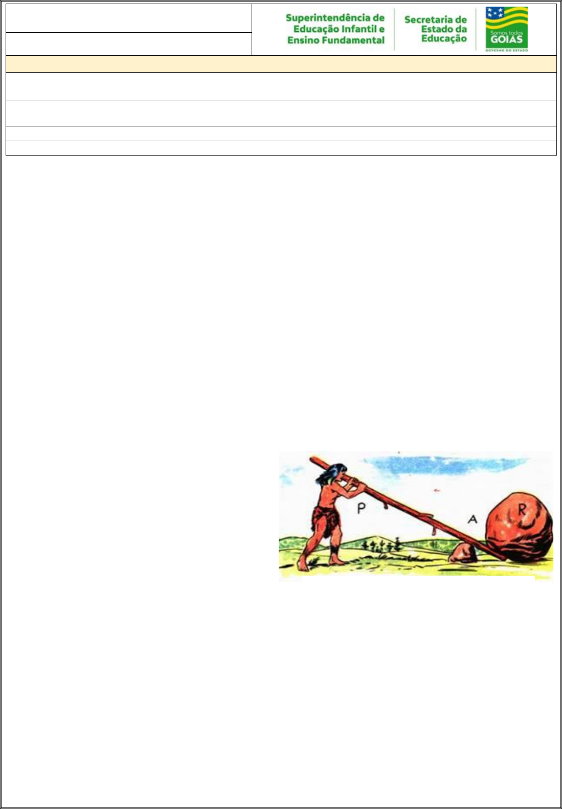 Figura 1: Alavanca. Disponível em: <https://tinyurl.com/y5qlq9ej>. Acesso em 15 nov. 2020. Máquinas Simples Em nosso dia-a-dia, vivemos cercados de máquinas. É muito comum nos depararmos com máquinas de todos os tipos, desde as mais simples até as mais complexas. Usamos um abridor para abrir latas, cortamos papel com uma tesoura, penduramos quadros em pregos fixados na parede pelos martelos e seguramos as crianças pequenas em carrinhos de bebê. Somos cada vez mais dependentes de máquinas cada vez mais complexas, como os carros ônibus e os trens que utilizamos para ir à escola, ao local de trabalho entre outros. Sabemos que as máquinas variam das mais simples as mais complexas. Máquinas complexas são aquelas que utilizam dispositivos eletrônicos em sua composição, como os circuitos integrados. Um exemplo de máquina complexa são os computadores. Toda máquina tem uma ou várias funções. Iremos iniciar o estudo de algumas máquinas que facilitam a atividade humana simplesmente por nos permitir realizar uma tarefa com menor esforço físico. Por exemplo, quando pregamos um prego na parede com um martelo, fazemos um esforço muito menor do que o necessário para pregá-lo usando apenas as mãos, o que certamente nem conseguiríamos. Denominaremos de máquinas simples às que modificam e transmitem a ação de uma força para realizar algum movimento. Abridor de latas, martelo, tesoura, chave de fenda, alicate, quebra-nozes, carrinho de mão, pinça e cortador de unha são exemplos de máquinas simples. Máquinas simples são aquelas que modificam e transmitem a ação de uma força para realizar algum movimento. Alavancas Imagine a seguinte situação: você precisa levantar um saco cheio de mantimentos. A massa total do saco é 120 kg. Poucas pessoas conseguem, e geralmente somente aquelas que se preparam para isso. Entretanto, no decorrer da história, as pessoas muitas vezes tiveram que levantar pedras ou objetos, e não contavam com máquinas para auxiliá-las. Há mais de 22 séculos, um homem chamado Arquimedes (287 – 212 a.C.) encontrou um método extremamente simples para resolver esse problema: ele descobriu as alavancas. Uma alavanca nada mais é do que uma barra rígida que pode girar em torno de um ponto de apoio. Em pleno século III a.C. Arquimedes afirmou: “Dê-me uma alavanca que moverei o mundo” Entendendo as forças: Força resistente – é a força que queremos equilibrar. No exemplo acima, é o peso do saco de mantimentos. Força potente – é a força que sustentará a resistência. No exemplo, é a força que fazemos. Tipos de alavancas 7º ANO CIÊNCIAS DA NATUREZA ATIVIDADE 1 Tema: Máquinas simples: Utilização, construção e aplicabilidade de máquinas simples. Habilidades Essenciais: (EF07CI01) Discutir a aplicação, ao longo da história, das máquinas simples e propor soluções e invenções para a realização de tarefas mecânicas cotidianas. NOME: UNIDADE ESCOLAR: Figura 2: Tipos de Alavanca. Disponível em: <https://tinyurl.com/y39kc65y>. Acesso em 15 nov. 2020. Figura 3: Roldanas. Disponível em: <https://brasilescola.uol.com.br/fisica/rol danas.htm>. Acesso em 15 nov. 2020. INTERFIXA: É quando o ponto apoio (A) está entre a aplicação da força potente (P) e a aplicação da força resistente (R). INTERPOTENTE: É quando a aplicação da força potente (P) está entre a aplicação da força resistente (R) e o ponto de apoio (A). INTER-RESISTENTE: É quando a aplicação da força resistente (R) está entre a aplicação da força potente (P) e o ponto de apoio (A). Disponível em: <https://www.sobiologia.com.br/conteudos/oitava_serie/mecanica18.php> Acesso em: 15 nov. 2020. Roldanas Roldanas são tipos de rodas que, devidamente associadas, podem fornecer uma configuração capaz de diminuir a força necessária para erguer um objeto. As roldanas, também chamadas de polias, são tipos de rodas utilizados em máquinas para direcionar a força feita sobre determinados objetos por meio de fios, cordas ou cabos, de modo que seja possível desviar a trajetória ou até mesmo levantá-los. Elas são utilizadas na construção civil, na composição de motores, aparelhos de academia etc. ROLDANA FIXA: Ela geralmente é utilizada para erguer objetos pesados, e a força feita para tal tarefa corresponde exatamente ao peso do objeto elevado. ROLDANAS FIXAS E MÓVEIS: Existe uma forma de associar roldanas de modo que a força necessária para elevar determinado objeto seja menor que o peso do referido corpo. Na imagem a seguir, a roldana de número 1 está presa ao teto, por isso, é fixa e capaz de alterar a direção e o sentido de aplicação da força. As roldanas 2, 3 e 4, que são denominadas de soltas (móveis), estão acopladas entre si, e o objeto levantado está preso à roldana 4. Disponível em: <https://brasilescola.uol.com.br/fisica/roldanas.htm> Acesso em: 15 nov. 2020. Plano inclinado Denomina-se plano inclinado a todo plano que forma um ângulo com a superfície horizontal. Um exemplo de plano inclinado é a rampa. Ela facilita o trabalho de levar um corpo de um nível para outro, mais elevado. No entanto, a distância percorrida é maior. Disponível em: <http://www.ciencias.seed.pr.gov.br/modules/galeria/detalhe.php?foto=1689&evento=4> Acesso em: 15 nov. 2020. ATIVIDADES 1. São vários os exemplos de máquinas simples que facilitam a vida diária. O que são máquinas simples? a) ( ) são instrumentos eletrônicos que auxiliam o cotidiano. b) ( ) São equipamentos que nos permite aplicar maior força para movimentar objetos. c) ( ) são ferramentas ou instrumentos que facilitam o trabalho e execução de tarefas simples do dia a dia. d) ( ) são dispositivos que podem facilitar ou dificultar a realização de funções diversas, a depender da força. Vamos conhecer mais sobre o funcionamento das máquinas simples? Se possível, assista ao vídeo: https://www.youtube.com/watch?v=Iv1aEkJrCmk. Figura 4: Plano inclin