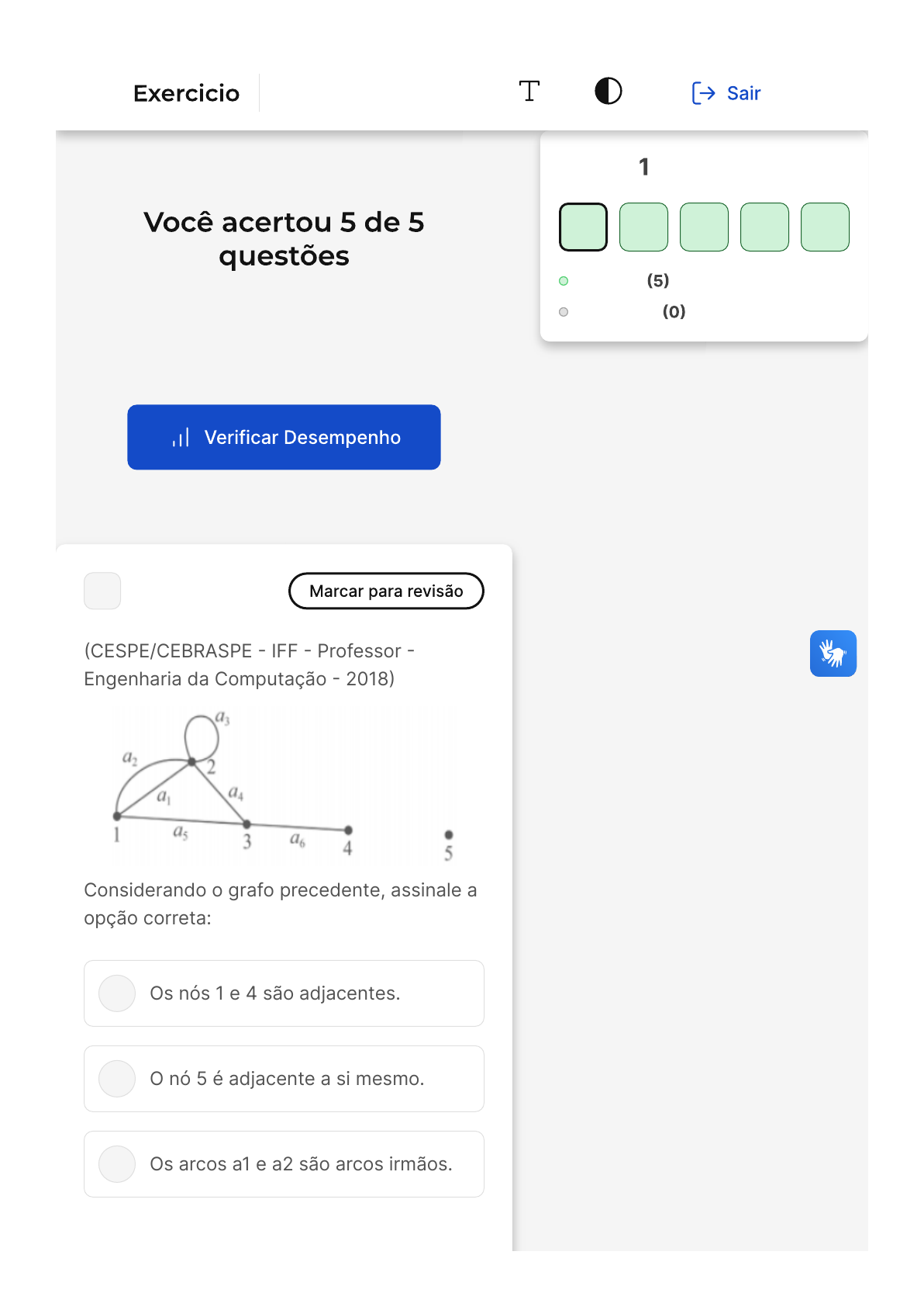Verifique o seu desempenho e continue treinando! Você pode refazer o exercício quantas vezes quiser. A B C 1 �CESPE/CEBRASPE � IFF � Professor � Engenharia da Computação � 2018� Considerando o grafo precedente, assinale a opção correta: Os nós 1 e 4 são adjacentes. O nó 5 é adjacente a si mesmo. Os arcos a1 e a2 são arcos irmãos. Questão de 5 Corretas Em branco 1 2 3 4 5 Algoritmos Em Grafos (crédito Digital) Firefox https://estacio.saladeavaliacoes.com.br/exercicio/664aa01590533ffb8... 1 of 8 19/05/2024, 21:59 D E Os nós 2 e 3 têm grau 3. O grafo não pode ser classificado como conexo. Parabéns, você selecionou a alternativa correta. Confira o gabarito comentado! Resposta correta: O grafo não pode ser classificado como conexo. 2 �COMPERVE � UFRN � Engenheiro � Engenharia da Computação � 2019� O código abaixo pode ser utilizado para atravessar um grafo: Entrada: um gráfico G e um vértice v de G Saída: todos os vértices alcançáveis de v marcados função DFS(G,v): marque v para todas as arestas adjacentes a v, faça se vértice w não estiver marcado, Firefox https://estacio.saladeavaliacoes.com.br/exercicio/664aa01590533ffb8... 2 of 8 19/05/2024, 21:59 A B C D E então Chame recursivamente DFS(G,w) fim se fim para fim função Entre os diversos tipos de algoritmos utilizados para atravessar grafos, esse código implementa o algoritmo: Busca em profundidade ou depth first search. Busca em largura ou breadth first search. Busca melhor-primeiro ou best first search. Busca exaustiva ou brute force search. Busca pelo caminho mínimo (shortest path). Parabéns, você selecionou a alternativa correta. Confira o gabarito comentado! O código apresentado no enunciado é Firefox https://estacio.saladeavaliacoes.com.br/exercicio/664aa01590533ffb8... 3 of 8 19/05/2024, 21:59 A B C D uma implementação do algoritmo de busca em profundidade, também conhecido como depth first search �DFS�. Esse algoritmo é caracterizado por explorar completamente um vértice antes de passar para o próximo. Ele marca o vértice inicial, e então, para cada aresta adjacente a esse vértice, se o vértice adjacente não estiver marcado, o algoritmo é chamado recursivamente para esse vértice. Portanto, a alternativa correta é a "Busca em profundidade ou depth first search". 3 �CS�UFG � Fundação Unirg � Analista de Sistemas � 2017� Seja S o grafo de fluxo de controle de um programa P. Se o teste que aplica um conjunto de dados de teste satisfaz o critério todos os ramos de S, então pode-se concluir que esse conjunto também irá satisfazer o critério: Todos os caminhos de P. Todas as respostas de P. Todos os comandos de P. Todas as classes de P. Firefox https://estacio.saladeavaliacoes.com.br/exercicio/664aa01590533ffb8... 4 of 8 19/05/2024, 21:59 E Todos os predicados de P. Parabéns, você selecionou a alternativa correta. Confira o gabarito comentado! O critério "todos os ramos" é um critério de cobertura de teste que exige que cada ramo (ou caminho de decisão) em um programa seja executado pelo menos uma vez. Se um conjunto de dados de teste satisfaz este critério, significa que todos os possíveis caminhos de decisão foram testados. Portanto, pode-se concluir que todos os comandos do programa também foram executados, pois cada comando está associado a um ou mais ramos no grafo de fluxo de controle. Assim, a alternativa correta é "Todos os comandos de P". 4 �FCM � IFN�MG � Ciências da Computação: Teoria da Computação � 2018� Considere o grafo abaixo assim como sua representação por lista de adjacência: Firefox https://estacio.saladeavaliacoes.com.br/exercicio/664aa01590533ffb8... 5 of 8 19/05/2024, 21:59 A B C D A Árvore em Largura e a Árvore em Profundidade, respectivamente, tendo como raiz o vértice 1, são: Firefox https://estacio.saladeavaliacoes.com.br/exercicio/664aa01590533ffb8... 6 of 8 19/05/2024, 21:59 E Parabéns, você selecionou a alternativa correta. Confira o gabarito comentado! Resposta correta: 5 Na otimização de rotas de entrega, é vital determinar o caminho mais eficiente entre múltiplos pontos. Utilizando grafos, pode-se modelar esta questão para minimizar custos e tempo. Qual algoritmo é preferencialmente utilizado para determinar o caminho mais curto em um grafo representando rotas de entrega? Firefox https://estacio.saladeavaliacoes.com.br/exercicio/664aa01590533ffb8... 7 of 8 19/05/2024, 21:59 A B C D E Algoritmo de Floyd-Warshall. Algoritmo de Prim. Busca em Largura. Coloração de grafos. Algoritmo de Dijkstra. Parabéns, você selecionou a alternativa correta. Confira o gabarito comentado! O Algoritmo de Dijkstra é preferencialmente utilizado para determinar o caminho mais curto em um grafo que representa rotas de entrega, pois calcula o caminho de menor custo entre um vértice de origem e todos os outros vértices no grafo, sendo ideal para a otimização de rotas. Firefox https://estacio.saladeavaliacoes.com.br/exercicio/664aa01590533ffb8... 8 of 8 19/05/2024, 21:59
