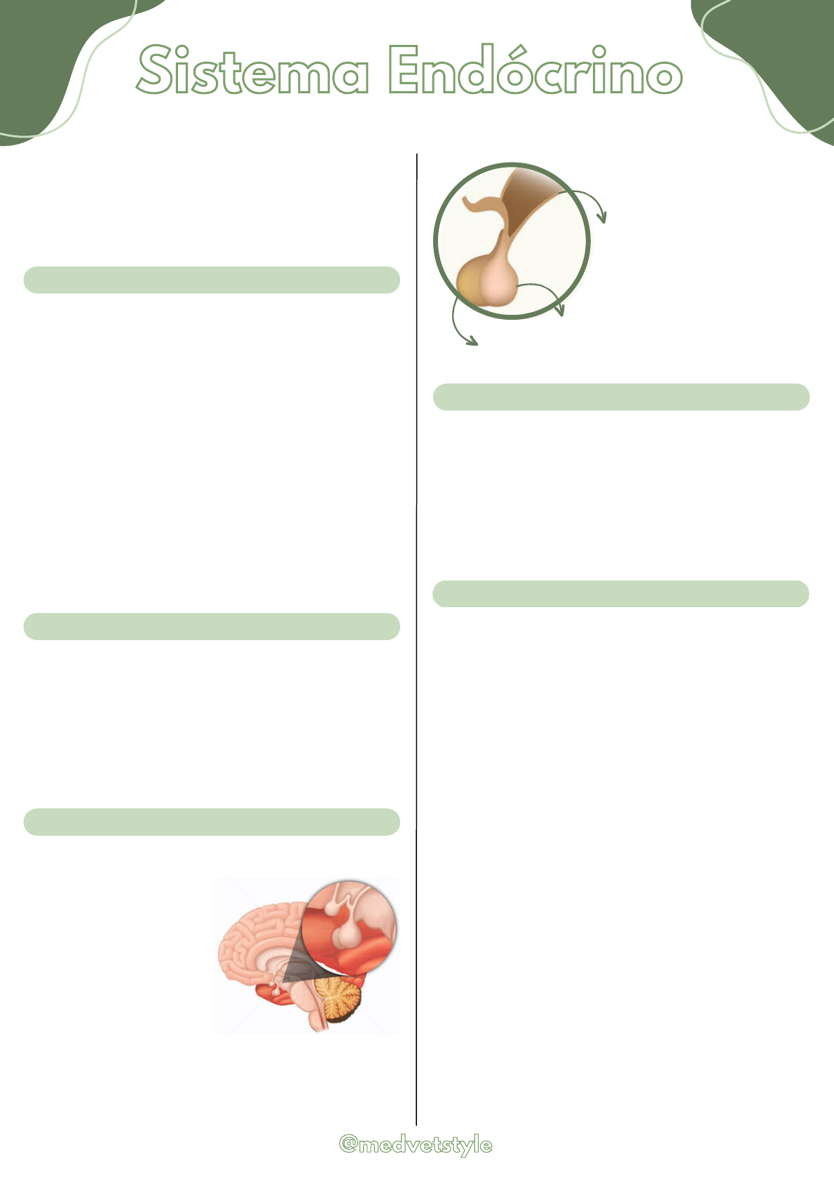 Sistema EndócrinoSistema Endócrino Sistema neuroendócrino, responsável pelos processos fisiológicos que necessitam ser controlados. O sistema nervoso libera neuroreceptores enquanto o sistema endócrino libera os mediadores químicos, ou seja, os hormônios. Ele exerce o controle do metabolismo, crescimento e reprodução. Produção dos hormônios Os hormônios são produzidos por células parenquimais encontradas nos epitélios dos órgãos receptores (ex: trato gastrointestinal, parede dos brônquios e uretra, rins e miocárdio). Elas são organizadas em órgãos endócrinos (hipófise, tireoide, glândula pineal, glândula suprarrenal).. Alguns desses órgãos possuem funções tanto exócrinas quanto endócrinas como é o exemplo do testículo, ovário, pâncreas e placenta. Outros apresentam uma função endócrina secundária à sua função principal como é o caso do rim, fígado e timo. ➯ Função exócrina: as glândulas exócrinas secretam as suas substâncias em outros órgãos ou para o exterior corporal. Exemplo: sudoríparas (secretam suor), mamárias (secretam leite), salivares (liberam saliva). ➯ Função endócrina: as glândulas endócrinas liberam suas substâncias na circulação sanguínea logo sendo transportadas para os órgãos. ➯ Função mista: ao mesmo tempo é exócrino e endócrino. Controle do hormônios O controle ocorre para que as concentrações de hormônios fiquem dentro dos parâmetros normais para garantir as funções fisiológicas. Controle por feedback: impede a hiperatividade, acontece com os hormônios tróficos da hipófise. Os padrões secretórios podem sofrer variações durante o tempo de 24 horas, gerando um ritmo circadiano. Alguns fatores que alteram são o sono e a luz. Hipófise Glândula hipófise ou “glândula-mestre”, desempenha função reguladora em todo o sistema endócrino. Localizada no diencéfalo. Neuro-hipófise: possui função de armazenar e liberar os hormônios ociItocina e ADH. Adeno-hipófise: produz e libera os hormônios GH, ACTH, TSH, FSH e Prolactina. Sua função é transportar e manter regulado os hormônios de todas as glândulas endócrinas. HIPOTÁLAMO NEURO-HIPÓFISE ADENO-HIPÓFISE Hormônios da neuro-hipófise OCITOCINA Sua função é promover as contrações musculares uterinas durante o parto e a ejeção do leite durante a amamentação. VASOPRESSINA (ADH) Hormônio antidiurético, sua função é a homeostase de líquidos corpóreos e a vasoconstrição ou vasodilatação dos vasos para o controle da pressão arterial. Hormônios da adeno-hipófise TIREOESTIMULANTE (TSH) Sua função é regular a quantidade de triiodotironina (T3) e tiroxina (T4), garantindo que os hormônios produzidos pela glândula tireoide não sejam insuficientes nem excessivos para o metabolismo. ADRENOCORTICOTRÓFICO (ACTH) Sua função é estimular o córtex da adrenal a liberar o cortisol (hormônio do estresse, regulador do metabolismo, reduz a inflamação e contribui para o funcionamento do sistema imune). FOLÍCULOESTIMULANTE (FSH) Sua função é regular a produção de espermatozoides e a maturação dos óvulos durante a idade fértil. Além de regular o crescimento, puberdade, reprodução e secreção de hormônios sexuais pelos testículos (testosterona) e ovários (progesterona). LUTEINIZANTE (LH) Ele está presente durante o ciclo menstrual e promove o rompimento dos folículos, estruturas que contém os óvulos. Responsável pelo amadurecimento dos folículos, ovulação e produção de progesterona e testosterona. PROLACTINA Ele está presente durante o ciclo menstrual e tem a função de preparar o corpo para a gestação já que mudanças hormonais podem dificultar a fertilização. @medvetstyle@medvetstyle https://vestibulares.estrategia.com/portal/biologia/a-configuracao-anatomica-do-sistema-circulatorio-humano/ Glândula Pineal Glândula pineal é responsável pelo ciclo do sono, regulação de esforços sexuais e reprodução. Ela produz melatonina, hormônio para indução do sono e regulação do metabolismo durante o período de descanso. A melatonina tem efeitos gonadotróficos que são importantes para a sazonalidade dos ciclos reprodutivos em determinadas espécies, como o equino e o ovino. Portanto, a glândula pineal funciona como um “relógio biológico” que regula a variação sazonal e diurna da atividade gonadal. No equino, a produção de melatonina é inibida pelo fotoperíodo, de forma que o aumento das horas de luz diária faz a produção de melatonina diminuir e seu efeito inibitório na atividade gonadal ficar reduzido (ciclo circadiano). CRESCIMENTO (GH) Responsável pelo crescimento físico e celular. Glândula tireoide Os hormônios produzidos pela glândula tireoide regulam a taxa metabólica, o crescimento, a temperatura corporal, o metabolismo de carboidratos e os níveis de cálcio no corpo. A atividade secretora da glândula tireoide é regulada pela tireotrofina (TSH), um hormônio da adeno-hipófise. O hipertireoidismo leva a um aumento no metabolismo, e os animais parecem inquietos e nervosos, às vezes até mesmo agressivos. Já o hipotireoidismo faz o organismo diminuir o metabolismo, o crescimento e a atividade. As células parafoliculares, ou células C, produzem calcitonina, um hormônio que diminui a concentração de cálcio no sangue e, portanto, atua como antagonista para o hormônio paratireóideo. Glândulas paratireoides As glândulas paratireoides produzem o paratormônio, o qual regula as concentrações séricas de cálcio e fósforo ao regular o metabolismo no interior dos ossos, a absorção do trato gastrointestinal e a excreção da urina. Glândulas suprarrenais O córtex suprarrenal produz hormônios, denominados corticoides, que regulam o equilíbrio mineral e o metabolismo dos carboidratos. A atividade do córtex suprarrenal é regulada pelo hormônio adrenocorticotrófico da adeno-hipófise (ACTH). A medula suprarrenal produz os neur