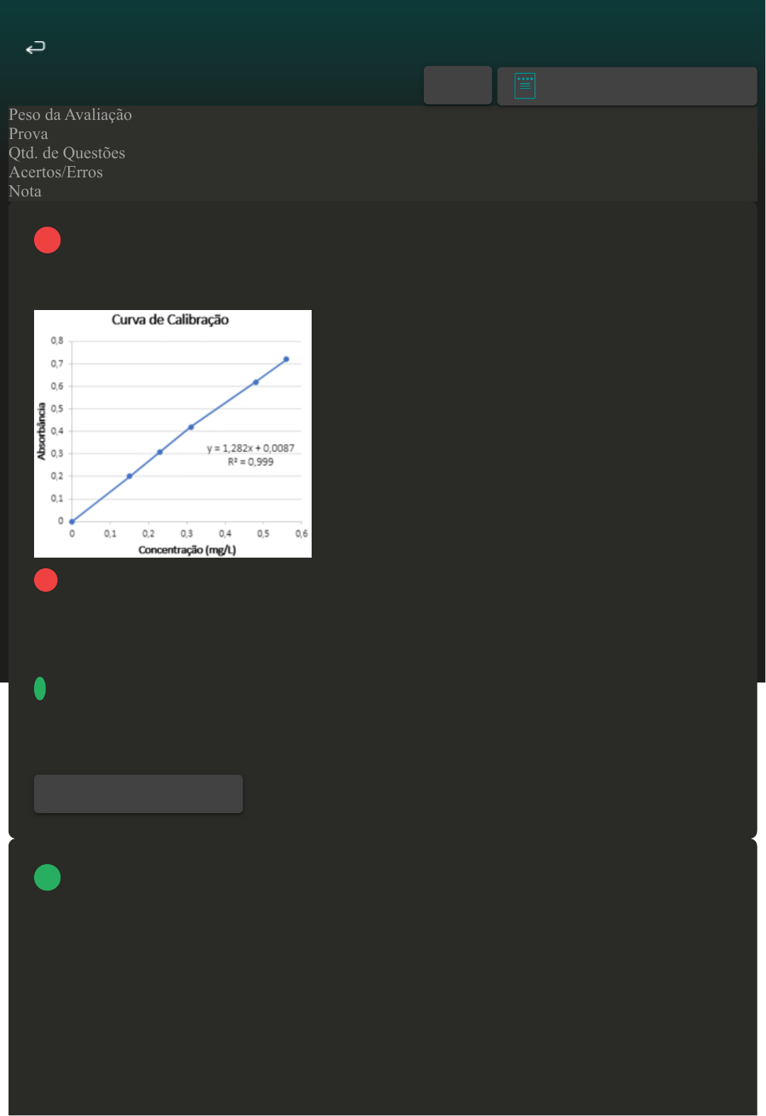 Prova Impressa GABARITO | Avaliação I - Individual (Cod.:958431) Peso da Avaliação 2,00 Prova 81557273 Qtd. de Questões 10 Acertos/Erros 8/2 Nota 8,00 Ao obter experimentalmente dados suficientes para elaborar uma curva de calibração é possível obter a equação da reta desta curva. Através desta equação, pode-se através de qualquer valor de leitura de um método instrumental determinar a concentração ou a massa de analito de uma amostra. Considerando a imagem apresentada, assinale a alternativa CORRETA: A Para um valor de absorbância de 0,85, teremos uma concentração de 1,09 mg/L. B Quanto mais próximo de um (1) for o valor de R, chamado de coeficiente de correlação de Pearson, menor será a relação linear entre os eixos x e y. C A curva de calibração obtida indica que a relação entre as duas variáveis, apresenta uma tendência de proporcionalidade, ou seja, conforme aumenta a concentração em mg/L do analito haverá um aumento da absorbância. D Para a função obtida com o gráfico [y = 1,282.x + 0,0087], x representa a absorbância medida pelo instrumento e y representa a concentração em mg/L. A Química Analítica Quantitativa tem por objetivo a determinação da quantidade de um ou mais componentes de uma amostra. Essa determinação pode ser crucial em certas situações, como, por exemplo, ao se analisar a presença e a quantidade de metais pesados em água. Considerando a importância das determinações em analítica, analise as sentenças a seguir: I- Os métodos clássicos de análise foram as primeiras técnicas de análise quantitativa. II- O uso de métodos clássicos de análise envolve o uso de reagentes de alto custo. III- Os métodos clássicos envolvem procedimentos manuais. IV- Uma das desvantagens do uso dos métodos clássicos é sua baixa sensibilidade na determinação do analito. Assinale a alternativa CORRETA: VOLTAR A+ Alterar modo de visualização 1 Revisar Conteúdo do Livro 2 A As sentenças II e III estão corretas. B As sentenças I e IV estão corretas. C As sentenças I, III e IV estão corretas. D As sentenças I e II estão corretas. [Laboratório Virtual - Reação de Neutralização Ácido-Base] A relação estequiométrica num processo de titulação é essencial na hora de determinar a concentração de certa espécie química presente numa amostra. Dessa forma, considere as reações que são apresentadas a seguir e assinale a alternativa CORRETA que apresenta a reação que ocorre durante o processo de titulação deste laboratório virtual: A Somente a reação II está correta. B Somente a reação III está correta. 3 C Somente a reação I está correta. D Somente a reação IV está correta. A química analítica é uma ciência de medição que consiste em um conjunto de ideias e métodos poderosos que são úteis em todos os campos da ciência e medicina. Ao considerar o funcionamento das análises realizadas por esta área, é importante que tenhamos conhecimentos de alguns conceitos. Sobre o exposto, associe os itens, utilizando o código a seguir: I- Amostra. II- Analito. III- Matriz. ( ) Espécie química que está presente na amostra a qual se deseja qualificar (conhecer a identidade) e quantificar (conhecer a quantidade). ( ) Porção representativa retirada de um todo através do processo de amostragem. A representatividade desta parte é comprovada pela similaridade da porção retirada com o todo. ( ) A soma de todos os componentes da amostra (analito + outras substâncias). Assinale a alternativa que apresenta a sequência CORRETA: FONTE: SKOOG, Douglas et al. Fundamentos de Química Analítica. 8. ed. São Paulo: Thomson, 2006. A II - I - III. B I - III - II. C III - II - I. D I - II - III. [Laboratório Virtual - Reação de Neutralização Ácido-Base] - Ao iniciar uma prática, seja ela num laboratório físico ou virtual, alguns passos iniciais são importantes. Considerando sua preparação para iniciar a prática virtual de Reação de Neutralização Ácido-Base, assinale a alternativa CORRETA: A Antes de iniciar a prática descrita, é necessário vestir os EPIs, que neste caso serão jaleco, óculos de proteção e máscara. Revisar Conteúdo do Livro 4 5 B Nesta prática, é necessário vestir o jaleco, os óculos de proteção e a luva de látex como equipamentos de proteção individual e posteriormente colocar sobre a bancada todas as vidrarias e substâncias que serão utilizadas. C Antes de iniciar a prática descrita, é necessário vestir os EPIs, que neste caso serão jaleco, máscara e luvas de látex. D Para iniciar a prática, não há necessidade de colocar sobre a bancada vidrarias e substâncias que serão utilizadas, sendo que todas elas já estão posicionadas. "Exatidão e precisão são aspectos diferentes, mas fundamentais, que precisam ser levados em consideração quando desejamos avaliar a qualidade do resultado de uma medição". Com base na exatidão e precisão, assinale a alternativa CORRETA: FONTE: . Acesso em: 29 abr. 2021. A A exatidão se refere à repetição de uma medida, independente de ela estar próxima ou não do "valor real". B A precisão se refere a aproximação de uma medida de um "valor real". C Em um experimento realizado em laboratório o valor esperado para concentração de elemento X em uma amostra era de 0,050 g/mL. Porém os valores obtidos foram 0,510 g/mL, 0,520 g/mL e 0,513 g/mL. Os dados obtidos são precisos e inexatos. D Obrigatoriamente, para que uma medida seja considerada precisa, ela deve apresentar também exatidão nos resultados. O tratamento estatístico dos dados é essencial numa análise quantitativa, sendo assim é importante considerarmos o uso de notação científica, visto que muitas vezes trabalhamos com números extremamente pequenos. Com base na notação científica, analise as sentenças a seguir: I- Notação é uma maneira de escrevermos números muito grandes ou muito pequenos de uma maneira mais simples. II