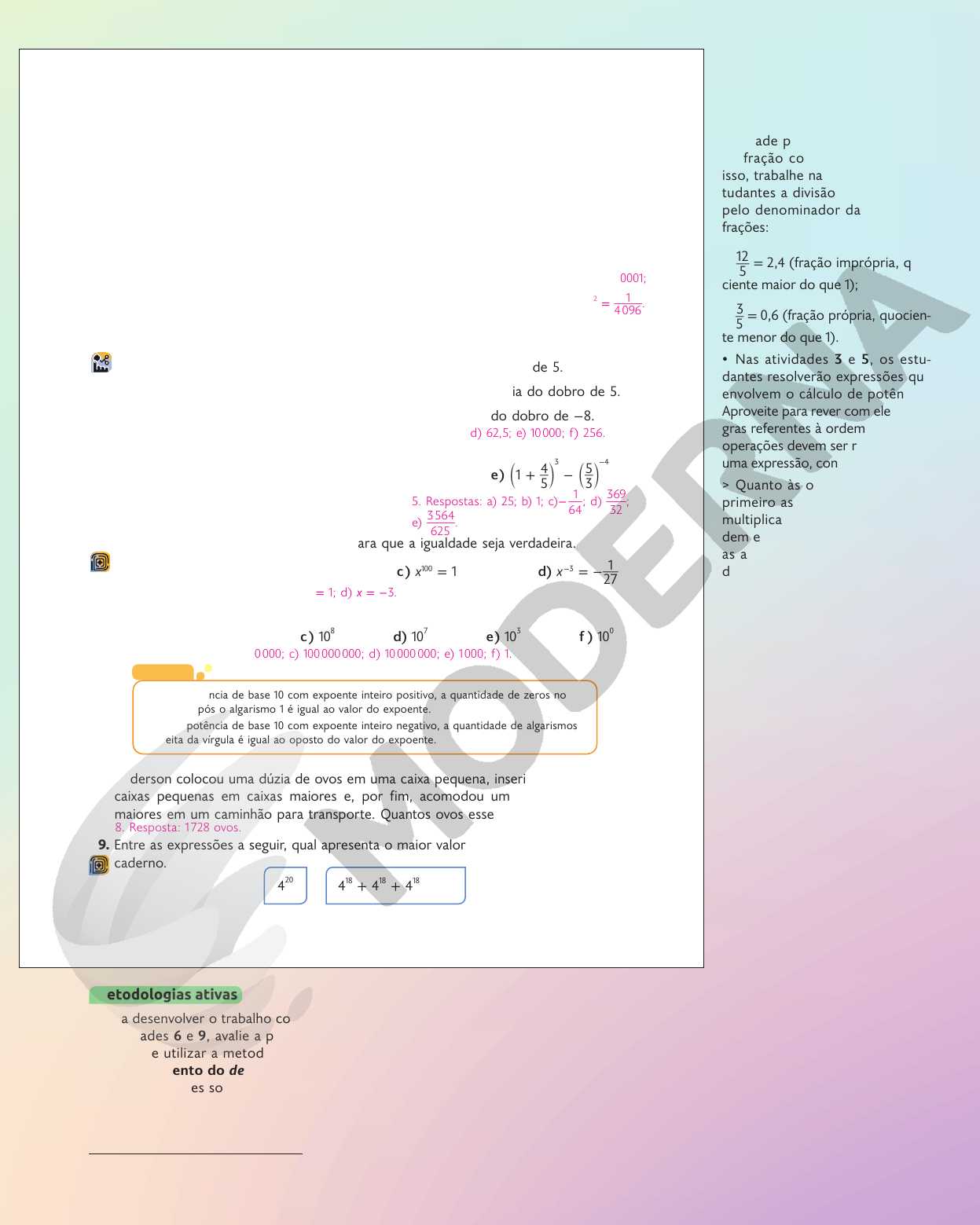 R ep ro du çã o pr oi bi da . A rt . 1 84 d o C ód ig o Pe na l e L ei 9 .6 10 d e 19 d e fe ve re iro d e 19 98 . 23 2. A seguir, identifique quais potências são maiores do que 1. a ) (8) −5 b ) ( 4 _ 3 ) −3 c ) ( 2 _ 9 ) −2 d ) ( 11 _ 15 ) −1 e ) ( 7 _ 3 ) −4 f ) ( 15 _ 14 ) −2 3. Usando as propriedades das potências, calcule. a ) 2 5 ⋅ 2 3 b ) (− 8) 21 ⋅ (− 8) −18 c ) ( 4 _ 3 ) ⋅ ( 4 _ 3 ) 2 d ) (− 3) 2 ⋅ ( 1 _ 2 ) 2 e ) (10) −2 : (10) 3 f ) ( 3 _ 2 ) 3 : ( 6 _ 5 ) 3 g ) ( 4 2 ) 3 h ) ( 2 −3 ) 4 4. Com o auxílio de uma calculadora, calcule: a ) o produto entre (− 3) 2 e (− 3) 7 . b ) o quociente entre 11 −8 e 11 −5 . c ) o cubo da metade de 5. d ) a metade do cubo de 5. e ) a quarta potência do dobro de 5. f ) o quadrado do dobro de − 8 . 5. Resolva as expressões em cada item. a ) ( 2 2 ⋅ 5 2 ) : 4 1 b ) 16 3 : (− 8) 4 + 15 0 − (1) 11 c ) 4 −3 + (− 1 _ 2 ) 5 d ) ( 8 _ 3 ) −2 + ( 9 _ 4 ) 3 e ) (1 + 4 _ 5 ) 3 − ( 5 _ 3 ) −4 6. Em cada item, determine o valor de x para que a igualdade seja verdadeira. a ) (− 3) x = − 243 b ) ( 11 _ 7 ) x = 1 c ) x 100 = 1 d ) x −3 = − 1 _ 27 7. Calcule. a ) 10 2 b ) 10 5 c ) 10 8 d ) 10 7 e ) 10 3 f ) 10 0 8. Anderson colocou uma dúzia de ovos em uma caixa pequena, inseriu uma dúzia dessas caixas pequenas em caixas maiores e, por fim, acomodou uma dúzia dessas caixas maiores em um caminhão para transporte. Quantos ovos esse caminhão transportou? 9. Entre as expressões a seguir, qual apresenta o maior valor? Justifique a resposta em seu caderno. Em uma potência de base 10 com expoente inteiro positivo, a quantidade de zeros no resultado após o algarismo 1 é igual ao valor do expoente. Em uma potência de base 10 com expoente inteiro negativo, a quantidade de algarismos à direita da vírgula é igual ao oposto do valor do expoente. Atenção! 4 20 4 18 + 4 18 + 4 18 + 4 18 2. Resposta: Alternativas c e d. 3. Respostas: a) 2 8 = 256 ; b) (− 8) 3 = − 512 ; c) ( 4 _ 3 ) 3 = 64 _ 27 ; d) ( 3 _ 2 ) 2 = 9 _ 4 ; e) 10 −5 = 0,00001 ; 4. Respostas: a) − 19683 ; b) Aproximadamente 0,00075; c) 15,625; d) 62,5; e) 10000 ; f) 256. 5. Respostas: a) 25; b) 1; c) − 1 _ 64 ; d) 369 _ 32 ; e) 3564 _ 625 . 6. Respostas: a) x = 5 ; b) x = 0 ; c) x = 1 ; d) x = − 3 . 7. Respostas: a) 100; b) 100000 ; c) 100000000 ; d) 10000000 ; e) 1000 ; f) 1. 8. Resposta: 1728 ovos. 9. Resposta: 4 20 , pois 4 20 > 4 1 ⋅ 4 18 . f) ( 5 _ 4 ) 3 = 125 _ 64 ; g) 4 6 = 4096 ; h) 2 −12 = 1 _ 4096 . 23 • A atividade 2 envolve o reconhe- cimento de frações impróprias (nu- merador maior que o denomina- dor) como equivalentes a números maiores do que 1. Aproveite esta atividade para rever o significado de fração como quociente. Para isso, trabalhe na lousa com os es- tudantes a divisão do numerador pelo denominador das seguintes frações: 12 _ 5 = 2,4 (fração imprópria, quo- ciente maior do que 1); 3 _ 5 = 0,6 (fração própria, quocien- te menor do que 1). • Nas atividades 3 e 5, os estu- dantes resolverão expressões que envolvem o cálculo de potências. Aproveite para rever com eles as re- gras referentes à ordem em que as operações devem ser resolvidas em uma expressão, conforme segue. > Quanto às operações: resolver primeiro as potências; depois, as multiplicações ou divisões, na or- dem em que aparecerem; por fim, as adições ou subtrações, na or- dem em que aparecerem. > Quanto aos sinais de associação: resolver primeiro as operações que estiverem dentro dos parênteses; depois, as operações que estive- rem dentro dos colchetes; por fim, as operações que estiverem dentro das chaves. • A atividade 4 explora a tradução de expressões em linguagem ma- terna para a linguagem matemáti- ca, abordando, assim, aspectos da Competência específica de Ma- temática 6. Se julgar conveniente, proponha aos estudantes outros itens semelhantes aos apresentados. • Ao trabalhar com o item a da ativi- dade 6, oriente os estudantes a fato- rar o número 243 em fatores primos. Por meio dessa fatoração, é possível concluir que − 234 = (− 3) 5 , sabendo que 243 = 3 ⋅ 3 ⋅ 3 ⋅ 3 ⋅ 3 e 243 = 3 5 . Já no item d, oriente-os a fatorar o denominador da fração (27) em fa- tores primos. No caso do item b, se necessário, retome as definições ex- postas no final da página 20. Para desenvolver o trabalho com as atividades 6 e 9, avalie a possi- bilidade de utilizar a metodologia ativa Pensamento do design. Ob- tenha informações sobre essa me- todologia no tópico Metodologias e estratégias ativas, nas orienta- ções gerais deste manual. Metodologias ativas • A atividade 7 envolve cálculos de potência de base 10. Apro- veite para ressaltar a multiplicação de números reais por 10, 100 e 1000. • A atividade 8 requer que os estudantes interpretem uma situação cotidiana e utilizem a potenciação (ou a multiplicação de fatores iguais) para solucionar um problema. Se for neces- sário, proponha leitura e resolução conjuntas. • Na atividade 9, espera-se que os estudantes usem a noção de que a multiplicação é uma adição de parcelas iguais. Se julgar necessário, conclua com eles que: 4 18 + 4 18 + 4 18 + 4 18 = 4 ⋅ 4 18 R ep ro du çã o pr oi bi da . A rt . 1 84 d o C ód ig o Pe na l e L ei 9 .6 10 d e 19 d e fe ve re iro d e 19 98 . 24 Imagem com elementos não proporcionais entre si. 10. Leia as informações a seguir. B.A. AL O N ES /S H U TT ER ST O C K PI CT U RE G U Y/ SH U TT ER ST O C K Para reduzir a quantidade de algarismos em números muito grandes, ou muito pequenos, podemos indicá-los usando a notação científica. Os números anteriores, por exemplo, podem ser representados da seguinte maneira. Os números escritos em notação científica devem ter a forma a ⋅ 10 n , sendo: a: um número maior ou igual a 1 e menor do que 10. n: um número inteiro. Atenção! Represente os números destacados nas informações a seguir 