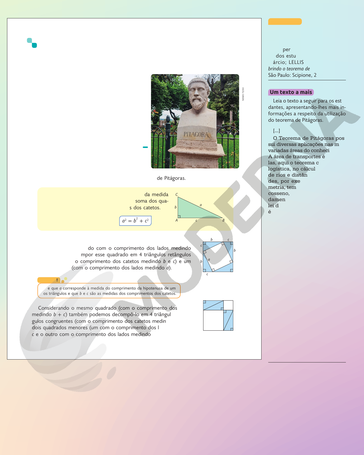 b b b b a a c c c c C b a cA B b ca a c b c b b c R ep ro du çã o pr oi bi da . A rt . 1 84 d o C ód ig o Pe na l e L ei 9 .6 10 d e 19 d e fe ve re iro d e 19 98 . 123 Teorema de Pitágoras Além das relações métricas estudadas até aqui, existe outra envolvendo as medidas dos comprimentos dos lados de um triângulo retângulo, chamada teorema de Pitágoras. Esse nome homenageia o matemático e filósofo grego Pitágoras. Pitágoras nasceu na ilha de Samos, no Mar Egeu, por volta de 572 a.C. Em Crotona, na Magna Grécia – costa sudeste do que agora é a Itália –, fundou a escola pitagórica, que consistia em um centro de estudos de Matemática, Filosofia e Ciên- cias naturais. Fonte de pesquisa: EVES, Howard. Introdução à História da Matemática. Tradução: Hygino H. Domingues. Campinas: Editora da Unicamp, 2004. Busto de Pitágoras. Escultura no parque Villa Borghese, em Roma, na Itália, em 2021. Agora, enunciaremos e demonstraremos o teorema de Pitágoras. Demonstração Considere um quadrado com o comprimento dos lados medindo b + c . Podemos decompor esse quadrado em 4 triângulos retângulos congruentes (com o comprimento dos catetos medindo b e c) e um quadrado menor (com o comprimento dos lados medindo a). Note que a corresponde à medida do comprimento da hipotenusa de um dos triângulos e que b e c são as medidas dos comprimentos dos catetos. Atenção! a 2 = b 2 + c 2 Em todo triângulo retângulo, o quadrado da medida do comprimento da hipotenusa é igual à soma dos qua- drados das medidas dos comprimentos dos catetos. N EM O 7 3/ SH U TT ER ST O C K IL U ST RA ÇÕ ES : R AF AE L L. G AI O N / AR Q U IV O D A ED IT O RA Considerando o mesmo quadrado (com o comprimento dos lados medindo b + c ) também podemos decompô-lo em 4 triângulos retân- gulos congruentes (com o comprimento dos catetos medindo b e c) e dois quadrados menores (um com o comprimento dos lados medindo c e o outro com o comprimento dos lados medindo b). 123 No livro a seguir, são abordadas questões relacionadas ao teorema de Pitágoras de maneira divertida, o que permite instigar a curiosida- de dos estudantes: IMENES, Luiz Márcio; LELLIS, Marcelo. Desco- brindo o teorema de Pitágoras. 2. ed. São Paulo: Scipione, 2000. Algo a mais Leia o texto a seguir para os estu- dantes, apresentando-lhes mais in- formações a respeito da utilização do teorema de Pitágoras. [...] O Teorema de Pitágoras pos- sui diversas aplicações nas mais variadas áreas do conhecimento. A área de transportes é uma de- las, aqui o teorema contribui na logística, no cálculo de largura de rios e distâncias entre cida- des, por exemplo. Na trigono- metria, temos o cálculo de seno, cosseno, tangente, relação fun- damental da trigonometria e a lei dos cossenos. Na geometria, é utilizado para o cálculo da dia- gonal do quadrado, cálculo da al- tura do triângulo equilátero, são calculadas distâncias: é possível realizar levantamentos topográ- ficos através de uma triangula- ção. Na Física, para cálculo de grandezas escalares e vetoriais e na Biologia, na representação ge- ométrica dos desenhos mostran- do as proporções entre homens e animais e na contagem de fra- ções de medicamentos, usando, por exemplo, o conta-gotas. Na aeronáutica, tais conceitos são aplicados para que não haja coli- sões em rotas de aviões. [...] SOUZA, Maria Cristina Gerino Campos de. Conhecendo, demonstrando e aplicando o Teorema de Pitágoras. 2013. p. 5-6. Disponível em: http://www.diaadiaeducacao.pr.gov.br/ portals/cadernospde/pdebusca/producoes_ pde/2013/2013_fafipa_mat_artigo_maria_ cristina_gerino_campos_de_souza.pdf. Acesso em: 21 jul. 2022. Um texto a mais http://www.diaadiaeducacao.pr.gov.br/portals/cadernospde/pdebusca/producoes_pde/2013/2013_fafipa_mat_artigo_maria_cristina_gerino_campos_de_souza.pdf http://www.diaadiaeducacao.pr.gov.br/portals/cadernospde/pdebusca/producoes_pde/2013/2013_fafipa_mat_artigo_maria_cristina_gerino_campos_de_souza.pdf http://www.diaadiaeducacao.pr.gov.br/portals/cadernospde/pdebusca/producoes_pde/2013/2013_fafipa_mat_artigo_maria_cristina_gerino_campos_de_souza.pdf http://www.diaadiaeducacao.pr.gov.br/portals/cadernospde/pdebusca/producoes_pde/2013/2013_fafipa_mat_artigo_maria_cristina_gerino_campos_de_souza.pdf A B Cx 16 cm 12 cm F D E y 18 cm 30 cm 12 cm 5 cm 13 cm R ep ro du çã o pr oi bi da . A rt . 1 84 d o C ód ig o Pe na l e L ei 9 .6 10 d e 19 d e fe ve re iro d e 19 98 . 124 Cada quadrado inicial tem área medindo (b + c) 2 . Retirando os 4 triângulos retângulos congruentes de cada quadrado, obtemos figuras com medidas de áreas iguais. a 2 = b 2 + c 2 Assim, demonstramos o teorema de Pitágoras. Existem várias demonstrações do teorema de Pitágoras. No caderno, utilizando as relações métricas b 2 = a ⋅ m e c 2 = a ⋅ n , faça a demonstração desse teorema. Agora, utilizando o teorema de Pitágoras, acompanhe como podemos obter os valores de x e y nos triângulos a seguir. Questão 2. RA FA EL L . G AI O N / AR Q U IV O D A ED IT O RA a = x b = 16 cm c = 12 cm a 2 = b 2 + c 2 x 2 = 16 2 + 12 2 x 2 = 256 + 144 x 2 = 400 x = 20 Portanto, x = 20 cm . a = 30 cm b = y c = 18 cm a 2 = b 2 + c 2 30 2 = y 2 + 18 2 900 = y 2 + 324 900 − 324 = y 2 576 = y 2 y = 24 Portanto, y = 24 cm . A recíproca do teorema de Pitágoras também é válida. Em um triângulo, se o quadrado da medida do comprimento de um lado for igual à soma dos quadrados das medidas dos comprimentos dos outros dois lados, então trata-se de um triângulo retângulo. O triângulo indicado ao lado é um triângulo retângulo? No caderno, justifique sua resposta. Questão 3. IL U ST RA ÇÕ ES : R AF AE L L. G AI O N / AR Q U IV O D A ED IT O RA Questão 2. Resposta na seção Resoluções. Questão 3. Resposta: Sim, pois 13 2 = 5 2 + 12 2 . 124 • A questão 2 possibilita desen- volver a habilidade EF09MA13 ao solicitar aos estudantes que de- monstrem, utilizando as relaçõe
