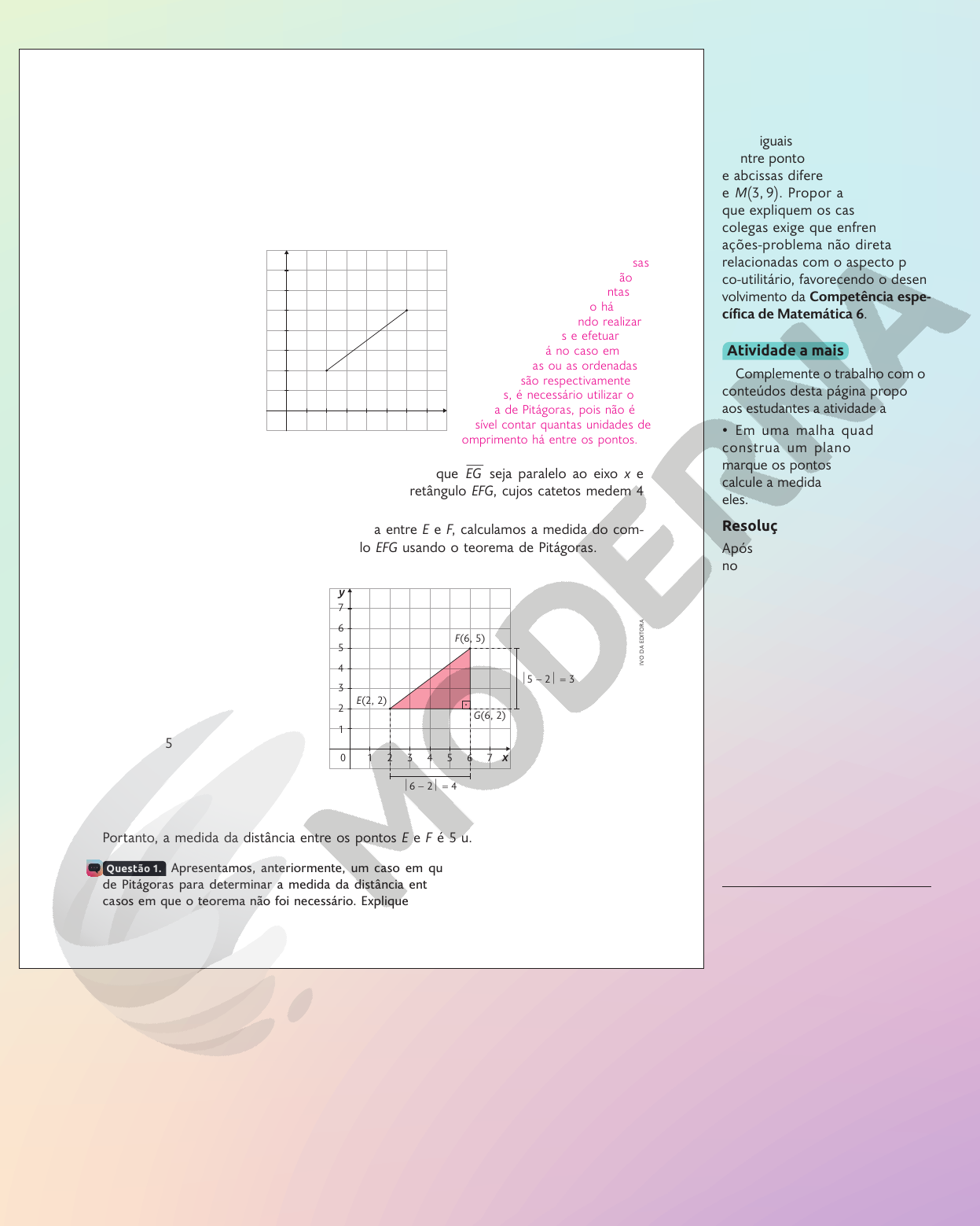 0 2 2 1 1 3 3 4 5 4 5 6 7 6 7 y x E(2, 2) F(6, 5) 0 2 2 1 1 3 3 4 5 4 5 6 7 6 7 y x E(2, 2) F(6, 5) G(6, 2) 6 − 2 = 4 5 − 2 = 3 153 R ep ro du çã o pr oi bi da . A rt . 1 84 d o C ód ig o Pe na l e L ei 9 .6 10 d e 19 d e fe ve re iro d e 19 98 . Como exemplo, vamos calcular a medida da distância entre os pontos E(2, 2) e F(6, 5) no plano cartesiano. Para isso, vamos construir inicialmente um plano cartesiano na malha quadriculada, indicar esses pontos e traçar o segmento EF, cuja medida do comprimento é igual à medida da distância entre os pontos E e F. Note que não é possível contar quantas unidades de comprimento há entre E e F, mas podemos determinar quantas unidades têm a projeção de ‾ EF no eixo x e no eixo y. Indicando no plano cartesiano o ponto G, de forma que ‾ EG seja paralelo ao eixo x e que ‾ GF seja paralelo ao eixo y, obtemos o triângulo retângulo EFG, cujos catetos medem 4 e 3 unidades de comprimento. Assim, para determinar a medida da distância entre E e F, calculamos a medida do com primento da hipotenusa do triângulo retângulo EFG usando o teorema de Pitágoras. Portanto, a medida da distância entre os pontos E e F é 5 u.c. Apresentamos, anteriormente, um caso em que foi necessário utilizar o teorema de Pitágoras para determinar a medida da distância entre dois pontos no plano cartesiano e casos em que o teorema não foi necessário. Explique a um colega por que isso ocorreu. Questão 1. (EF) 2 = (EG) 2 + (GF) 2 (EF) 2 = 4 2 + 3 2 (EF) 2 = 25 EF = √ _ 25 EF = 5 IL U ST RA ÇÕ ES : G U ST AV O C O N TI /A RQ U IV O D A ED IT O RA Questão 1. Resposta pessoal. Espera-se que os estudantes digam que, nos casos em que as abscissas ou as ordenadas dos pontos são iguais, é possível contar quantas unidades de comprimento há entre os pontos, bastando realizar a projeção nos eixos e efetuar uma subtração. Já no caso em que as abscissas ou as ordenadas dos pontos são respectivamente diferentes, é necessário utilizar o teorema de Pitágoras, pois não é possível contar quantas unidades de comprimento há entre os pontos. 153 Complemente a questão 1 apre- sentando outros cálculos de medi- da de distância entre pontos que têm abscissas iguais, como H (1, 5) e I (1, 12) ; entre pontos que têm orde- nadas iguais, como J (2, 7) e K (− 2, 7) ; e entre pontos que têm ordenadas e abcissas diferentes, como L (0, 1) e M (3, 9) . Propor aos estudantes que expliquem os casos para seus colegas exige que enfrentem situ- ações-problema não diretamente relacionadas com o aspecto práti- co-utilitário, favorecendo o desen- volvimento da Competência espe- cífica de Matemática 6. Complemente o trabalho com os conteúdos desta página propondo aos estudantes a atividade a seguir. • Em uma malha quadriculada, construa um plano cartesiano, marque os pontos A (6, 1) e B (2, 4) e calcule a medida da distância entre eles. Atividade a mais Resolução e comentários Após representar os pontos A e B no plano cartesiano, os estudantes podem notar que o ponto C, de coordenadas (2, 1) , é uma das pos- sibilidades de formar um triângulo retângulo com os outros dois pon- tos. Assim, utilizando o teorema de Pitágoras, temos: (AB) 2 = (BC) 2 + (CA) 2 (AB) 2 = 3 2 + 4 2 (AB) 2 = 9 + 16 AB = √ _ 25 AB = 5 Portanto, a medida da distância en- tre os pontos A e B é 5 u.c. Os estudantes podem usar outros pontos para obter o triângulo retân- gulo, como o de coordenadas (6, 4) . 0 2 2 1 1 3 3 4 5 4 5 6 7 6 7 8 −2 −1−3−4 y x E BA D C G F 154 R ep ro du çã o pr oi bi da . A rt . 1 84 d o C ód ig o Pe na l e L ei 9 .6 10 d e 19 d e fe ve re iro d e 19 98 . Medida da área e do perímetro de figuras planas construídas no plano cartesiano De acordo com o que foi estudado até agora, vamos determinar a medida do perímetro e a medida da área de polígonos no plano cartesiano. A seguir, apresentamos um retângulo e um triângulo retângulo no plano cartesiano. Para calcular a medida do perímetro do triângulo, por exemplo, vamos determinar inicial mente a medida do comprimento de todos os lados. G U ST AV O C O N TI /A RQ U IV O D A ED IT O RA EF = |7 − 1| = 6 EG = |7 − 3| = 4 Agora, calculamos a medida do perímetro P. P = 6 + 4 + 2 √ _ 13 = 10 + 2 √ _ 13 Conhecendo a medida do comprimento dos lados EF e EG, podemos calcular a medida da área A do triângulo retângulo da seguinte maneira: A = EF ⋅ EG _ 2 = 6 ⋅ 4 _ 2 = 12 Portanto, a medida do perímetro e a medida da área do triângulo são (10 + 2 √ _ 13 ) u.c. e 12 u.a. (unidades de área), respectivamente. Utilizando os mesmos procedimentos apresentados, determine em seu caderno a medida da área e a medida do perímetro do retângulo representado no plano cartesiano. Questão 2. (FG) 2 = (EF) 2 + (EG) 2 (FG) 2 = 6 2 + 4 2 (FG) 2 = 52 FG = √ _ 52 FG = 2 √ _ 13 Note que as coordenadas dos vértices do retângulo são A (− 4, 1) , B (− 1, 1) , C (− 1, 8) e A (− 4, 8) e as coordenadas dos vértices do triângulo são E (1, 3) , F (7, 3) e G (1, 7) . Atenção! Questão 2. Resposta: 21 unidades de área; 20 unidades de comprimento. 154 • Na questão 2, os estudantes po- dem obter as medidas do compri- mento e da largura do retângulo por meio de contagem. No cálcu- lo da medida da distância entre os pontos, retome com eles adição e subtração com números inteiros, re- solvendo alguns exemplos na lousa. 0 1,5 3 6 6 12 1,5 2 1 4 2,5 8−4 B M A 0 2 2 1 1 3 3 4 5 6 4 5 6 C D −2 −1−3−4−5 155 R ep ro du çã o pr oi bi da . A rt . 1 84 d o C ód ig o Pe na l e L ei 9 .6 10 d e 19 d e fe ve re iro d e 19 98 . Ponto médio de um segmento de reta Analise o que Fábio está falando. Quais são as coordenadas do ponto médio M do segmento AB? Para responder a essa pergunta, vamos considerar as projeções do segmento AB nos eixos x e y e fazer a seguinte análise. • Em relação ao eixo x, o valor 2 divide a projeção de ‾ AB em dois segmentos c