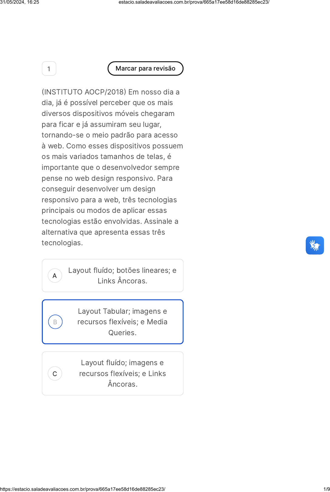 A B C 1 Marcar para revisão �INSTITUTO AOCP/2018� Em nosso dia a dia, já é possível perceber que os mais diversos dispositivos móveis chegaram para ficar e já assumiram seu lugar, tornando-se o meio padrão para acesso à web. Como esses dispositivos possuem os mais variados tamanhos de telas, é importante que o desenvolvedor sempre pense no web design responsivo. Para conseguir desenvolver um design responsivo para a web, três tecnologias principais ou modos de aplicar essas tecnologias estão envolvidas. Assinale a alternativa que apresenta essas três tecnologias. Layout fluído; botões lineares; e Links Âncoras. Layout Tabular; imagens e recursos flexíveis; e Media Queries. Layout fluído; imagens e recursos flexíveis; e Links Âncoras. 31/05/2024, 16:25 estacio.saladeavaliacoes.com.br/prova/665a17ee58d16de88285ec23/ https://estacio.saladeavaliacoes.com.br/prova/665a17ee58d16de88285ec23/ 1/9 D E A B C Layout fluído; imagens e recursos flexíveis; e Media Queries. Layout Tabular; ícones flexíveis; e Links Âncoras. 2 Marcar para revisão Em relação à arquitetura de sistemas multicamadas, considere as assertivas abaixo. I. A estação cliente faz acesso direto ao servidor de banco de dados. II. Um conjunto de bibliotecas, localizadas no computador cliente, tem a função de viabilizar a comunicação entre ele e o servidor. III. As conexões no banco de dados são realizadas pelo servidor de aplicação. IV. O gargalo de I/O �Input/Output) é evitado, uma vez que é possível ter a mesma regra de negócio dividida entre vários servidores através do balanceamento de carga. Os itens I a IV referem-se, respectivamente, aos modelos de: 2, 2, 3 e 3 camadas. 2, 2, 2 e 2 camadas. 2, 3, 2 e 3 camadas. 31/05/2024, 16:25 estacio.saladeavaliacoes.com.br/prova/665a17ee58d16de88285ec23/ https://estacio.saladeavaliacoes.com.br/prova/665a17ee58d16de88285ec23/ 2/9 D E A B C D E 3, 3, 2 e 2 camadas. 3, 3, 3 e 3 camadas. 3 Marcar para revisão �FGV/2021� Analise o trecho HTML a seguir. <table> <tr><th>A</th><th>C</th></tr> <tr><th>B</th><th>D</th></tr> </table> Na exibição da página Web, esse script produz uma tabela. Com quatro colunas e uma linha. Com quatro linhas e uma coluna. Com linhas e colunas desalinhadas. Com uma linha e uma coluna. Com duas linhas e duas colunas. 4 Marcar para revisão 31/05/2024, 16:25 estacio.saladeavaliacoes.com.br/prova/665a17ee58d16de88285ec23/ https://estacio.saladeavaliacoes.com.br/prova/665a17ee58d16de88285ec23/ 3/9 A B C D E A B �FURB/2022� Considere um código HTML 5, o qual está sendo estilizado utilizando CSS 3. Isso posto, você precisa modificar certa propriedade de um grupo de elementos para torná-los animados. Ao encontro disso, do(s) seletor(es) CSS a seguir listado(s), aquele(s) utilizado(s) para especificar um grupo de elementos é/são: Rótulo e identificador. Classe e identificador. Identificador. Classe. Rótulo. 5 Marcar para revisão A propriedade e o valor da regra de estilo CSS que estabelecem a distância de 16px entre o conteúdo de um elemento HTML e a sua borda, no contexto do modelo CSS Box, é: margin: 16px; border-width: 16px; 31/05/2024, 16:25 estacio.saladeavaliacoes.com.br/prova/665a17ee58d16de88285ec23/ https://estacio.saladeavaliacoes.com.br/prova/665a17ee58d16de88285ec23/ 4/9 C D E A B C D E word-spacing: 16px; letter-spacing: 16px; padding: 16px; 6 Marcar para revisão �IDECAN/2023� JavaScript é uma linguagem de programação interpretada estruturada de script muito usada para programação FrontEnd. Selecione o método em JavaScript que remove de um vetor o primeiro elemento e o retorna como resultado. push() shift() join() pop() reverse() 7 Marcar para revisão 31/05/2024, 16:25 estacio.saladeavaliacoes.com.br/prova/665a17ee58d16de88285ec23/ https://estacio.saladeavaliacoes.com.br/prova/665a17ee58d16de88285ec23/ 5/9 A B C D E �FGV/2022 � Adaptada) PHP é uma linguagem server side, gratuita e multiplataforma. Numa página web, um script PHP deve ser localizado entre as tags: <?php> <!doctype> <php php> <.php .php> <scriptPHP scriptPHP> <?php ?> 8 Marcar para revisão �FCC � 2013 � AL�RN � Técnico Legislativo � Programador) Para receber, em um arquivo PHP no servidor, os valores enviados em campos texto de um formulário HTML, utilizam-se variáveis predefinidas. Se o elemento form do formulário contiver method="get", a variável utilizada será ..I.. . Caso contenha method="post", a variável utilizada será ..II.. . Pode-se também utilizar a variável ..III.. que recebe os valores tanto se method="get" quanto se method="post". 00 hora : 23 min : 15 seg Ocultar Questão 4 de 10 SM2 Desenv. Web Em Html5, Css, Javascript e Php 31/05/2024, 16:25 estacio.saladeavaliacoes.com.br/prova/665a17ee58d16de88285ec23/ https://estacio.saladeavaliacoes.com.br/prova/665a17ee58d16de88285ec23/ 6/9 A B C D E As lacunas I, II e III da frase acima são preenchidas, correta e respectivamente, com: $_DOGET, $_DOPOST e $_DOREQUEST $_GET, $_POST e $_REQUEST $GET_DATA, $POST_DATA e $REQUEST_DATA doGet, doPost e processRequest GET, POST e DATAREQUEST 9 Marcar para revisão �OBJETIVA/2021� Conforme Bonatti, sobre tecnologias e linguagens utilizadas na construção de websites, numere a 2ª coluna de acordo com a 1ª e, após, assinale a alternativa que apresenta a sequência correta: �1� CSS. �2� PHP. �3� HTML. ( ) É uma linguagem de programação open source, que é interpretada pelo servidor, muito utilizada para o desenvolvimento de aplicações voltadas para a internet. ( ) Serve para promover o acabamento visual das páginas web. Pode ser compartilhado entre várias páginas, Respondidas �10� Em branco �0� Finalizar prova 1 2 3 4 5 6 7 8 9 10 31/05/2024, 16:25 estacio.saladeavaliacoes.com.br/prova/665a17ee58d16de88285ec23/ https://estacio.saladeavaliacoes.com.br/prova/665a17ee58d16de88285ec23/ 7/9 A B C D E permitindo, assim, uma padronização visual muito simplificada 