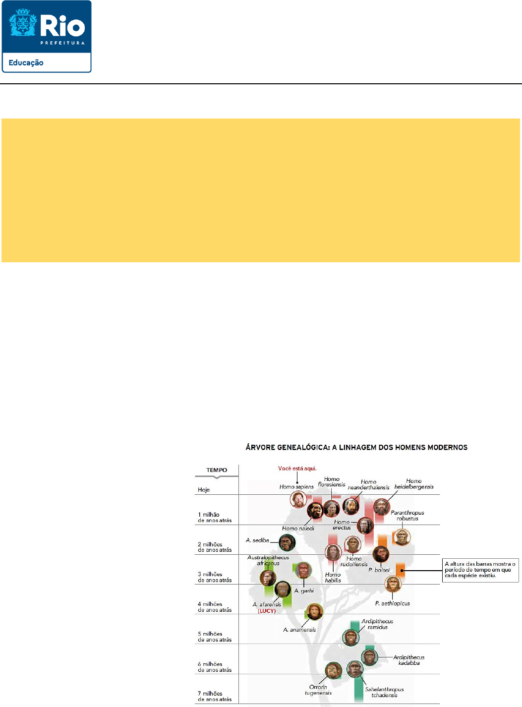 PREFEITURA DA CIDADE DO RIO DE JANEIRO Secretaria Municipal de Educação (SME) 8ª Coordenadoria Regional de Educação E. M. 08.17.028 Presidente Médici Disciplina: História | Prof.: Danilo de Lima | Ano: 6º | Turma: __________ | Data: _____/ _____/ _______ Estudante: __________________________________________________________________ Nº: _____ A HISTÓRIA ANTES DA ESCRITA O termo Pré-História foi criado por historiadores do século XIX para se referir ao período da história que abrange desde o surgimento do gênero Homo, há cerca de 2,5 milhões de anos, até a invenção da escrita, ocorrida por volta de 3500 a.C. Para esses historiadores, não seria possível investigar o passado de sociedades que não deixaram registros escritos de sua existência. Assim, antes da escrita não haveria História. Atualmente, esse termo é considerado inadequado, pois não é só com base em fontes escritas que se constrói o conhecimento histórico. A História está presente desde o surgimento do ser humano, pois, por meio de fontes não escritas, como pinturas em rochas, paredes e tetos de cavernas, além de outros vestígios de moradias e de ferramentas, podemos conhecer diversos aspectos das vidas dos seres humanos e as transformações pelas quais eles passaram ao longo do tempo. O conhecimento sobre o período da História que iremos abordar nesse material deve-se, em grande parte, a estudos de paleontólogos e arqueólogos. Os paleontólogos estudam a origem e a evolução de todos os seres vivos (incluindo o ser humano) por meio dos fósseis, que são restos de seres vivos ou vestígios de suas atividades petrificados (isto é, em forma de pedra) há milhares de anos. Já os arqueólogos estudam o passado das sociedades humanas por meio de vestígios deixados pelo ser humano. Além de fósseis, eles estudam objetos, adornos, utensílios, pinturas, inscrições, dentre outros, que servem de fontes históricas. O surgimento dos seres humanos é uma questão que sempre provocou perguntas e respostas distintas conforme a época e a cultura . Sobre esse assunto, há duas explicações muito conhecidas: uma de base religiosa, chamada criacionismo; e outra de base científica, denominada evolucionismo. O criacionismo defende que a vida e toda matéria existente no universo são resultados da ação direta de um Criador. A perspectiva criacio- nista está presente em várias culturas e religiões, como o judaísmo, o islamismo e o cristianismo. A versão cristã do criacionismo está no primeiro livro da Bíblia, o Gênesis, palavra que significa “origens”. Já a teoria evolucionista foi desenvolvida pelos cientistas britânicos Alfred Russell Wallace (1823-1913) e Charles Darwin (1809-1882) em meados do século XIX. Darwin e Wallace observaram espécies na América do Sul e chegaram a teorias parecidas, mas Darwin ganhou maior reconhecimento ao publicar o livro A origem das espécies (1859). Nessa obra, Darwin afirmou que as espécies estavam em constante transfor- mação e as que se adaptavam melhor ao meio ambiente eram as que conseguiam sobreviver. Era o processo de seleção natural. Anos depois, Darwin publicou A origem do homem (1871) e afirmou que, da mesma forma que outros seres, os humanos também teriam passado por um processo de evolução natural. ÁFRICA: O “BERÇO DA HUMANIDADE” A África é considerada o “berço da humani- dade”, pois foi neste continente que os cientistas encontraram os vestígios mais antigos da pre- sença da espécie humana. Nesse sentido, para a ciência, o ser humano surgiu na África. Há aproximadamente 6 milhões de anos, um grupo de primatas teria dado origem aos primeiros hominídeos, seres com algumas características semelhantes às dos humanos modernos. No de- correr dos milhões de anos seguintes, os hominí- deos evoluíram e deram origem a outras espécies, como os gêneros Australopithecus e Homo. As espécies mais antigas de Australopithecus viveram na África há cerca de 4,5 milhões de anos. A maior parte dos Australopithecus, no en- tanto, extinguiu-se há cerca de 1 milhão de anos. O gênero Homo, ao qual pertencemos, surgiu há aproximadamente 2,5 milhões de anos. Dife- rentes espécies desse gênero habitaram o planeta ao mesmo tempo. Apesar das diferenças, tinham algumas características comuns: cérebro maior em relação a outros primatas, postura ereta (bipe- dismo), habilidade manual, capacidade de articu- lar linguagem e de criar símbolos. Os seres humanos modernos (Homo sapiens sapiens) surgiram na África por volta de 120 mil anos atrás e se expandiram para várias regiões do mundo. Chegaram ao Oriente Médio e à Índia por volta de 90 mil anos atrás e à Europa e Austrália há aproximadamente 50 mil anos. Já no caso da América, os primeiros grupos teriam chegado entre 20 e 15 mil anos atrás, segundo as teorias mais aceitas pelos cientistas. O longo período da História conhecido como Pré-História costuma ser dividido em duas partes. O período mais antigo recebe o nome de Paleolítico (“pedra antiga” ou “pedra lascada”) e começou há cerca de 2,5 milhões de anos. O segundo período se chama Neolítico (“pedra nova” ou “pedra polida”) e se iniciou quando os seres humanos passaram a praticar a agricultura, por volta de aproximadamente 12 mil anos atrás, e terminou há cerca de 5 mil anos, quando alguns grupos começaram a produzir objetos de metal (metalurgia). Por volta de 5000 a.C., os seres humanos desenvolveram a metalurgia (técnica de fabricação de metais) e com isso passaram a produzir utensílios e armas mais sofisticados e resistentes. De início, o cobre foi utilizado para fabricar enfeites e estatuetas. Depois, o bronze (mistura de cobre com estanho), metal mais duro e resistente, passou a ser usado na produção de armas e escudos. Essa transformação levou a um novo período histórico: a Idade dos Metais (aproximadamente 4500 a.C. – 4000 a.C.). EXERCÍCIOS: “A