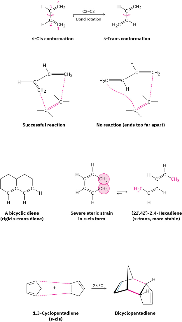In the alternative s-trans conformation, the ends of the diene partner are too far apart to overlap with the dienophile p orbitals. Two examples of dienes that can’t adopt an s-cis conformation, and thus don’t undergo Diels–Alder reactions, are shown in FIGURE 14.10. In the bicyclic diene, the double bonds are rigidly fixed in an s-trans arrangement by geometric constraints of the rings. In (2Z,4Z)-2,4-hexadiene, steric strain between the two methyl groups prevents the molecule from adopting s-cis geometry. FIGURE 14.10 Two dienes that can’t achieve an s-cis conformation and thus can’t undergo Diels–Alder reactions. In contrast to these unreactive dienes that can’t achieve an s-cis conformation, other dienes are fixed only in the correct s-cis geometry and are therefore highly reactive in Diels–Alder cycloaddition. 1,3-Cyclopentadiene, for example, is so reactive that it reacts with itself. At room temperature, 1,3-cyclopentadiene dimerizes. One molecule acts as diene and a second molecule acts as dienophile in a self-Diels–Alder reaction. Biological Diels–Alder reactions are also known but are uncommon. One example occurs in the biosynthesis of the cholesterol-lowering drug lovastatin (trade name Mevacor) isolated from the bacterium Aspergillus terreus. The key step is the intramolecular Diels–Alder reaction of a triene, in which the diene and dienophile components are within the same molecule. 468 14 • Conjugated Compounds and Ultraviolet Spectroscopy Access for free at openstax.org PROBLEM 14-8 Which of the following alkenes would you expect to be good Diels–Alder dienophiles? (a) (b) (c) (d) (e) PROBLEM 14-9 Which of the following dienes have an s-cis conformation, and which have an s-trans conformation? Of the s-trans dienes, which can readily rotate to s-cis? (a) (b) (c) PROBLEM 14-10 Predict the product of the following Diels–Alder reaction: 14.6 Diene Polymers: Natural and Synthetic Rubbers Conjugated dienes can be polymerized just as simple alkenes can (Section 8.10). Diene polymers are structurally more complex than simple alkene polymers, however, because double bonds occur every four carbon atoms along the chain, leading to the possibility of cis–trans isomers. The initiator (In) for the reaction can be either a radical, as occurs in ethylene polymerization, or an acid. Note that the polymerization is a 1,4 addition of the growing chain to a conjugated diene monomer. 14.6 • Diene Polymers: Natural and Synthetic Rubbers 469 Rubber is a naturally occurring diene polymer of isoprene (2-methyl-1,3-butadiene) and is produced by more than 400 different plants. The major source is the so-called rubber tree, Hevea brasiliensis, from which the crude material, called latex, is harvested as it drips from a slice made through the bark. The double bonds of rubber have Z stereochemistry, but gutta-percha, the E isomer of rubber, also occurs naturally. Harder and more brittle than rubber, gutta-percha has a variety of applications, including use in dental endodontics and as the covering on some golf balls. A number of different synthetic rubbers are produced commercially by diene polymerization. Both cis- and trans-polyisoprene can be made, and the synthetic rubber thus produced is similar to the natural material. Chloroprene (2-chloro-1,3-butadiene) is polymerized to yield neoprene, an excellent, although expensive, synthetic rubber with good weather resistance. Neoprene is used in the production of industrial hoses and gloves, among other things. Both natural and synthetic rubbers are too soft and tacky to be useful until they are hardened by heating with elemental sulfur, a process called vulcanization. Vulcanization cross-links the rubber chains by forming carbon–sulfur bonds between them, thereby hardening and stiffening the polymer. The exact degree of hardening can be varied, yielding material soft enough for automobile tires or hard enough for bowling balls (ebonite). The unusual ability of rubber to stretch and then contract to its original shape is due to the irregular structure of the polymer chains caused by the double bonds. These double bonds introduce bends and kinks into the polymer chains, thereby preventing neighboring chains from nestling together. When stretched, the randomly coiled chains straighten out and orient along the direction of the pull but are kept from sliding over one another by the cross-links. When the tension is released, the polymer reverts to its original random state. PROBLEM 14-11 Draw a segment of the polymer that might be prepared from 2-phenyl-1,3-butadiene. PROBLEM 14-12 Show the mechanism of the acid-catalyzed polymerization of 1,3-butadiene. 470 14 • Conjugated Compounds and Ultraviolet Spectroscopy Access for free at openstax.org 14.7 Ultraviolet Spectroscopy As we’ve seen, mass spectrometry, infrared spectroscopy, and nuclear magnetic resonance spectroscopy are techniques of structure determination applicable to all organic molecules. In addition to these three generally useful methods, there is a fourth—ultraviolet (UV) spectroscopy—that is applicable only to conjugated compounds. UV is less commonly used than the other three spectroscopic techniques because of the specialized information it gives, so we’ll only discuss it briefly. Mass spectrometry Molecular size and formula IR spectroscopy Functional groups present NMR spectroscopy Carbon–hydrogen framework UV spectroscopy Conjugated π electron systems The ultraviolet region of the electromagnetic spectrum extends from the short-wavelength end of the visible region (4 × 10–7 m) to the long-wavelength end of the X-ray region (10–8 m), but the narrow range from 2 × 10–7 m to 4 × 10–7 m is the part of greatest interest to organic chemists. Absorptions in this region are usually measured in nanometers (nm), where 1 nm = 10–9 m. Thus, the ultraviolet range of interest is from 200 to 400 nm (FIGURE 14.11). FIGURE 14.11 The ultraviolet (U