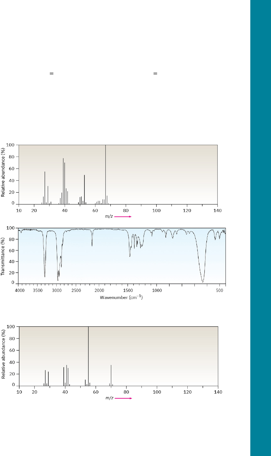 PROBLEM 12-37 Assume that you are carrying out the base-induced dehydrobromination of 3-bromo-3-methylpentane (Section 11.7) to yield an alkene. How could you use IR spectroscopy to tell which of three possible elimination products is formed, if one includes E/Z isomers? General Problems PROBLEM 12-38 Which is stronger, the C O bond in an ester (1735 cm–1) or the C O bond in a saturated ketone (1715 cm–1)? Explain. PROBLEM 12-39 Carvone is an unsaturated ketone responsible for the odor of spearmint. If carvone has M+ = 150 in its mass spectrum and contains three double bonds and one ring, what is its molecular formula? PROBLEM 12-40 Carvone (Problem 12-39) has an intense infrared absorption at 1690 cm–1. What kind of ketone does carvone contain? PROBLEM 12-41 The mass spectrum (a) and the infrared spectrum (b) of an unknown hydrocarbon are shown. Propose as many structures as you can. (a) (b) PROBLEM 12-42 The mass spectrum (a) and the infrared spectrum (b) of another unknown hydrocarbon are shown. Propose as many structures as you can. (a) 12 • Additional Problems 413 (b) PROBLEM 12-43 Propose structures for compounds that meet the following descriptions: (a) An optically active compound C5H10O with an IR absorption at 1730 cm–1 (b) A non-optically active compound C5H9N with an IR absorption at 2215 cm–1 PROBLEM 12-44 4-Methyl-2-pentanone and 3-methylpentanal are isomers. Explain how you could tell them apart, both by mass spectrometry and by infrared spectroscopy. PROBLEM 12-45 Grignard reagents (alkylmagnesium halides) undergo a general and very useful reaction with ketones. Methylmagnesium bromide, for example, reacts with cyclohexanone to yield a product with the formula C7H14O. What is the structure of this product if it has an IR absorption at 3400 cm–1? PROBLEM 12-46 Ketones undergo a reduction when treated with sodium borohydride, NaBH4. What is the structure of the compound produced by reaction of 2-butanone with NaBH4 if it has an IR absorption at 3400 cm–1 and M+ = 74 in the mass spectrum? PROBLEM 12-47 Nitriles, R–C N, undergo a hydrolysis reaction when heated with aqueous acid. What is the structure of the compound produced by hydrolysis of propanenitrile, CH3CH2C N, if it has IR absorptions from 2500–3100 cm–1 and at 1710 cm–1, and has M+ = 74? PROBLEM 12-48 The infrared spectrum of the compound with the following mass spectrum lacks any significant absorption above 3000 cm–1. There is a prominent peak near 1740 cm–1 and another strong peak near 1200 cm–1. Propose a structure. 414 12 • Additional Problems Access for free at openstax.org PROBLEM 12-49 The infrared spectrum of the compound with the following mass spectrum has a medium-intensity peak at about 1650 cm–1. There is also a C–H out-of-plane bending peak near 880 cm–1. Propose a structure. PROBLEM 12-50 The infrared spectrum of the compound with the following mass spectrum has strong absorbances at 1584, 1478, and 1446 cm–1. Propose a structure. 12 • Additional Problems 415 416 12 • Additional Problems Access for free at openstax.org WHY THIS CHAPTER? CHAPTER 13 Structure Determination: Nuclear Magnetic Resonance Spectroscopy 13.1 Nuclear Magnetic Resonance Spectroscopy 13.2 The Nature of NMR Absorptions 13.3 Chemical Shifts 13.4 Chemical Shifts in 1H NMR Spectroscopy 13.5 Integration of 1H NMR Absorptions: Proton Counting 13.6 Spin–Spin Splitting in 1H NMR Spectra 13.7 1H NMR Spectroscopy and Proton Equivalence 13.8 More Complex Spin–Spin Splitting Patterns 13.9 Uses of 1H NMR Spectroscopy 13.10 13C NMR Spectroscopy: Signal Averaging and FT–NMR 13.11 Characteristics of 13C NMR Spectroscopy 13.12 DEPT 13C NMR Spectroscopy 13.13 Uses of 13C NMR Spectroscopy Nuclear magnetic resonance (NMR) spectroscopy has far-reaching applications in many scientific fields, particularly in chemical structure determination. Although we’ll just give an overview of the subject in this chapter, focusing on NMR applications with small molecules, more advanced NMR techniques are also used in biological chemistry to study protein structure and folding. Nuclear magnetic resonance (NMR) spectroscopy is the most valuable spectroscopic technique available to organic chemists. It’s the method of structure determination that organic chemists usually turn to first. FIGURE 13.1 NMR spectroscopy is an invaluable aid in carrying out the design and synthesis of new drugs. (credit: modification of work by Unknown/Pxhere, CC0 1.0) CHAPTER CONTENTS Chapter 13 Structure Determination: Nuclear Magnetic Resonance Spectroscopy Why This Chapter?