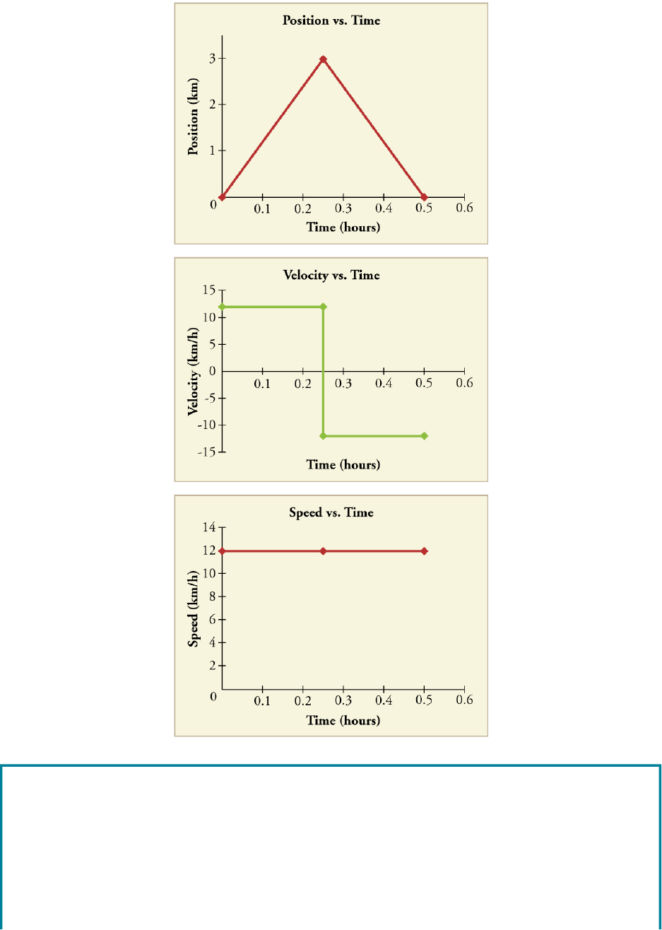 FIGURE 2.11 Position vs. time, velocity vs. time, and speed vs. time on a trip. Note that the velocity for the return trip is negative. MAKING CONNECTIONS: TAKE-HOME INVESTIGATION—GETTING A SENSE OF SPEED If you have spent much time driving, you probably have a good sense of speeds between about 10 and 70 miles per hour. But what are these in meters per second? What do we mean when we say that something is moving at 10 m/s? To get a better sense of what these values really mean, do some observations and calculations on your own: • calculate typical car speeds in meters per second 48 2 • Kinematics Access for free at openstax.org CHECK YOUR UNDERSTANDING A commuter train travels from Baltimore to Washington, DC, and back in 1 hour and 45 minutes. The distance between the two stations is approximately 40 miles. What is (a) the average velocity of the train, and (b) the average speed of the train in m/s? Solution (a) The average velocity of the train is zero because ; the train ends up at the same place it starts. (b) The average speed of the train is calculated below. Note that the train travels 40 miles one way and 40 miles back, for a total distance of 80 miles. 2.4 Acceleration LEARNING OBJECTIVES By the end of this section, you will be able to: • Define and distinguish between instantaneous acceleration, average acceleration, and deceleration. • Calculate acceleration given initial time, initial velocity, final time, and final velocity. FIGURE 2.12 A plane decelerates, or slows down, as it comes in for landing in St. Maarten. Its acceleration is opposite in direction to its velocity. (credit: Steve Conry, Flickr) In everyday conversation, to accelerate means to speed up. The accelerator in a car can in fact cause it to speed up. The greater the acceleration, the greater the change in velocity over a given time. The formal definition of acceleration is consistent with these notions, but more inclusive. Because acceleration is velocity in m/s divided by time in s, the SI units for acceleration are , meters per second squared or meters per second per second, which literally means by how many meters per second the • estimate jogging and walking speed by timing yourself; convert the measurements into both m/s and mi/h • determine the speed of an ant, snail, or falling leaf 2.8 2.9 AVERAGE ACCELERATION Average Acceleration is the rate at which velocity changes, where is average acceleration, is velocity, and is time. (The bar over the means average acceleration.) 2.10 2.4 • Acceleration 49 velocity changes every second. Recall that velocity is a vector—it has both magnitude and direction. This means that a change in velocity can be a change in magnitude (or speed), but it can also be a change in direction. For example, if a car turns a corner at constant speed, it is accelerating because its direction is changing. The quicker you turn, the greater the acceleration. So there is an acceleration when velocity changes either in magnitude (an increase or decrease in speed) or in direction, or both. Keep in mind that although acceleration is in the direction of the change in velocity, it is not always in the direction of motion. When an object slows down, its acceleration is opposite to the direction of its motion. This is known as deceleration. FIGURE 2.13 A subway train in Sao Paulo, Brazil, decelerates as it comes into a station. It is accelerating in a direction opposite to its direction of motion. (credit: Yusuke Kawasaki, Flickr) ACCELERATION AS A VECTOR Acceleration is a vector in the same direction as the change in velocity, . Since velocity is a vector, it can change either in magnitude or in direction. Acceleration is therefore a change in either speed or direction, or both. MISCONCEPTION ALERT: DECELERATION VS. NEGATIVE ACCELERATION Deceleration always refers to acceleration in the direction opposite to the direction of the velocity. Deceleration always reduces speed. Negative acceleration, however, is acceleration in the negative direction in the chosen coordinate system. Negative acceleration may or may not be deceleration, and deceleration may or may not be considered negative acceleration. For example, consider Figure 2.14. 50 2 • Kinematics Access for free at openstax.org EXAMPLE 2.1 Calculating Acceleration: A Racehorse Leaves the Gate A racehorse coming out of the gate accelerates from rest to a velocity of 15.0 m/s due west in 1.80 s. What is its average acceleration? FIGURE 2.14 (a) This car is speeding up as it moves toward the right. It therefore has positive acceleration in our coordinate system. (b) This car is slowing down as it moves toward the right. Therefore, it has negative acceleration in our coordinate system, because its acceleration is toward the left. The car is also decelerating: the direction of its acceleration is opposite to its direction of motion. (c) This car is moving toward the left, but slowing down over time. Therefore, its acceleration is positive in our coordinate system because it is toward the right. However, the car is decelerating because its acceleration is opposite to its motion. (d) This car is speeding up as it moves toward the left. It has negative acceleration because it is accelerating toward the left. However, because its acceleration is in the same direction as its motion, it is speeding up (not decelerating). 2.4 • Acceleration 51 FIGURE 2.15 (credit: Jon Sullivan, PD Photo.org) Strategy First we draw a sketch and assign a coordinate system to the problem. This is a simple problem, but it always helps to visualize it. Notice that we assign east as positive and west as negative. Thus, in this case, we have negative velocity. FIGURE 2.16 We can solve this problem by identifying and from the given information and then calculating the average acceleration directly from the equation . Solution 1. Identify the knowns. , (the negative sign indicates direction toward the west), . 2. Find the change in velocity. Since the h