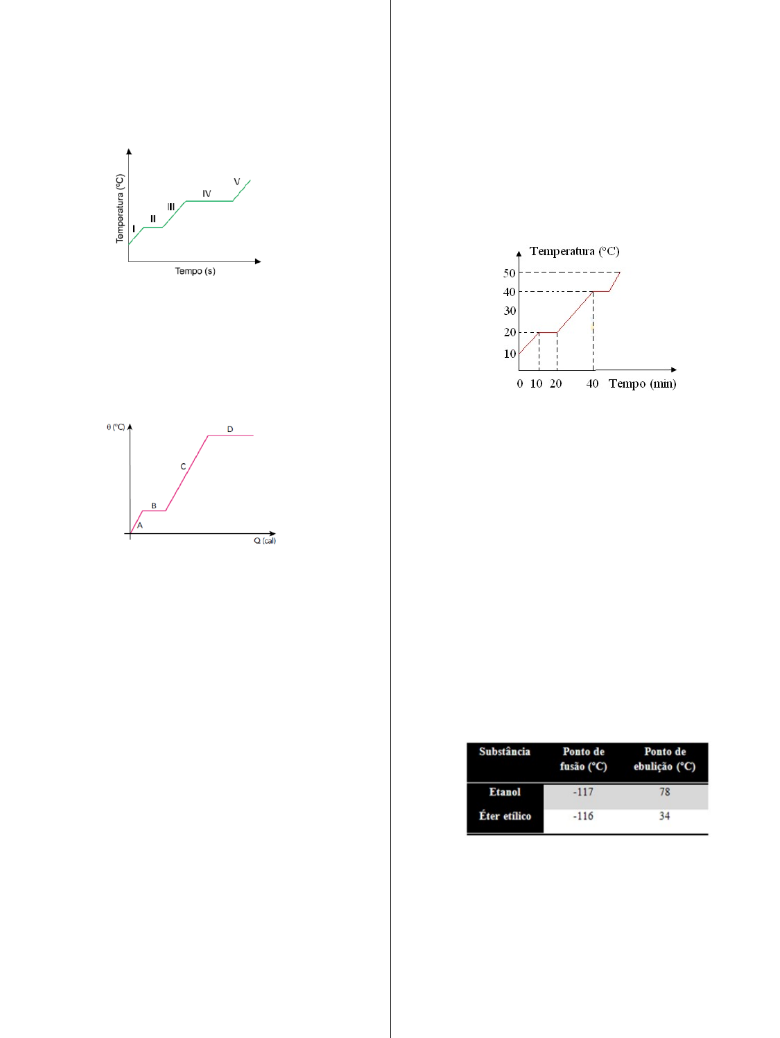 1. O ponto de fusão do ferro é igual a 1530 ºC e o ponto de ebulição é de 2 450ºC. Baseado nisso, qual será o estado físico do ferro nas seguintes temperaturas: A) 25 ºC: B) 130 ºC: B) 1459 ºC: C) 2235 ºC: D) 3002 ºC: 2. O gráfico apresenta a variação da temperatura de uma substância durante aquecimento sob pressão constante Na representação gráfica, a fusão da substância ocorre no segmento a) I b) II c) III d) IV e) V. 3. Observe no diagrama as etapas de variação da temperatura e de mudanças de estado físico de uma esfera sólida, em função do calor por ela recebido. Admita que a esfera é constituída por um metal puro. Durante a etapa D, ocorre a seguinte mudança de estado físico: a) fusão b) sublimação c) condensação d) vaporização 4. Observe: I – Uma pedra de naftalina deixada no armário; II – Uma vasilha de água deixada no freezer; III- Uma vasilha de água deixada no fogo; IV – O derretimento de um pedaço de chumbo quando aquecido; Nesses fatos estão relacionados corretamente os seguintes fenômenos: a) I. Sublimação; II. Solidificação; III. Evaporação; IV. Fusão. b) I. Sublimação; II. Sublimação; III. Evaporação; IV. Solidificação. c) I. Fusão; II. Sublimação; III. Evaporação; IV. Solidificação. d) I. Evaporação; II. Solidificação; III. Fusão; IV. Sublimação. e) I. Evaporação; II. Sublimação; III. Fusão; IV. Solidificação. 5. Em uma noite de inverno rigoroso uma dona de casa estendeu as roupas recém lavadas no varal, expostas ao tempo. Pela manhã as roupas congelaram, em função do frio intenso. Com a elevação da temperatura no decorrer da manhã, começou a pingar água das roupas, em seguida elas ficaram apenas úmidas, e elas logo estavam secas. Ocorreram nestas roupas, respectivamente, as seguintes passagens de estados físicos: a) fusão, solidificação e evaporação. b) solidificação, evaporação e fusão. c) solidificação, fusão e evaporação. d) fusão, evaporação e solidificação. e) evaporação, solidificação e fusão 6. Para o uso sustentável da água, recomenda-se que as plantas e o gramado de um jardim sejam molhados antes das 10 horas da manhã e após as 19 horas. Assim, garante-se a manutenção da umidade desse jardim, respeitando-se o ciclo da água, sem desperdícios. Essa recomendação considera o fenômeno da a) calefação. b) sublimação. c) evaporação. d) condensação. 7. O gráfico abaixo representa a variação de temperatura observada no aquecimento de uma determinada substância: Relacione as colunas com informações a respeito do gráfico em questão: Coluna 1: I. Faixa de temperatura em que a substância permanece sólida; II. Faixa de temperatura em que a substância permanece totalmente líquida; III. Temperatura de ebulição; IV. Temperatura de fusão; V. Tempo que a fusão demora; VI. Tempo em que a substância permanece líquida. Coluna 2: ( ) 10 minutos. ( ) 20 ºC. ( ) Entre 10 a 20 ºC. ( ) 20 minutos. ( ) Entre 20 a 40 ºC. ( ) 40ºC. 8. Pela análise dos dados da tabela, medidos a 1 atm, podemos afirmar que à temperatura de 40 ºC e 1 atm: a) O éter e o etanol encontram-se na fase gasosa. b) O éter se encontra na fase gasosa e o etanol na fase líquida. c) Ambos encontram-se na fase líquida. d) O éter encontra-se na fase líquida e o etanol na fase gasosa. e) Ambos se encontram na fase sólida. 9. O gráfico a seguir representa a curva de resfriamento da água pura à pressão constante de 1 atm. Julgue se são verdadeiras ou falsas as afirmações a seguir: a) O fenômeno que ocorre na região B da curva é a solidificação e há duas fases em equilíbrio. b) Na região C da curva, há somente a fase sólida. c) Nas regiões B e D da curva, a temperatura permanece constante. d) Na região D da curva, coexistem as fases sólida e líquida. 10. A tabela a seguir traz os pontos de fusão e ebulição, em ºC, sob pressão de 1 atm, de alguns materiais. Com base nas informações da tabela, assinale a alternativa que indica quais materiais estão no estado de agregação líquido à temperatura ambiente (cerca de 25ºC): a) Oxigênio e Metanol b) Metanol, acetona e mercúrio c) Metanol e mercúrio d) Amônia, acetona, mercúrio e alumínio e) Nenhuma das alternativas. 11. O gráfico abaixo apresenta a variação de temperatura observada ao se aquecer uma substância A, a partir de 25 °C, em função do tempo. Assinale a alternativa CORRETA. a) A faixa de temperatura em que a substância permanece sólida é 25-41 °C. b) A substância A não é uma substância pura. c) A temperatura de ebulição da substância A é 41 °C. d) A faixa de temperatura em que a substância permanece líquida é 25-182 °C. e) Em 25 °C, a substância é um líquido. 12. Uma substância sólida é aquecida continuamente. O gráfico a seguir mostra a variação da temperatura (ordenada) com o tempo (abscissa): O ponto de fusão, o ponto de ebulição e o tempo durante o qual a substância permanece no estado líquido são, respectivamente: a) 150, 65 e 5 b) 65, 150 e 25 c) 150, 65 e 25 d) 65, 150 e 5 e) 65, 150 e 10 13. Considere os seguintes dados de pontos de fusão e de ebulição, sob pressão de 1 atm: Ao nível do mar e no verão, dentre as substâncias acima, deve-se estocar em geladeira, por razões de segurança, apenas: a) metanol e etanol. b) éter dietílico e ácido etanóico. c) etanol e ácido etanóico. d) ácido etanóico. e) éter dietílico 14. O naftaleno, comercialmente conhecido como naftalina, empregado para evitar baratas em roupas, funde em temperaturas superiores a 80°C. Sabe-se que bolinhas de naftalina, à temperatura ambiente, têm suas massas constantemente diminuídas, terminando por desaparecer sem deixar resíduo. Essa observação pode ser explicada pelo fenômeno da: a) fusão. b) sublimação. c) solidificação. d) liquefação. e) ebulição. 15. As fases de agregação para as substâncias abaixo, quando exp