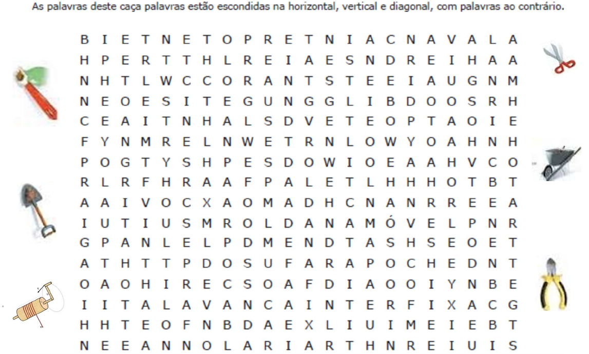 CAÇA-PALAVRAS: MÁQUINAS SIMPLES ALAVANCA INTERFIXA - ALAVANCA INTERPOTENTE – PARAFUSO – CUNHA - ROLDANA MÓVEL - ROLDANA FIXA ------------------------------------------------------------------------------------------------------------------------------------------------------------- PREENCHA AS LACUNAS ABAIXO: ALAVANCAS são formadas por uma _______________ que pode ser reta ou curva que se movimenta ao redor de um ponto ou eixo (PONTO DE APOIO – P). As alavancas podem ser de três tipos: _______________ quando o ponto de apoio (P) fica entre as forças de resistência (R) e de ação (F); ________________________ quando a força de Resistência (R) fica entre o ponto de apoio (P) e a força de ação (F); e _________________ quando o ponto de ação (F) fica entre o ponto de apoio (P) e a resistência (R). Exemplos de alavancas interfixas são: _________________________________________________________________ Exemplos de alavancas inter-resistentes são: ____________________________________________________________ Exemplos de alavancas interpotentes são: ______________________________________________________________ ROLDANAS OU POLIAS são _________________ com um ____________ na superfície externa pela qual passa uma corda ou cabo. Elas podem ser ______________ ou __________________. Já o ___________________________________________ é qualquer superfície plana, rígida e inclinada utilizada para facilitar o deslocamento de corpos pesados. O _____________ é um plano inclinado disposto em espiral, e a ______________________é um plano inclinado duplo.