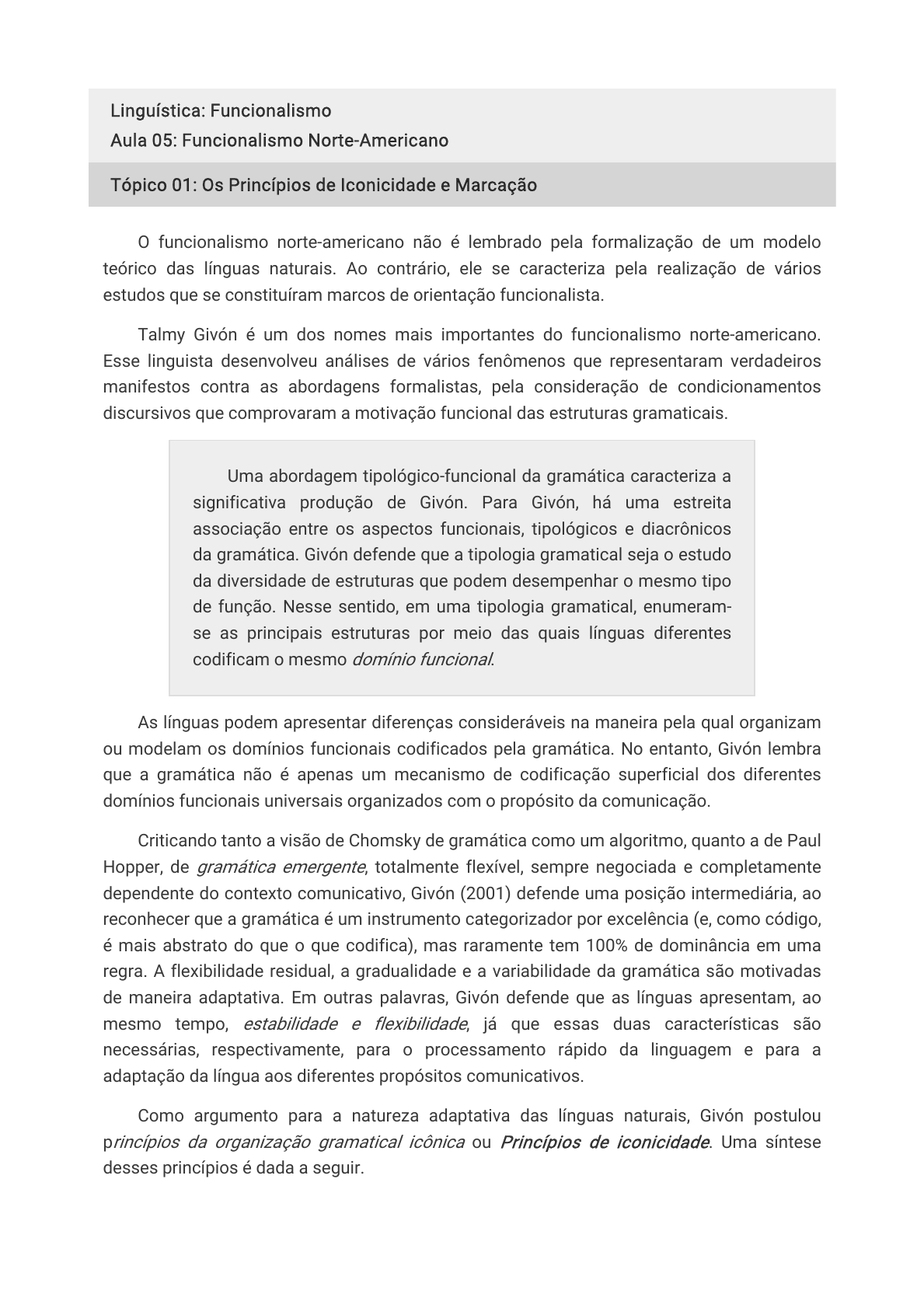Linguística: Funcionalismo Aula 05: Funcionalismo Norte-Americano Tópico 01: Os Princípios de Iconicidade e Marcação O funcionalismo norte-americano não é lembrado pela formalização de um modelo teórico das línguas naturais. Ao contrário, ele se caracteriza pela realização de vários estudos que se constituíram marcos de orientação funcionalista. Talmy Givón é um dos nomes mais importantes do funcionalismo norte-americano. Esse linguista desenvolveu análises de vários fenômenos que representaram verdadeiros manifestos contra as abordagens formalistas, pela consideração de condicionamentos discursivos que comprovaram a motivação funcional das estruturas gramaticais. Uma abordagem tipológico-funcional da gramática caracteriza a significativa produção de Givón. Para Givón, há uma estreita associação entre os aspectos funcionais, tipológicos e diacrônicos da gramática. Givón defende que a tipologia gramatical seja o estudo da diversidade de estruturas que podem desempenhar o mesmo tipo de função. Nesse sentido, em uma tipologia gramatical, enumeram- se as principais estruturas por meio das quais línguas diferentes codificam o mesmo domínio funcional. As línguas podem apresentar diferenças consideráveis na maneira pela qual organizam ou modelam os domínios funcionais codificados pela gramática. No entanto, Givón lembra que a gramática não é apenas um mecanismo de codificação superficial dos diferentes domínios funcionais universais organizados com o propósito da comunicação. Criticando tanto a visão de Chomsky de gramática como um algoritmo, quanto a de Paul Hopper, de gramática emergente, totalmente flexível, sempre negociada e completamente dependente do contexto comunicativo, Givón (2001) defende uma posição intermediária, ao reconhecer que a gramática é um instrumento categorizador por excelência (e, como código, é mais abstrato do que o que codifica), mas raramente tem 100% de dominância em uma regra. A flexibilidade residual, a gradualidade e a variabilidade da gramática são motivadas de maneira adaptativa. Em outras palavras, Givón defende que as línguas apresentam, ao mesmo tempo, estabilidade e flexibilidade, já que essas duas características são necessárias, respectivamente, para o processamento rápido da linguagem e para a adaptação da língua aos diferentes propósitos comunicativos. Como argumento para a natureza adaptativa das línguas naturais, Givón postulou princípios da organização gramatical icônica ou Princípios de iconicidade. Uma síntese desses princípios é dada a seguir. 51 impresso_parcial.pdf LinguisticaFuncionalismo_aula_05.pdf