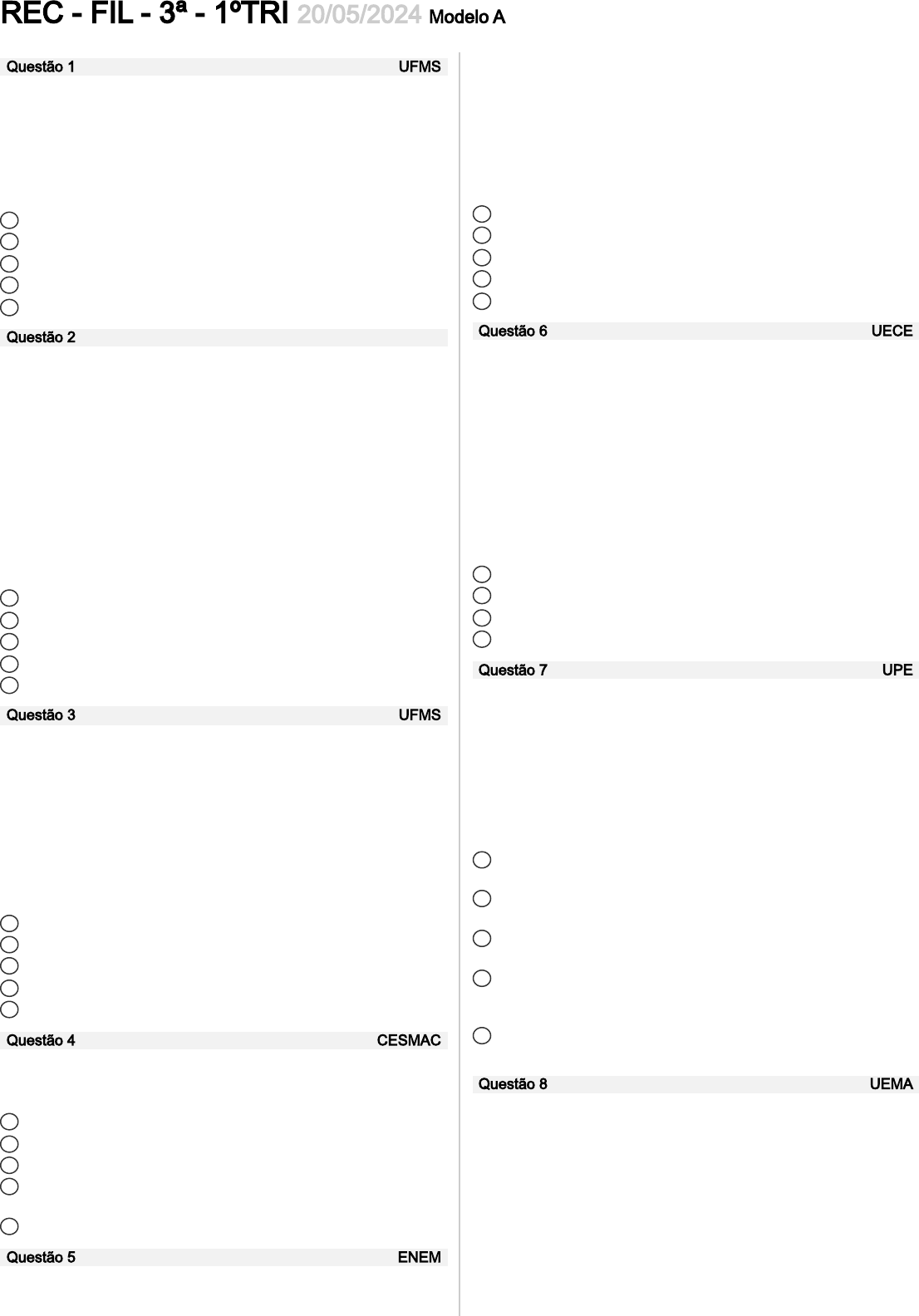 REC - FIL - 3ª - 1ºTRI 20/05/2024 Modelo A UFMSQuestão 1 Citado como um dos fundadores da filosofia ocidental, com registros de suas ideias realizados pelo mais conhecido de seus seguidores, teve muitos adeptos do seu método e tornou-se precursor da dialética, na qual se encaminha um diálogo por meio de visões opostas. A contextualização apresentada referese ao filósofo: a Tomás de Aquino. b Aristóteles. c Sócrates. d Pitágoras. e Platão. Questão 2 Platão e Aristóteles indicaram com precisão a experiência que, segundo eles, dá origem ao pensar filosófico. É aquilo que os gregos chamaram 'thauma' (espanto, admiração, perplexidade). (REZENDE, Antonio. Curso de Filosofia, Rio de Janeiro: Zahar, 1998, p. 13.) A filosofia grega surgiu quando as respostas dadas pelo conhecimento mitológico deixaram de satisfazer a curiosidade do homem. Os pensadores gregos pré-socráticos preocupavam-se com "os princípios primeiros‟ algo que explicasse a origem das coisas. Sobre o período pré-socrático, esses filósofos eram também conhecidos como: a filósofos da religião. b filósofos da natureza. c filósofos da renascença. d filósofos da crença. e filósofos do conhecimento. UFMSQuestão 3 Na filosofia grega antiga, a dialética era um método para se encontrar a verdade, sendo esta parte da perspectiva racional engajada no pensamento hierárquico ateniense do período clássico. Por meio de diálogos filosóficos colidentes entre o conhecimento sensível (inferior) e o inteligível (superior), se atingiria a razão. Esta epistemologia é aplicada sobretudo na obra República, escrita por um filósofo que viveu entre os séculos V AEC e IV AEC. A qual filósofo o enunciado se refere? a Platão b Sócrates c Aristóteles d Heráclito e Zenão de Eléia. CESMACQuestão 4 Quando uma pessoa, usando a sua racionalidade, tenta descobrir as razões últimas que explicam cada coisa existente, ou simplesmente pensada, dizemos que: a está praticando um verdadeiro ato de filosofar. b está praticando um verdadeiro ato de fé c está tentando descobrir o sentido do próprio destino. d está tentando descobrir as verdadeiras causas da ação de Deus na criação. e praticando um ato de verdadeira pesquisa científica. ENEMQuestão 5 Sócrates: “Quem não sabe o que uma coisa é, como poderia saber de que tipo de coisa ela é? Ou te parece ser possível alguém que não conhece absolutamente quem é Mênon, esse alguém saber se ele é belo, se é rico e ainda se é nobre? Parece- te ser isso possível? Assim, Mênon, que coisa afirmas ser a virtude?”. PLATÃO. Ménon fo de Janeiro PUC-Rio São Paulo: Loyola, 2001 (adaptado) A atitude apresentada na interlocução do filósofo com Mênon é um exemplo da utilização do(a) a escrita epistolar. b método dialético. c linguagem trágica. d explicação fiscalista. e suspensão judicativa. UECEQuestão 6 “Os grandes cientistas de Tales a Demócrito e Anaxágoras costumam ser descritos nos livros de história ou de filosofia como ‘pré-socráticos’, como se sua principal função fosse sustentar a fortaleza filosófica até o advento de Sócrates, Platão e Aristóteles, e talvez influenciá-los um pouco. Na verdade, os antigos jônios representam uma tradição diferente e bastante questionadora, muito mais compatível com a ciência moderna.” SAGAN, Carl. A espinha dorsal da noite. In: Cosmos. Trad. bras. Paulo Seiger. São Paulo: Companhia das Letras, 2017. É implícita a essa passagem de Carl Sagan (1934- 1996) acerca do surgimento e da história da filosofia grega a visão de que a depois de Sócrates os filósofos não estudaram a natureza. b Sócrates rompeu com os métodos dos filósofos jônicos. c os pensadores anteriores a Sócrates não eram filósofos. d Platão e Aristóteles não conheceram teses présocráticas. UPEQuestão 7 A Filosofia aparece na Grécia por volta do século VII, antes de nossa era. Os primeiros filósofos foram designados pré-socráticos; Tales, Heráclito e Parmênides são alguns desses primeiros filósofos. Embora cada um deles tivesse um pensamento bastante peculiar, havia um problema comum que norteava a filosofia em seus primeiros anos de vida. Assinale a alternativa que corresponde ao debate fundamental dos pré-socráticos. a Procuravam definir o princípio de todas as coisas, isto é, aquilo pelo qual existem e subsistem todas as coisas. b Procuravam definir a essência de Deus, ou seja, como é possível criar o mundo a partir de seu exterior. c Procuravam estabelecer quais as melhores leis para a Pólis, isto é, qual a melhor forma de governo. d Procuravam distinguir a essência humana da essência dos outros seres, quer dizer, as características basilares do gênero humano. e Procuravam estabelecer um método científico, ou seja, comprovar empiricamente a importância da filosofia UEMAQuestão 8 Platão é o filósofo, discípulo e, simultaneamente, herdeiro de Sócrates. Ele apresenta, em seus textos filosóficos, narrativas denominadas de “Diálogos”, cujo personagem principal, em boa parte dessas narrativas, é seu mestre Sócrates. Em A República, sua maior obra, apresenta uma proposta para a Cidade de Atenas ser uma cidade feliz. Platão é considerado um filósofo que a desenvolveu uma filosofia, no período grego, de modo que ele constitui seu pensamento na compreensão de bipolaridade: o mundo das ideias e o mundo sensível. b originou a dialética, porque defende que tudo é movimento, confirmado na proposição: “ninguém banha no mesmo rio duas vezes”. c fundamenta, por ser do período pré-socrático, que o princípio de todas as coisas é a água. d desdobrou um pensamento de crítica aos sofistas, defendendo que o filósofo é aquele que nada sabe, como afirma a proposição: “só sei que nada sei”. e defende uma filosofia, com características do período medieval, centrada numa herança maniqueísta, alicerce para a Trindade e a doutrina da c