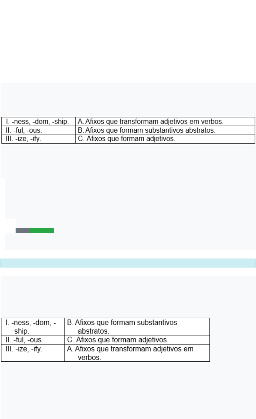 Ensino de inglês para fins específicos Prepare-se! Chegou a hora de você testar o conhecimento adquirido nesta disciplina. A Avaliação Virtual (AV) é composta por questões objetivas e corresponde a 100% da média final. Você tem até cinco tentativas para “Enviar” as questões, que são automaticamente corrigidas. Você pode responder as questões consultando o material de estudos, mas lembre-se de cumprir o prazo estabelecido. Boa prova! Parte superior do formulário 1) Afixos (sufixos e prefixos) são unidades de significado que transformam determinados vocábulos. Os itens a seguir associam essas conexões. Assinale a alternativa que traz a associação correta entre as duas colunas: Alternativas: · I – C; II – B; III – A. · I – A; II – C; III – B. · I – B; II – A; III – C. · I – B; II – C; III – A. checkCORRETO · I – C; II – A; III – B. Resolução comentada: Os sufixos “-ness”, “-dom”, “-ship” transformam substantivos comuns em abstratos (happy - happiness; free - freedom; friend - friendship). Os sufixos “-ize” e “-ify” transformam adjetivos em verbos (national - nationalize; intense - intensify). Os sufixos “-ful” e “-ous” formam adjetivos (useful; dangerous). Código da questão: 70550 2) Sobre o trabalho com textos técnicos e acadêmicos, utilizando a abordagem do inglês para fins específicos, analise as afirmativas, a seguir, e assinale-as com V (verdadeiro) ou F (falso): ( ) É necessário fazer um glossário do vocabulário com nível maior de dificuldade, antes de trabalhar com a leitura do texto técnico ou acadêmico. ( ) Ler o título e o subtítulo de um texto irá auxiliar na predição sobre o provável conteúdo a ser abordado. ( ) Em muitos cursos, o próprio aluno da área técnica pode auxiliar o professor com alguma questão pontual da área. ( ) Textos acadêmicos não precisam ser contextualizados, pois o conhecimento prévio dos aprendizes já dá conta das respostas. ( ) A estratégia de Skimming é mais utilizada do que o Scanning na leitura de textos técnicos e acadêmicos. Assinale a alternativa que contenha a sequência correta de V e F: Alternativas: · V – V – F – F – V. · F – V – V – F – F. checkCORRETO · F – V – V – F – V. · V – F – V – V – F. · F – V – F – V – F. Resolução comentada: A segunda e a terceira afirmativas são verdadeiras. Veja a forma correta das afirmativas falsas: Primeira: a abordagem preconiza o trabalho com o conhecimento prévio do aluno e da inferência, não antecipando, inicialmente, a tradução de palavras, a fim de permitir que os esforços cognitivos por parte dos aprendizes agilizem a retenção dos itens linguísticos. Quarta: todos os textos, sejam de assuntos gerais, técnicos, comerciais ou acadêmicos, precisam ser contextualizados, mesmo que, aparentemente, sejam conhecidos, a fim de permitir ou reforçar a conscientização dos aprendizes acerca das características específicas do gênero. Quinta: as estratégias de Skimming e Scanning podem ser utilizadas em conjunto ou separadamente. O que determina a sua utilização é o que o aprendiz tenciona extrair do texto. Portanto, não existe uma priorização do Skimming sobre o Scanning. Código da questão: 70545 3) Referentes textuais auxiliam na organização e fornecem maior coesão aos textos. Considere o texto a seguir para sua resposta: Peter and his wife went to their country house yesterday. The couple wanted to enjoy some time off lying in the sun. Assinale a alternativa que indique um referente lexical do trecho anterior: Alternativas: · Sun. · Country house. · Wife. · Couple. checkCORRETO · Time. Resolução comentada: Referentes textuais lexicais têm a ver com o uso de vocabulário para propiciar coesão ao texto. Em geral, isso é possibilitado através de repetições, sinônimos, antônimos, hipônimos e hiperônimos. No trecho citado, o termo “couple” seria um hiperônimo (um termo superordenado) de “Peter and his wife” e foi utilizado no trecho para evitar repetições. Código da questão: 70552 4) A abordagem de inglês para fins específicos utiliza várias estratégias a fim de facilitar o desempenho linguístico de seu público-alvo. A abordagem incentiva o uso do(a) __________________, que tem a ver com os saberes que o aluno possui sobre determinado assunto. O(A)______________ refere-se ao ato de adivinhar um termo ou uma ação que pode ocorrer, com base em evidências prévias, e o(a)__________________é utilizado(a) para buscar informações específicas de um texto oral ou escrito. Alternativas: · Conhecimento prévio; Scanning; Skimming. · Predição; conhecimento prévio; Skimming · Inferência; Skimming; Scanning. · Conhecimento prévio; inferência; Scanning. checkCORRETO · Predição; Skimming; inferência. Resolução comentada: As estratégias que completariam corretamente as lacunas, respectivamente, são: “conhecimento prévio”, que se refere a todo o conhecimento anterior que o aluno possua; “inferência”, que tem a ver com “adivinhações” que podem ser feitas a partir de evidências fornecidas pela situação comunicativa; e “Scanning”, que se refere à busca de pontos principais de textos. A predição tem a ver com intuições que podem ser feitas sobre as características de textos desconhecidos ou não totalmente conhecidos. O Skimming refere-se à abordagem geral de textos. O texto correto fica assim: A abordagem incentiva o uso do conhecimento prévio, que tem a ver com os saberes que o aluno possui sobre determinado assunto. A inferência refere-se ao ato de adivinhar um termo ou uma ação que pode ocorrer, baseados em evidências prévias, e o Scanning é utilizado para buscar informações específicas de um texto oral ou escrito. Código da questão: 70539 5) Segundo a perspectiva de Hutchinson e Waters (1987), a Análise de Necessidades (Needs Analysis) envolv