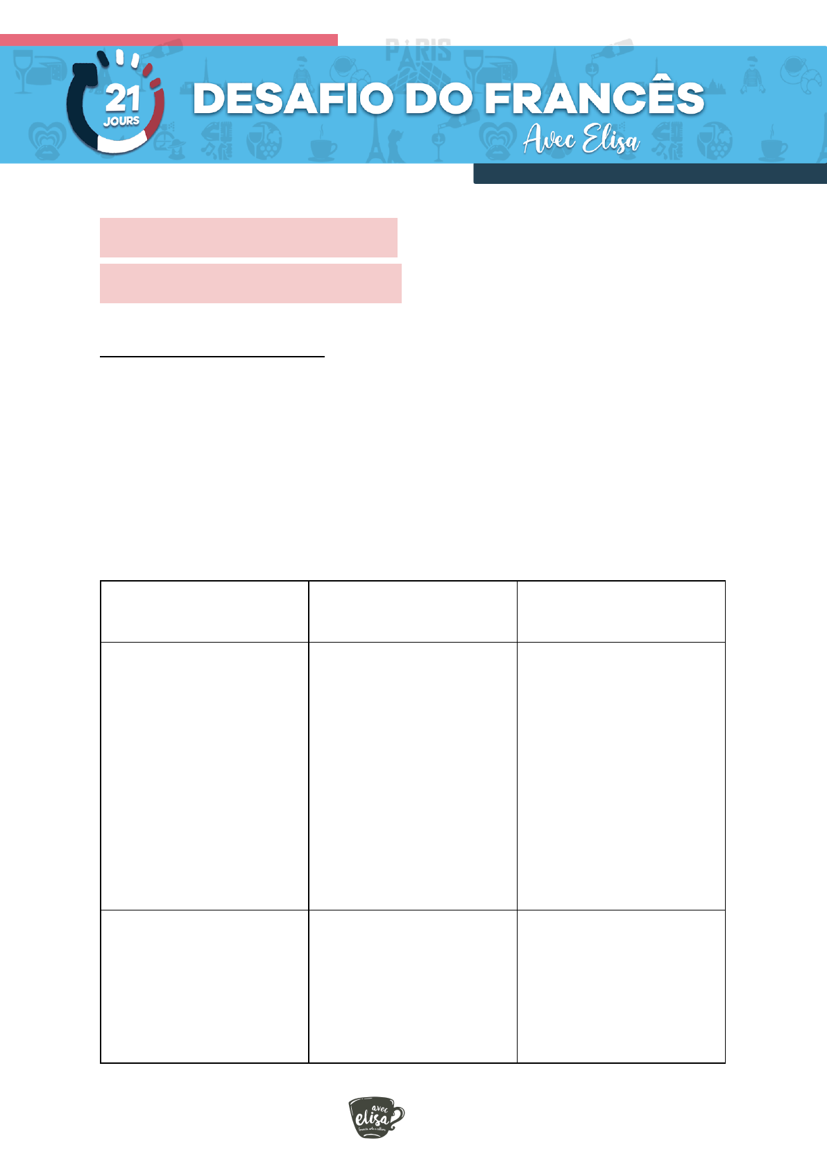 DESAFIO 6/ DÉFI 6 Faire face à un défi OBJETIVO DO DESAFIO Como a gente sai de um problema? De uma dificuldade? Eu sei que no aprendizado de um idioma nem tudo são flores, a gente passa por momentos de estagnação, a sensação de não entender nada, de não conseguir se comunicar, etc Hoje vamos ver como sair desta sensação! SENSAÇÃO PESSOAS NORMAIS VOCÊ A PARTIR DE AGORA Sensação de não entender NADA ● Ai socorro, desisto! ● Ai socorro! Eu não consigo. ● Nossa é muito difícil ● Se agarrar em palavras ou mesmo sons que você entende ou reconhece, como um/a caçador/a ● Tira o foco do problema e foca na solução A sensação de estagnação/ platô (plateau) ● ah eu nunca vou sair desse lugar, desse ponto ● Ah chega! Não quero mais. ● é normal, já aprendi muita coisa, mas o que dentro disso eu ainda não incorporei? 1 ● Criar desafios para entrar em movimento e assim sair do "plateau" = criar movimento ● "o que te trouxe até aqui não é o que vai te fazer dar o próximo passo. Sensação de não conseguir se comunicar ● Ah, eu sou ruim com idiomas ● Ah vou desistir ● Isso não é pra mim! ● Mas eu tenho tentado me comunicar com outras pessoas em francês? Tudo o que eu aprendo em um dia, esqueço no outro ● Ah eu não tenho memória boa! ● Ah eu sou ruim ● Eu esqueço ● Ah eu não estou ativando o meu francês ● Criar MOVIMENTO para ativar o seu francês! Sensação de não conseguir CONECTAR as coisas ● Ah eu sou ruim, burro, burra, eu não sirvo pra isso ● Vou desistir ATIVAR O FRANCÊS DE VOCÊS TODOS OS DIAS 2 DÉFi Nível avançado - Criar uma história com todas estas palavras. Nível intermediário - Criar 5 frases com todas estas palavras. Nível iniciante - criar 3 frases com algumas destas palavras (mínimo 5) Nível zero - você vai procurar o significado destas palavras escrever no caderno e se gravar falando estas palavras. TODOS OS NÍVEIS: Gravar um stories ou áudio lendo as palavras, as frases ou a história em voz alta. ● l'environnement - meio ambiente ● je t'avoue [chta-vu] - eu confesso ● dirigera - dirigir no futuro ● l'immatriculer - colocar a placa no carro, registrar o carro ● que j'y aille - que eu vá ● tout ce que je sais - Tudo o que eu sei ● moquette - carpete, estofamento ● Henri - nome ● Après - depois 3