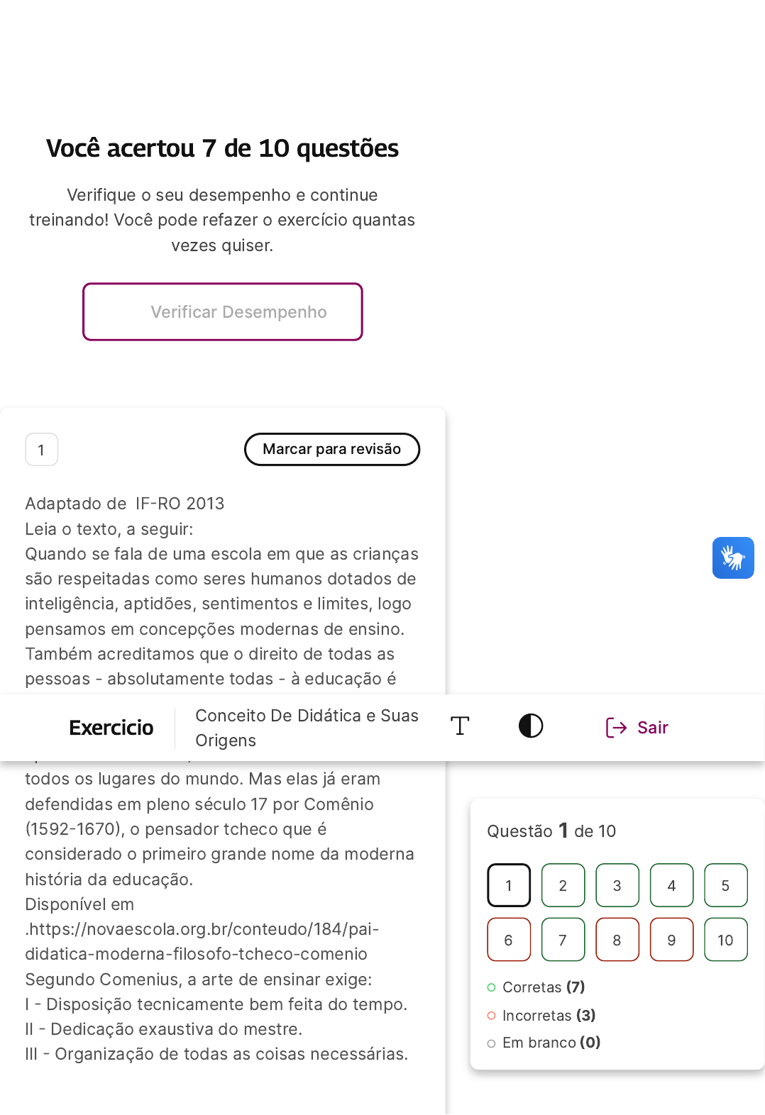 Você acertou 7 de 10 questões Verifique o seu desempenho e continue treinando! Você pode refazer o exercício quantas vezes quiser. Verificar Desempenho 1 Marcar para revisão Adaptado de IF�RO 2013 Leia o texto, a seguir: Quando se fala de uma escola em que as crianças são respeitadas como seres humanos dotados de inteligência, aptidões, sentimentos e limites, logo pensamos em concepções modernas de ensino. Também acreditamos que o direito de todas as pessoas - absolutamente todas - à educação é um princípio que só surgiu há algumas dezenas de anos. De fato, essas idéias se consagraram apenas no século 20, e assim mesmo não em todos os lugares do mundo. Mas elas já eram defendidas em pleno século 17 por Comênio �1592�1670�, o pensador tcheco que é considerado o primeiro grande nome da moderna história da educação. Disponível em .https://novaescola.org.br/conteudo/184/pai- didatica-moderna-filosofo-tcheco-comenio Segundo Comenius, a arte de ensinar exige: I � Disposição tecnicamente bem feita do tempo. II � Dedicação exaustiva do mestre. III � Organização de todas as coisas necessárias. Questão 1 de 10 Corretas �7� Incorretas �3� Em branco �0� 1 2 3 4 5 6 7 8 9 10 Exercicio Conceito De Didática e Suas Origens Sair A B C D E IV � Escolha do método adequado. V � Aptidão dos alunos. Está CORRETO o que se afirma apenas em: I, II e III. II, IV e V. I, III e IV. I, IV e V. I, II e IV. Resposta correta Parabéns, você selecionou a alternativa correta. Confira o gabarito comentado! Gabarito Comentado Comenius pensava uma ¿educação para todos¿ e com a colaboração de todos. Pensava numa educação de superação do estudo memorizado pregado pela escola tradicional. Ele enfatizava em sua didática Magna, que devem ser enviados às escolas não apenas os filhos dos ricos, mas todos por igual sem distinção. Além disso, sobre a arte de ensinar tudo a todos, ele destaca que a arte de ensinar não exige mais que uma disposição tecnicamente bem feita do tempo, das coisas e do método. A arte de ensinar demanda disposição para inovar e motivar os alunos para aprender. Afinal, os alunos de hoje estão conectados as tecnologias e têm A B C D E mais familiaridade com elas do que muitos professores. 2 Marcar para revisão De acordo com Comenius �1592 � 1670�, "um método Universal de se ensinar tudo a todos" se aplica ao conceito de: Pedagogia Ensino Didática Educação Aprendizado Resposta correta Parabéns, você selecionou a alternativa correta. Confira o gabarito comentado! Gabarito Comentado Comenius, um importante educador do século XVII, propôs a ideia de um "método universal de ensinar tudo a todos". Essa concepção se encaixa perfeitamente no conceito de Didática, que é a arte de ensinar e a ciência de criar métodos eficazes para a A B C educação. Portanto, a alternativa correta é a "C", que se refere à Didática. 3 Marcar para revisão A Didática é um elemento pedagógico imprescindível para a docência, seja ela em qualquer nível da escolarização ou modalidade (presencial ou a distância). A professora Cecília, que trabalha na Educação Básica, reconhece que a Didática auxilia no processo de escolha de estratégias adequadas para a prática pedagógica e que muitos são os elementos e fatores que interferem numa boa prática educativa. Nesse sentido, a docente defende ainda a importância de que o professor conheça o Projeto Político Pedagógico da escola e ainda: Que é desnecessária a preocupação com a didática, quando se trabalha na Educação Básica. Que no Ensino Fundamental, o mais importante é apenas uma boa avaliação da aprendizagem pautada numa pedagogia tradicional. Que é desnecessário um planejamento semanal se há um bom projeto político pedagógico na escola. D E Que ao planejar, o professor trabalhe os conteúdos exclusivamente do interesse das crianças. Que elabore o planejamento semanal de acordo com a realidade dos alunos e os recursos disponíveis na escola. Resposta correta Parabéns, você selecionou a alternativa correta. Confira o gabarito comentado! Gabarito Comentado A alternativa correta é a letra E. A professora Cecília defende a importância da Didática e do conhecimento do Projeto Político Pedagógico da escola. Além disso, ela ressalta a necessidade de elaborar o planejamento semanal de acordo com a realidade dos alunos e os recursos disponíveis na escola. Isso significa que o professor deve considerar o contexto em que os alunos estão inseridos e os materiais que tem à disposição para planejar suas aulas. Essa prática permite que o ensino seja mais efetivo, pois leva em consideração as necessidades e possibilidades dos alunos, além de otimizar o uso dos recursos disponíveis. Portanto, a Didática, o Projeto Político Pedagógico e o planejamento semanal são elementos fundamentais para uma boa prática educativa. 4 Marcar para revisão Leia o texto, a seguir: A B C Classicamente, a Didática é um campo de estudo, uma disciplina de natureza pedagógica aplicada, orientada para as finalidades educativas e comprometida com as questões concretas da docência, com as expectativas e os interesses dos alunos. Para tanto, requer um espaço teórico- prático, a fim de compreender a multidimensionalidade da docência, entendida como ensino em ato. Neste sentido, trazemos abaixo a definição de alguns autores sobre Didática? ALTHAUS, M. T. M; ZANON, D. P. Didática: questões de ensino. Ponta Grossa: Ed. UEPG/NUTEAD, 2009. p. 12�25 Marque a resposta correta: O objeto de estudo da didática é o processo de ensino-aprendizagem, ou seja, toda proposta didática está impregnada, implícita ou explicitamente, de uma concepção do processo de ensino-aprendizagem. O objeto de estudo da didática é basicamente o elemento da formação do professor, ou seja, regula, num sentido amplo, o comportamento de ser professor. O objeto de estudo 