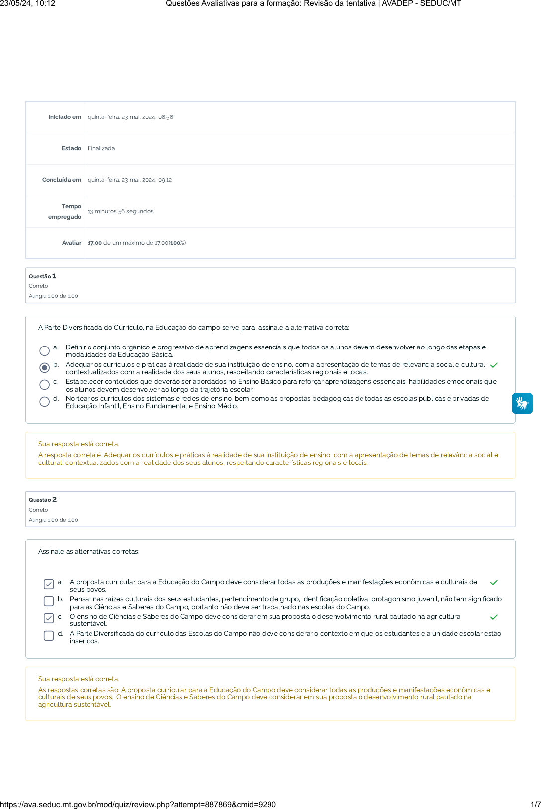 Iniciado em quinta-feira, 23 mai. 2024, 08:58 Estado Finalizada Concluída em quinta-feira, 23 mai. 2024, 09:12 Tempo empregado 13 minutos 56 segundos Avaliar 17,00 de um máximo de 17,00(100%) Questão 1 Correto Atingiu 1,00 de 1,00 Questão 2 Correto Atingiu 1,00 de 1,00 A Parte Diversi�cada do Currículo, na Educação do campo serve para, assinale a alternativa correta: ' a. De�nir o conjunto orgânico e progressivo de aprendizagens essenciais que todos os alunos devem desenvolver ao longo das etapas e modalidades da Educação Básica. ; b. Adequar os currículos e práticas à realidade de sua instituição de ensino, com a apresentação de temas de relevância social e cultural, contextualizados com a realidade dos seus alunos, respeitando características regionais e locais. ✓ ' c. Estabelecer conteúdos que deverão ser abordados no Ensino Básico para reforçar aprendizagens essenciais, habilidades emocionais que os alunos devem desenvolver ao longo da trajetória escolar. ' d. Nortear os currículos dos sistemas e redes de ensino, bem como as propostas pedagógicas de todas as escolas públicas e privadas de Educação Infantil, Ensino Fundamental e Ensino Médio. Sua resposta está correta. A resposta correta é: Adequar os currículos e práticas à realidade de sua instituição de ensino, com a apresentação de temas de relevância social e cultural, contextualizados com a realidade dos seus alunos, respeitando características regionais e locais. Assinale as alternativas corretas: K a. A proposta curricular para a Educação do Campo deve considerar todas as produções e manifestações econômicas e culturais de seus povos. ✓ L b. Pensar nas raízes culturais dos seus estudantes, pertencimento de grupo, identi�cação coletiva, protagonismo juvenil, não tem signi�cado para as Ciências e Saberes do Campo, portanto não deve ser trabalhado nas escolas do Campo. K c. O ensino de Ciências e Saberes do Campo deve considerar em sua proposta o desenvolvimento rural pautado na agricultura sustentável. ✓ L d. A Parte Diversi�cada do currículo das Escolas do Campo não deve considerar o contexto em que os estudantes e a unidade escolar estão inseridos. Sua resposta está correta. As respostas corretas são: A proposta curricular para a Educação do Campo deve considerar todas as produções e manifestações econômicas e culturais de seus povos., O ensino de Ciências e Saberes do Campo deve considerar em sua proposta o desenvolvimento rural pautado na agricultura sustentável. 23/05/24, 10:12 Questões Avaliativas para a formação: Revisão da tentativa | AVADEP - SEDUC/MT https://ava.seduc.mt.gov.br/mod/quiz/review.php?attempt=887869&cmid=9290 1/7 Questão 3 Correto Atingiu 1,00 de 1,00 Questão 4 Correto Atingiu 1,00 de 1,00 Questão 5 Correto Atingiu 1,00 de 1,00 Como conceito principal existem diversos tipos de empreendedorismo. Nesta formação apresentamos o empreendedorismo social, por meio do Projeto Hortas Escolares que são desenvolvidos nas unidades escolares do Campo e Quilombola. De acordo com o estudado, assinale a alternativa que não corresponde a uma ação empreendedora quando se aborta a temática do estudo das hortas escolares: ; a. Proibição da utilização do recurso arrecadado com o projeto hortas escolares para realizar uma atividade complementar com os estudantes e/ou continuar com a manutenção da horta na unidade escolar. ✓ ' b. Possibilitar que os estudantes participem no desenvolvimento da horta, aliando a parte técnica e teórica aos conhecimentos da Base Nacional Comum Curricular – BNCC. ' c. Envolver a comunidade em momentos de exposições de resultados sobre os cuidados com a saúde e melhoria da qualidade nutricional. ' d. Fazer estimativas de produção, consumo e lucro obtido com o desenvolvimento do projeto hortas na unidade escolar. Sua resposta está correta. A resposta correta é: Proibição da utilização do recurso arrecadado com o projeto hortas escolares para realizar uma atividade complementar com os estudantes e/ou continuar com a manutenção da horta na unidade escolar. Conforme foi disponibilizado neste módulo e de acordo com a Resolução Normativa Nº 003/2013-CEEMT, que trata da Educação do Campo, no Estado de Mato Grosso. É correto a�rmar que, a opção que contém os princípios da Educação do Campo é: I. Flexibilidade na organização escolar: por meio de adequação do calendário escolar às fases sazonais e às condições climáticas; formas diversas de organização curricular, inclusive da pedagogia da alternância, de acordo com a realidade da comunidade; II. Acesso a serviços públicos educacionais, sem qualquer discriminação, em razão da nacionalidade e da condição migratória; III. Valorização da identidade da escola do campo e no campo, como espaço público de investigação, socialização de experiências e saberes, construção de conhecimentos objetivando o desenvolvimento sociocultural, economicamente justo e ambientalmente sustentável; IV. Liberdade de aprender, ensinar, pesquisar e divulgar o pensamento, a arte e o saber; V. Articulação da educação com o mundo do trabalho, de acordo com as diretrizes curriculares vigentes, as metas e objetivos estabelecidos no Plano Nacional e Estadual de Educação e o disposto nesta Resolução; ' a. II, III e V ' b. I, II, III, IV; ; c. I, III e V ✓ ' d. I, III e IV; Sua resposta está correta. A resposta correta é: I, III e V Conforme o artigo 26 da Lei de Diretrizes e Bases da Educação Nacional, Lei nº 9.394/96, os currículos da educação básica devem contemplar a Base Nacional Comum Curricular – BNCC. Em dezembro de 2017, o Conselho Nacional de Educação a aprovou. Sobre esse tema, todavia é correto a�rmar que a BNCC logo seja um documento de caráter: ' a. re�exivo, uma vez que de�ne o conjunto normativo orgânico e progressivo de aprendizagens essenciais como direito das crianças, joven