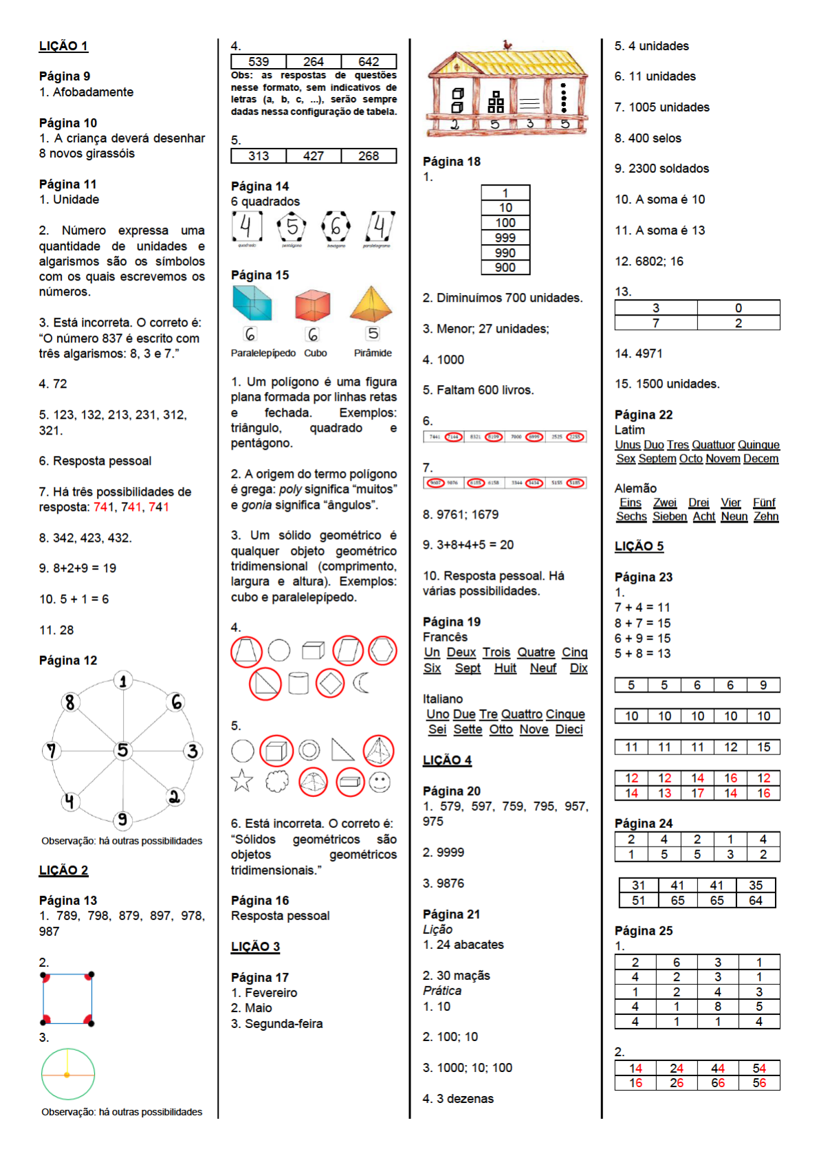 3. 32 57 54 78 Página 26 4. 38 57 74 86 5. 6. LIÇÃO 6 Página 27 1. 54 61 64 82 6+4+8+2 = 9+3+1+7 = 10+10 = 10+10 = 20 20 Página 28 1. a) parcelas; soma b) fatores; produto 3. 20 Página 29 9 9 7 7 6 6 9 10 10 10 10 11 12 12 14 11 13 18 16 13 Página 30 1. Propriedade comutativa da adição Propriedade comutativa da multiplicação 2. Resposta pessoal 3. 13 18 16 21 19 19 21 20 17 19 15 15 4. 20 30 20 30 Página 31 5. 40 40 70 80 70 80 80 60 6. 2 + 4 = 6 4 + 2 = 6 parcelas; soma comutativa da adição 7. 41 20 10 60 40 80 70 90 LIÇÃO 7 Página 32 1. 60 30 40 80 Página 33 35 27 28 36 29 Página 34 1. Obs.: a pintura do restante da estrela é pessoal. 2. 30 30 30 Página 35 1. 35 29 28 26 29 35 30 32 30 31 30 30 29 33 36 Página 36 109 108 LIÇÃO 8 Página 37 1. 34 27 36 Página 38 1. 446 775 779 889 2. 675 595 783 731 Página 39 A) 20 B) 30 C) 15 D) 22 E) 20 F) 38 Página 40 3. 280 162 484 618 4. 373 428 557 618 5. LIÇÃO 9 Página 41 1. 5 1 2 6 5 2 1 3 3 8 Página 42 1. 271 235 332 455 2. 330 431 610 702 Página 43 10 15 12 14 11 13 11 13 13 13 14 16 10 12 13 12 16 18 11 13 Página 44 3. 636 810 922 758 400 600 610 820 631 687 444 940 593 591 449 907 Prática extra 585 910 982 823 901 1689 1218 1321 LIÇÃO 10 Página 45 1. 3 4 1 5 6 1 1 8 4 7 Página 46 1. 4 2 2 5 1 2 2 5 1 1 3 4 8 7 1 2. 1111 1222 1333 1444 Página 47 3. 363 284 490 591 4. 622 552 420 643 5. 1621 1556 1756 1776 1 reagrupamento 2 reagrupamentos 3 reagrupamentos Prática extra 1482 6792 7992 1832 2602 1892 9262 1292 Página 48 13 17 9 16 14 12 15 13 13 16 17 14 15 14 17 11 12 14 18 11 LIÇÃO 11 Página 49 1. 15 – 6 = 9 15 – 7 = 8 15 – 8 = 7 15 – 9 = 6 Nível 1 7 4 3 2 4 Nível 2 6 9 8 9 6 Nível 2 9 6 6 5 7 6 8 4 7 9 Página 50 1. a) 8 b) 9 c) 31 – 15 = 16 d) 100 – 30 = 70 2. 4 6 8 10 12 14 16 18 3. 5 7 9 11 13 15 17 19 4. 2 3 4 5 6 7 8 9 5. 1 2 3 4 5 6 7 8 6. Em ambos os exercícios, os resultados vão aumentando de 2 em 2. Há também o padrão de conjunto: 3, 4, 5, 6, 7, 8, 9. No exercício 2, o resultado das adições é o dobro de cada uma das parcelas, e todos são números pares. No exercício 3, o resultado das adições são todos números ímpares. Página 51 7. 13 6 9 7 7 6 4 9 6 3 7 8 4 9 5 7 5 5 8 6 6 6 8 4 7 8 5 9 8. 7 8 9 6 9. 10 12 11 12 10. 7 16 8 14 8 13 Página 52 2 2 3 2 5 1 9 4 5 1 1 3 1 6 0 5 5 10 3 7 LIÇÃO 12 Página 53 1. 16 – 9 = 7 15 – 9 = 6 14 – 9 = 5 13 – 9 = 4 Página 54 1. 7 6 9 8 5 8 7 5 9 6 9 8 7 5 7 2. 14 – 6 = 8 → 6 para 10, 4 10 para 14, 4 4 + 4 = 8 13 – 7 = 6 → 7 para 10, 3 10 para 13, 3 3 + 3 = 6 Página 55 3. a) 9 b) 5 c) 7 d) 8 e) 6 f) 9 g) 6 h) 8 i) 7 j) 5 k) 7 l) 5 m) 9 n) 8 o) 9 4. 26 – 12 = 14 5. 15 – 7 8 6. 7 7 8 8 7. 13 14 12 11 8. 3 5 5 5 Página 56 1. 2. Resposta pessoal 3. Página 57 5 9 6 8 6 7 1 6 3 5 7 7 4 6 6 7 2 5 4 7 LIÇÃO 13 Página 58 1. 9 7 5 8 Página 59 2. 17 26 39 48 75 Página 60 1. a) 8 b) 16 c) 5 d) 32 e) 34 – 27 34 – 27 = 7 7 2. 315 3. 143 4. 665 5. 450 6. 0 7. 38 44 23 86 65 26 37 48 59 64 119 206 323 439 528 86 217 308 409 515 Página 61 2 3 2 4 5 4 4 5 8 7 3 7 2 3 7 11 8 10 9 9 Página 62 1. 8000 → 7800 → 7780 ↓ 5677 ← 5777 ← 7777 ↓ 5557 → 5555 → 4000 ↓ 3333 ← 3340 ← 3400 LIÇÃO 14 Página 63 1. 17 28 38 77 Página 64 1. 6 9 7 4 7 7 7 5 8 5 9 9 8 6 9 6 8 8 2. 226 318 457 309 215 Página 65 3. 4. 261 171 283 390 142 316 422 172 231 173 Página 66 A) 27 B) 33 C) 43 D) 19 E) 38 F) 27 LIÇÃO 15 Página 67 1. 8 8 8 9 7 9 3 5 5 5 9 7 2556 2536 2236 1236 Página 68 1. a) 3156; 600 unidades b) 2412; 50 unidades c) Decompomos 1 centena em 10 dezenas, ficando com 13 dezenas: 13 dezenas menos 4 dezenas é igual a 9 dezenas. 2. 1226 2318 1457 5309 4215 3332 6131 6102 4417 7108 6281 9205 7628 9305 4319 7818 7279 3205 9313 1224 Página 69 1. 9 6 3 8 8 9 6 4 9 7 9 8 6 9 5 2. 108 105 118 103 109 118 103 116 124 117 96 76 74 74 84 89 83 65 98 101 92 190 250 300 0 LIÇÃO 16 Página 70 1. 6 2 5 3 2 5 3 6 1 3 60 100 200 Página 71 1. 20 +2 80 +3 10 -1 40 -3 20 +1 90 -1 30 -2 80 -2 40 -2 60 +2 50 +1 40 +3 20 -1 60 -1 2. 70 60 → 70 90 70 → 90 50 30 → 50 70 40 → 70 70 50 → 70 50 40 → 50 150 +1 130 → 150 150 131 140 → 150 Página 72 A) 242 B) 681 C) 393 D) 365 E) 307 F) 881 LIÇÃO 17 Página 73 1. 70 70 150 58 56 → 58 Página 74 1. 37 33 → 37 70 66 → 70 59 54 → 59 69 66 → 69 75 74 → 75 146 144 → 146 166 132+30 162 → 166 187 141 181 +6 187 177 153+20 173 +4 177 2. 52 3. 104 4. 1145 5. 5337 6. 70 30 60 90 70 80 190 190 150 Página 75 LIÇÃO 18 Página 76 Estratégia1 80 70 → 80 100 80 → 100 Estratégia 2 99 95 → 99 95 94 → 95 1. 80 70 150 190 2. 87 78 176 178 3. Estratégia 1 200 Estratégia 2 267 Estratégia 2 196 Estratégia 1 250 Página 77 4. LIÇÃO 19 Página 78 1. 236 154 401 43 45 → 43 Página 79 1. 20 -1 10 -1 30 -2 40 -4 50 -2 70 -3 2. 23 24 → 23 37 39 → 37 35 38 → 35 71 94 74 -3 71 66 97-30 67 → 66 141 177-30 147 -6 141 3. Página 80 1. 2 7 5 4 2. 24 27 → 24 33 38 → 33 32 33 → 32 71 99 79 -8 71 63 97-30 67 → 63 130 178-40 138 -8 130 3. LIÇÃO 20 Página 81 112 39 249 44 +40 100 +4 104 Página 82 1. 100 + 1 100 + 2 200 + 3 400 + 5 300 + 3 2. 65 +60 100 +5 105 77 +70 100 +7 107 28 +20 100 +8 108 22 +12 100 +10 110 31 11 100 +20 120 Página 83 1. LIÇÃO 21 Página 84 Estratégia 1 63 65 → 63 114 119 → 114 Estratégia 2 48 +8 40 +40 80 37 +25 100 +12 112 1. 67 13 142 130 2. 10 20 35 50 3. Estratégia 2 58 Estratégia 1 40 Estratégia 2 28 Estratégia 1 112 Página 85 4. LIÇÃO 22 Página 86 1. 5284 3023 14617 2. 217 1077 1823 3. 8ª linha, 11ª coluna Página 87 A) 885 B) 580 C) 847 D) 916 E) 915 F) 838 Página 88 1) 1 2 2) 1 4 3) Daniel comeu 1 4 e Ágatha comeu 1 8 Página 90 1. i) numerador; denominador; um meio ii) numerador; denominador; dois terços iii) numerador; denominador; três sétimos iv) numerador; denominador; oito nonos 2. 1 4 3 4 4 4 Obs: há outras formas de divisão e de pintura. 3. 3 4 3 6 4 10 Página 91 1. i) 2 