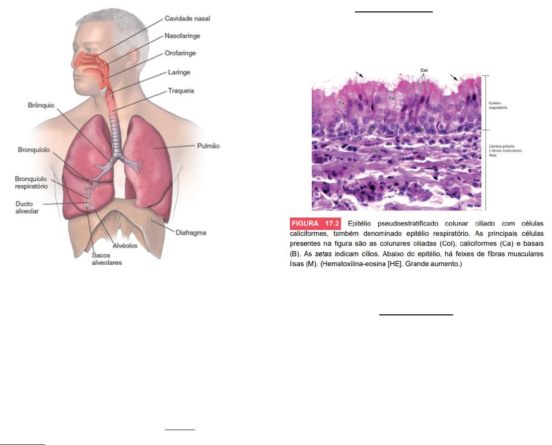 Sistema Respiratório Visão geral do Sistema Respiratório O sistema respiratório é constituído pelos pulmões e por um sistema de tubos que comunicam estes órgãos com o meio exterior. → Funções principais: condução de ar, filtração de ar e trocas gasosas (respiração). Distinguem-se no sistema respiratório duas porções com atividades funcionais distintas: - A porção condutora: cavidade nasal, nasofaringe, laringe, traqueia, brônquios, bronquíolos; - A porção respiratória é a parte do trato respiratório em que ocorre a troca gasosa: bronquíolos respiratórios, ductos alveolares, sacos alveolares, alvéolos; 1. Porção condutora: lúmen constantemente aberto; seguintes tecidos: osso, cartilagem, tecido conjuntivo e tecido muscular liso. 2. Porção respiratória: Nesses locais ocorrem as trocas de gases entre o sangue e o ar. - O ar que passa através das vias respiratórias precisa ser condicionado antes de alcançar as unidades respiratórias terminais. - O condicionamento do ar ocorre na porção condutora do sistema respiratório e inclui: aquecimento, umedecimento e a remoção de materiais particulados. → Mucosa respiratória (tec. Epitelial – avascular- com lâmina própria abaixo – tec. Conjuntivo frouxo = suporte e vascularização): função no condicionamento do ar, umedecendo e aprisionam partículas que passaram pelas Vibrissas, pelos espessos e curtos especiais. Também impede desidratação do epitélio subjacente decorrente da movimentação de ar. O muco cobre quase toda a superfície luminal das vias condutoras, e é continuamente produzido por células caliciformes e por glândulas secretoras de muco localizadas nas paredes das vias respiratórias. O muco e outras secreções são movidos em direção à faringe por meio de movimentos coordenados de varredura promovidos pelos cílios e, em seguida, são normalmente deglutidos EPITÉLIO RESPIRATÓRIO A maior parte da porção condutora é revestida internamente por um epitélio pseudoestratificado colunar ciliado com células caliciformes, denominado epitélio respiratório. CAVIDADES NASAIS - As duas câmaras das cavidades nasais são divididas em vestíbulo do nariz (entrada das cavidades nasais), região respiratória e região olfatória; - A região respiratória é revestida pela mucosa respiratória, que contém um epitélio pseudoestratifica- do colunar ciliado; - O epitélio respiratório é composto de células colunares altas com cílios (promovem o movimento da secreção e de outras partículas na superfície mucosa), células caliciformes (secretam muco), células em escova (respondem pela inervação sensorial), células de pequenos grânulos (células enteroendócrinas que secretam hormônios e citocinas) e células basais (células tronco). - A região olfatória localiza-se no teto da cavidade nasal e é revestida por um epitélio pseudoestratificado olfatório que não contem células caliciformes; - O epitélio olfatório é composto de células receptoras olfatórias (neurônios bipolares), células de sustentação, células em escova e células basais; - As células receptoras olfatórias contem cílios apicais imóveis, que dispõe de receptores acoplados à proteína G envolvidos na via de transdução olfatória; - As glândulas olfatórias (de Bowman) são glândulas características da mucosa olfatória. - Região olfatória da cavidade nasal FARINGE E LARINGE - A faringe é uma continuação posterior das cavidades nasal e oral. Atua como uma via de passagem para alimento para dentro do esôfago e de entrada do ar para dentro da laringe; - É dividida em duas partes: parte nasal da faringe (nasofaringe) e parte oral da faringe (orofaringe); - A concentração de nódulos linfáticos na junção entre as paredes superior e posterior da faringe é denominada tonsila faríngea; - A laringe é uma conexão entre a faringe e a traqueia. Contém pregas vocais que controlam o fluxo de ar através da laringe. Sua vibração produz som; - A laringe é revestida por mucosa respiratória, exceto na superfície luminal das pregas vocais, que é coberta por epitélio estratificado pavimentoso. TRAQUEIA - A traqueia estende-se da laringe até o mediastino, em que se divide nos dois brônquios principais (primários); - O lúmen da traqueia permanece aberto devido aos anéis cartilaginosos; - A parede da traqueia consiste em quatro camadas: • A mucosa, composta por epitélio pseudoestratificado cilíndrico ciliado com células caliciformes que repousa sobre uma membrana basal espessa rica em fibras elásticas; • A submucosa, tec. Conjuntivo denso não modelado; • A camada cartilaginosa, cartilagem hialina contínua em formato de C; • A adventícia, une a traqueia às estruturas adjacentes (se mistura com a adventícia de outras estruturas). Setas: espaços medulares do tec. Ósseo - Traqueia humana BRÔNQUIOS E BRONQUÍOLOS - A traqueia divise-se nos brônquios principais (primários) direito e esquerdo, que entram nos pulmões e ramifica-se extensamente até o nível dos bronquíolos; - Os brônquios são revestidos de mucosa respiratória com a mesma composição celular da traqueia. Contém placas de cartilagem e uma camada de musculo liso; - Os bronquíolos são ramos dos brônquios segmentares com 1 mm ou menos de diâmetro e não contém placas de cartilagem nem glândulas; - Os menores bronquíolos terminais condutores são revestidos de epitélio simples cuboide contendo células de Clara. Essas células produzem um agente tensoativo, que impede o colapso das vias respiratórias; - Os bronquíolos respiratórios constituem a primeira porção da árvore bronquial que possibilita a troca gasosa. → Na sua porção inicial, os brônquios apresentam a mesma estrutura histológica geral que a traqueia. A partir de sua entrada nos pulmões, onde irão se constituir os brônquios intrapulmonares (fragmentação da cartilagem hialina), a estrutura da parede brôn