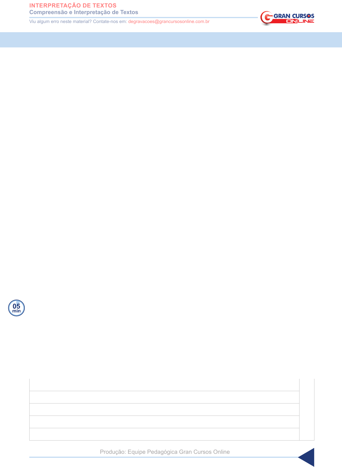 1 www.grancursosonline.com.br Compreensão e Interpretação de Textos INTERPRETAÇÃO DE TEXTOS Viu algum erro neste material? Contate-nos em: degravacoes@grancursosonline.com.br Produção: Equipe Pedagógica Gran Cursos Online COMPREENSÃO E INTERPRETAÇÃO DE TEXTOS Esta aula visa abordar a compreensão e a interpretação de textos, temas que, apesar de parecerem intuitivos para candidatos com hábito de leitura, devem ser aprimorados com o estudo e a realização de exercícios. Assim, a proposta desse curso é conceder subsídios teóricos e práticos para que seja aprimorada a abor- dagem aos textos durante a realização da prova, inclusive com técnicas para a análise e a interpretação de textos mais complexos, às vezes com uma constru- ção de difícil entendimento a qual pode dificultar o acesso às ideias e à própria opinião do autor. COMPREENSÃO Reconhecimento das informações expressas no texto. Questões desse tipo são consideradas mais simples, uma vez que se faz necessário apenas que o candidato busque informações as quais já estão compreendidas (expressas) na superficialidade do texto. Itens de compreensão trazem comandos que repor- tam ao texto, como estes: • “De acordo com o texto...” • “Segundo o texto...” • “O autor afirma...” • “O autor diz...” INTERPRETAÇÃO Apreensão da mensagem contida nas entrelinhas do texto, não expressas de maneira direta. • Itens de interpretação trazem comandos semelhantes aos seguintes: • “Infere-se do texto...” • “Depreende-se do texto...” • “É possível concluir a partir das ideias do texto...” • “O texto permite concluir...” AN O TAÇ Õ ES 2 www.grancursosonline.com.br AN O TA Ç Õ ES Compreensão e Interpretação de Textos INTERPRETAÇÃO DE TEXTOS Viu algum erro neste material? Contate-nos em: degravacoes@grancursosonline.com.br Produção: Equipe Pedagógica Gran Cursos Online Atenção! Diante dos exemplos de comandos para ambas as situações, é possível, com a leitura do enunciado, identificar se a questão trata da compreensão ou da interpretação textual. Imparcialidade do Leitor Durante a prova, ao realizar a leitura de um texto, é comum para os candida- tos trazer à tona vivências da vida pessoal e opiniões próprias que, por vezes, podem destoar do exposto (defendido) pelo autor do texto. Durante a leitura, compreensão e análise textual, o candidato deve abster-se de opiniões pes- soais para que tenha acesso somente às informações relevantes contidas no texto, uma vez que estas possibilitam a resolução das questões relacionadas. De forma resumida, o texto deve permitir (conceder subsídios) que se trace qual- quer conclusão relacionada. EXERCÍCIOS 1. Quando cheguei à estação, o trem já partira. A certa do texto, julgue as seguintes afirmativas: a. De acordo com o texto, o trem deixou a estação em momento anterior à chegada do personagem. Comentário A informação utilizada para resolução da questão encontra-se expressa no texto, uma vez que o próprio personagem afirma que o trem já havia partido. b. Infere-se do texto que o personagem perdeu a viagem que faria. 3 www.grancursosonline.com.br AN O TAÇ Õ ES Compreensão e Interpretação de Textos INTERPRETAÇÃO DE TEXTOS Viu algum erro neste material? Contate-nos em: degravacoes@grancursosonline.com.br Produção: Equipe Pedagógica Gran Cursos Online Comentário É necessário que o texto conceda subsídios para que o leitor chegue à dada conclusão com alguma segurança. Desconsiderando os conhecimentos externos ao texto, não é possível concluir que o personagem do texto perdeu uma suposta viagem que faria, uma vez que não estão expressos os objetivos da ida dele à estação de trem. c. O texto permite concluir que o personagem desejava chegar à estação antes de o trem partir. Comentário Se o horário de partida do trem não interessasse ao autor dessa frase (personagem), ele não teria citado a partida do trem. Assim, ainda que não seja possível auferir os objetivos do personagem, sabe-se que a partida do trem possui alguma relevância para ele, indicando seu desejo de ver o trem na estação. Hoje, todos reconhecem, porque Marx impôs esta demonstração no Livro II d’O Capital, que não há produção possível sem que seja assegurada a reprodução das condições materiais da produção: a reprodução dos meios de produção. Qualquer economista, que neste ponto não se distingue de qualquer capitalista, sabe que, ano após ano, é preciso prever o que deve ser substituído, o que se gasta ou se usa na produção: matéria-prima, insta- lações fixas (edifícios), instrumentos de produção (máquinas) etc. Dizemos: qualquer economista é igual a qualquer capitalista, pois ambos exprimem o ponto de vista da empresa. Louis Althusser. Ideologia e aparelhos ideológicos do Estado. 3.a ed. Lisboa: Pre- sença, 1980 (com adaptações). 4 www.grancursosonline.com.br AN O TA Ç Õ ES Compreensão e Interpretação de Textos INTERPRETAÇÃO DE TEXTOS Viu algum erro neste material? Contate-nos em: degravacoes@grancursosonline.com.br Produção: Equipe Pedagógica Gran Cursos Online 2. No texto, os termos “matéria-prima”, “instalações fixas (edifícios)” e “instru- mentos de produção (máquinas)” são exemplos de “meios de produção”. Comentário Ao realizar a leitura, o candidato deve estar atento à relação estabelecida pela questão entre os diversos exemplos de meios de produção contidos no texto. Recomenda-se realizar a marcação de tais termos no próprio texto. 3. Infere-se do texto que todo economista é capitalista, mas o inverso não é verdadeiro, pois nem todo capitalista é proprietário de empresa. Comentário O texto não dispõe elementos que possam construir a afirmação proposta pelo enunciado do item. Dicas de Leitura 1. Não leia prontamente o texto. Verifique primeiramente os itens/questões, bem como a r