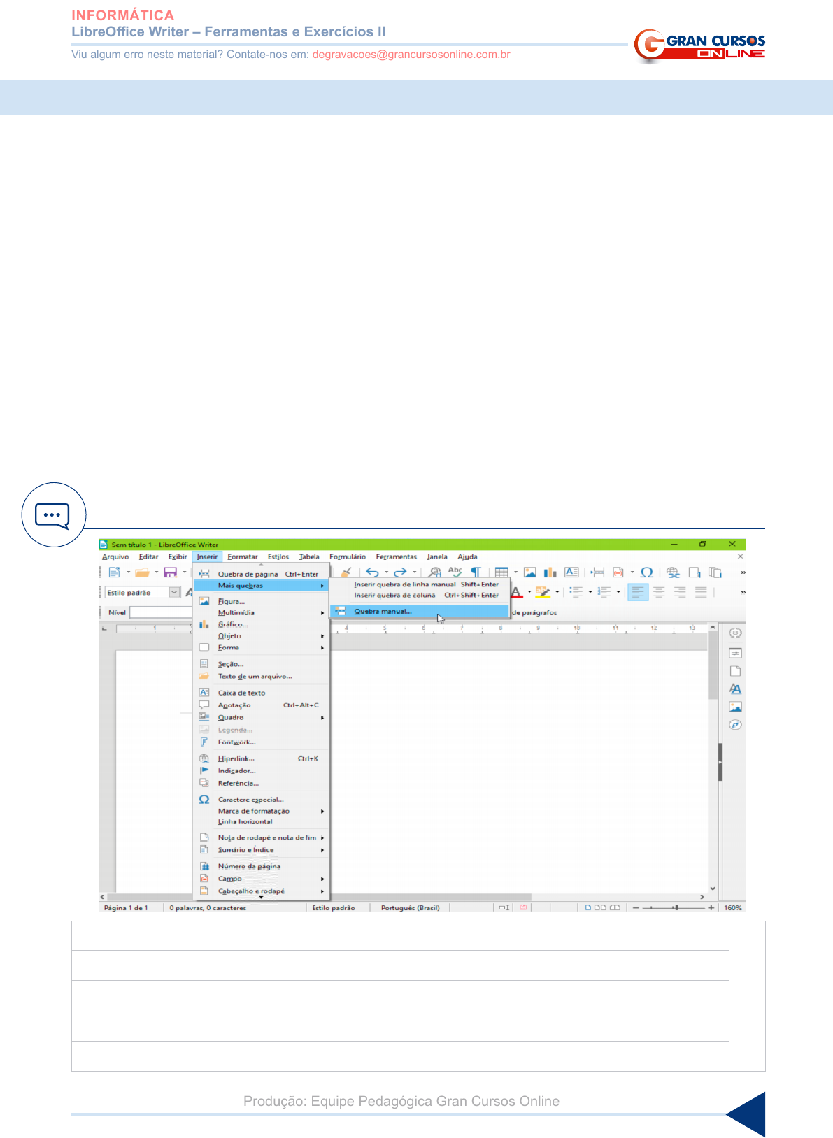 1 www.grancursosonline.com.br AN O TAÇ Õ ES LibreOffice Writer – Ferramentas e Exercícios II INFORMÁTICA Viu algum erro neste material? Contate-nos em: degravacoes@grancursosonline.com.br Produção: Equipe Pedagógica Gran Cursos Online LIBREOFFICE WRITER – FERRAMENTAS E EXERCÍCIOS II 1. (AOCP/TRT.1/TÉCNICO) Durante a edição de um arquivo de texto composto por muitas páginas e capítulos, alguns desses capítulos não preenchem to- talmente a sua última página, deixando-a com uma porção em branco, sendo que todo capítulo novo deve começar no início de uma nova página. Utilizan- do a ferramenta de edição de texto do LibreOffice, ao terminar de escrever um capítulo que terminou no meio da página atual, qual das opções do menu “Inserir” oferece o recurso adequado para ir para a próxima página, onde se iniciará o novo capítulo? a. Seção. b. Quebra manual. c. Cabeçalho. d. Rodapé. e. Nota de rodapé / Nota de fim. Comentário http://www.grancursosonline.com.br 2 www.grancursosonline.com.br AN O TA Ç Õ ES LibreOffice Writer – Ferramentas e Exercícios II INFORMÁTICA Viu algum erro neste material? Contate-nos em: degravacoes@grancursosonline.com.br Produção: Equipe Pedagógica Gran Cursos Online 2. (UFPR/UFPR/ASSISTENTE) Para o acompanhamento de alterações em um documento no LibreOffice Writer (geralmente utilizado para revisão ou edição de textos), é necessário ativar a gravação de mudanças. Assinale a alternati- va que apresenta o caminho para a ativação dessa funcionalidade. a. Arquivo→Propriedades→Controlar mudanças b. Editar→Registrar alterações→Registrar c. Editar→ Mostrar Marcações d. Revisão→Mostrar Marcações e. Revisão→Controlar alterações http://www.grancursosonline.com.br 3 www.grancursosonline.com.br AN O TAÇ Õ ES LibreOffice Writer – Ferramentas e Exercícios II INFORMÁTICA Viu algum erro neste material? Contate-nos em: degravacoes@grancursosonline.com.br Produção: Equipe Pedagógica Gran Cursos Online Comentário 3. (CESPE/IFF/TÉCNICO) Considerando a imagem precedente, que ilustra par- te da janela de edição de um documento no LibreOffice Writer 5.3, assinale a opção que apresenta procedimento correto para inserir uma nova linha na tabela, com duas colunas, a qual terá a função de cabeçalho da tabela. a. Posicionar o cursor do mouse imediatamente antes da palavra Arquitetura e pressionar a tecla ENTER. b. Selecionar a primeira linha da tabela e pressionar a tecla ENTER. c. Selecionar a primeira linha da tabela e pressionar as teclas CTRL+I. http://www.grancursosonline.com.br 4 www.grancursosonline.com.br LibreOffice Writer – Ferramentas e Exercícios II INFORMÁTICA Viu algum erro neste material? Contate-nos em: degravacoes@grancursosonline.com.br Produção: Equipe Pedagógica Gran Cursos Online d. Clicar com o botão direito do mouse sobre a palavra Arquitetura; no menu disponibilizado, escolher opção que permite inserir linhas acima. e. Selecionar toda a tabela e pressionar a tecla ENTER. Comentário 4. (UEM/UEM/TÉCNICO) Considerando o editor de texto LibreOffice/BrOffice Writer, é possível transformar um texto que foi digitado em uma coluna para duas colunas. Para tanto, deve-se selecionar o texto e clicar no Menu a. Editar – Colunas – 2 colunas – Ok. http://www.grancursosonline.com.br 5 www.grancursosonline.com.br LibreOffice Writer – Ferramentas e Exercícios II INFORMÁTICA Viu algum erro neste material? Contate-nos em: degravacoes@grancursosonline.com.br Produção: Equipe Pedagógica Gran Cursos Online b. Inserir – Colunas – 2 colunas – Ok. c. Ferramentas – Colunas – 2 colunas – Ok. d. Exibir – Colunas – 2 colunas – Ok. e. Formatar – Colunas – 2 colunas – Ok.v Comentário 5. (COPESE/UFT/UFT/TÉCNICO) sobre os atalhos de teclado do libreoffice writer, para windows com a configuração padrão de instalação, é incorreto afirmar que: a. o atalho Ctrl+O lança a caixa de diálogo Abrir para abrir um documento. http://www.grancursosonline.com.br 6 www.grancursosonline.com.br LibreOffice Writer – Ferramentas e Exercícios II INFORMÁTICA Viu algum erro neste material? Contate-nos em: degravacoes@grancursosonline.com.br Produção: Equipe Pedagógica Gran Cursos Online b. o atalho Shift+Del abre a caixa de diálogo para impressão do documento. c. o atalho Ctrl+S permite salvar o documento atual. d. o atalho Ctrl+N permite criar um novo documento. 6. (SUGEP/UFRPE/TÉCNICO) Em relação ao editor de texto Writer, do LibreO- ffice 6.0, assinale a alternativa correta. a. O LibreOffice Writer armazena informações bibliográficas em banco de da- dos bibliográficos ou em um documento individual. b. Para armazenar informações em banco de dados bibliográficos, deve-se escolher a guia Ferramentas – o botão Banco de dados bibliográficos – a opção Inserir – Registrar – Salvar. c. Para inserir entradas bibliográficas a partir do Banco de dados bibliográfi- cos, deve-se escolher a guia Inserir – o botão Sumário e índices – a opção Entrada do Banco de dados bibliográficos. d. Para inserir uma quebra manual, deve-se escolher a guia Inserir – o botão Quebra de página. e. A guia Inserir – o botão Anotação ou a combinação de teclas Ctrl+Alt+A inserem uma anotação na posição do cursor. Comentário http://www.grancursosonline.com.br 7 www.grancursosonline.com.br AN O TAÇ Õ ES LibreOffice Writer – Ferramentas e Exercícios II INFORMÁTICA Viu algum erro neste material? Contate-nos em: degravacoes@grancursosonline.com.br Produção: Equipe Pedagógica Gran Cursos Online http://www.grancursosonline.com.br 8 www.grancursosonline.com.br AN O TA Ç Õ ES LibreOffice Writer – Ferramentas e Exercícios II INFORMÁTICA Viu algum erro neste material? Contate-nos em: degravacoes@grancursosonline.com.br Produção: Equipe Pedagógica Gran Cursos Online GABARITO 1. b 2. b 3. d 4. e 5. b 6. a ���������