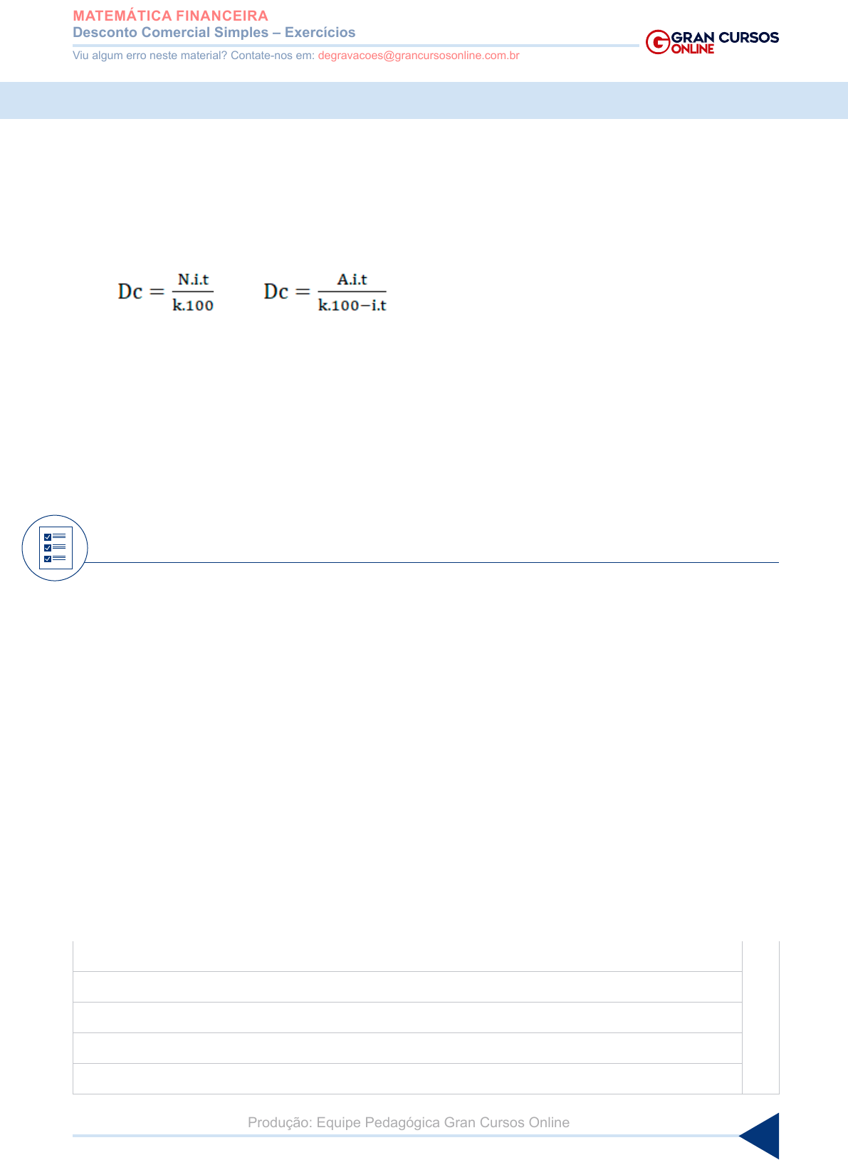 1 www.grancursosonline.com.br Desconto Comercial Simples – Exercícios MATEMÁTICA FINANCEIRA Viu algum erro neste material? Contate-nos em: degravacoes@grancursosonline.com.br Produção: Equipe Pedagógica Gran Cursos Online DESCONTO COMERCIAL SIMPLES – EXERCÍCIOS DESCONTO COMERCIAL SIMPLES OU DESCONTO POR FORA SIMPLES A taxa de desconto simples é calculada sobre o valor nominal do título. Existem duas fórmulas para calcular o desconto: ou • DC: desconto comercial ou desconto “por fora”; • N: valor nominal; • k: karrapato; • A: valor atual; • ic: taxa comercial simples; • t: tempo de antecipação. Direto do concurso 1. (FGV/BANESTES/ASSISTENTE SECURITÁRIO – BANESTES SEGU- ROS/2018) Um título de valor nominal igual a R$ 12.000,00 sofre desconto comercial simples dois meses antes do seu vencimento. Se a taxa de descon- to é de 54% ao ano, o valor líquido recebido nessa operação corresponde a: a. R$ 1.080,00 b. R$ 2.160,00 c. R$ 5.520,00 d. R$ 10.920,00 e. R$ 11.460,00 AN O TAÇ Õ ES http://www.grancursosonline.com.br 2 www.grancursosonline.com.br AN O TA Ç Õ ES Desconto Comercial Simples – Exercícios MATEMÁTICA FINANCEIRA Viu algum erro neste material? Contate-nos em: degravacoes@grancursosonline.com.br Produção: Equipe Pedagógica Gran Cursos Online Resolução Desconto = $ 1080 0 2meses Valor atual Valor nominal de R$ 12.000 N = R$ 12.000 ic = 54% aa K = 12 t = 2 meses A = ? 10 x 54 x 2 = $1080 (desconto) A = N – D A = 12000 – 1080 = • Valor líquido é o valor atual recebido nessa operação. • Daqui a dois meses o valor nominal do título será de exatos R$ 12.000,00. Deseja-se trazer esse valor para hoje. Houve um desconto. 2. (FGV/BANESTES/ASSISTENTE SECURITÁRIO/ BANESTES SEGU- ROS/2018) Um título de crédito com valor nominal de R$ 9.000,00 foi des- contado 20 dias antes do seu vencimento, segundo as regras do desconto bancário, à taxa simples de desconto de 6% ao mês. A = N - D http://www.grancursosonline.com.br 3 www.grancursosonline.com.br Desconto Comercial Simples – Exercícios MATEMÁTICA FINANCEIRA Viu algum erro neste material? Contate-nos em: degravacoes@grancursosonline.com.br Produção: Equipe Pedagógica Gran Cursos Online AN O TAÇ Õ ES Sobre essa operação, houve cobrança de IOF (Imposto sobre Operações Financeiras), com alíquota simples de 3% ao ano. Houve ainda a cobrança de uma taxa fixa de serviço bancário de 2%. Sabendo-se que essas duas cobranças incidiram sobre o valor nominal do título, e considerando-se o ano comercial, o valor descontado foi: a. R$ 8.190,00; b. R$ 8.437,50; c. R$ 8.445,00; d. R$ 8.485,50; e. R$ 8.512,00. Resolução desconto 0 20 dias Valor atual R$ 9000 N= R$ 9.000 ic = 6% am 1 mês tem 30 dias. K = 30 t = 20 dias (IOF) N =R$ 9.000 i iof = 3 % aa 1 ano tem 360 dias. K = 360 t = 20 dias http://www.grancursosonline.com.br 4 www.grancursosonline.com.br AN O TA Ç Õ ES Desconto Comercial Simples – Exercícios MATEMÁTICA FINANCEIRA Viu algum erro neste material? Contate-nos em: degravacoes@grancursosonline.com.br Produção: Equipe Pedagógica Gran Cursos Online Taxa fixa de serviço bancário (2%) = 2% de $ 9000 = . Valor descontado (valor atual) = $ 555 (Abatimento) Logo, A = 9000 – 555 = • A base de cálculo do desconto bancário segue a regra do desconto comercial, mas além do abatimento pelo desconto comercial, existem outros abatimen- tos: Imposto sobre Operações Financeiras (IOF) e taxa de serviço de banco. • O IOF e a taxa de serviço bancário são cobrados sobre o valor nominal do título. • Valor descontado é o valor atual. • Nesse exercício temos 3 abatimentos: desconto comercial, IOF e taxa. • O desconto bancário tem como característica seguir a regra do desconto comercial. 3. (CESPE/SEDUC-AL/PROFESSOR – MATEMÁTICA/2018) Um título de va- lor nominal igual a R$ 5.300 foi descontado 3 meses antes do vencimento, à taxa de desconto comercial simples de 24% ao ano, sem cobrança de taxas administrativas. Nesse caso, o valor descontado foi de R$ 5.000. Resolução N = R$ 5.300 http://www.grancursosonline.com.br 5 www.grancursosonline.com.br Desconto Comercial Simples – Exercícios MATEMÁTICA FINANCEIRA Viu algum erro neste material? Contate-nos em: degravacoes@grancursosonline.com.br Produção: Equipe Pedagógica Gran Cursos Online ic = 24% aa 1 ano tem 12 meses (K = 12) 24 ÷ 12 = 2% t = 3 meses A (valor descontado) = ? 0 1 2 3 Valor atual $ 5300 106 (valor diminuído a cada período antecipado). • A questão pede o valor atual. • A característica do desconto comercial simples é que a taxa é calculada sempre sobre o valor nominal. Em relação aos 24% ao ano, podemos dizer que 1 ano tem 12 meses. Quando se divide 24 por 12, proporcionalmente dá 2% ao mês. Ou seja, quando for antecipado cada mês, haverá um abatimento de 2%. Ao calcularmos 2% em cima do valor nominal (5300), obteremos o valor de 106. Então, quando cada mês for antecipado, haverá a diminuição de 106 nos 3 meses. Somando-se 106 + 106 + 106, teremos o valor de desconto total 318. Direto do concurso 4. (CESGRANRIO/PETROBRAS/AUDITOR JUNIOR/2018) Um cliente de uma loja de eletrodomésticos deseja antecipar duas parcelas iguais de R$ 1.000,00 de seu financiamento, com vencimento para, respectivamente, 30 e 60 dias a partir de hoje. AN O TAÇ Õ ES http://www.grancursosonline.com.br 6 www.grancursosonline.com.br AN O TA Ç Õ ES Desconto Comercial Simples – Exercícios MATEMÁTICA FINANCEIRA Viu algum erro neste material? Contate-nos em: degravacoes@grancursosonline.com.br Produção: Equipe Pedagógica Gran Cursos Online Considerando-se uma taxa de desconto de 2% a.m., desconto comercial simples e calendário comercial, quanto será exigido do cliente para quitar as duas parcelas? a. R$ 1.940,00 b. R$ 1.940,40 c. R$ 1.941,93 d. R$ 1.960,00 e. R$ 2.000,00 Resolução 0 30 dias 60 dias $ 980 $ 1000 $ 1000 Primeira parcela N = R$ 1.000 ic = 2% am K = 30 T = 30 dia