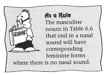 Page 58 Table 6.5 Sex Changes Le (L'), Un La (L'), Une ami (ah-mee)/friend amie (ah-mee)/friend avocat (ah-vo-kah)/lawyer avocate (ah-vo-kaht)/lawyer cliente (klee-yahN)/client client (klee-yahNt)/client cousin (koo-zaN)/cousin cousine (koo-zeen)/cousin employé (ahN-plwah-yay)/employee employée (ahN-plwah-yay)/employee étudiant (ay-tew-dyahN)/student étudiante (ay-tew-dyahNt)/student voisin (vwah-zaN)/neighbor voisine (vwah-zeen)/neighbor Some masculine noun endings (usually referring to professions) very conveniently have a corresponding feminine ending. Most of the feminine endings sound different, as you will notice in Table 6.6. Table 6.6 More Sex Changes Masculine Ending Feminine Ending -an paysan (peh-ee-zahN)/peasant -anne paysanne (peh-ee-zahn)/peasant -el contractuel (kohN-trahk-tew- ehl)/traffic enforcer -elle contractuelle (koh-trahk-tew- ehl)/traffic enforcer -er pâstissier (pah-tee-syay)/pastry chef -ère pâtissière (pah-tee-syehr)/pastry chef -eur vendeur (vahN-duhr)/salesman -euse vendeuse/ (vahN-duhz) saleswoman -ien mécanicien/mechanic (may-kah- nee-syaN) -ienne mécanicienne (may-kah-nee- syehn)/mechanic -on patron (pah-trohN)/boss -onne patronne (pah-trohn)/boss -teur spectateur (spehk-tah- tuhr)/spectator -trice spectatrice (spehk-tah- trees)/spectator Page 59 He Is/She Is Review what you've learned so far and then complete the list with the missing professions. Be very careful before you choose an ending. Remember, some nouns do not change. Il est Elle est Il est Elle est avocat _____ infirmier _____ _____ dentiste pompier _____ coiffeur _____ _____ patronne _____ factrice mannequin _____ boucher _____ _____ pâtissière _____ étudiante médecin _____ _____ chef _____ ouvrière électricien _____ If you did well with this exercise, then it's time to continue. The good news is: There are no more rules. However, because most nouns in French do not follow any specific set of rules, you should learn them with their markers. You'll see that you'll get the hang of it in no time. And if you make a gender mistake, it's really not that serious—as long as you've chosen the correct noun, you'll be understood. When There's More Than One Noun When a French noun refers to more than one person, place, thing, or idea, just like in English, it must be made plural. But it is not enough to simply change the noun—the marker must be made plural, as well. As you study Table 6.7, you will see that in the plural, the masculine and feminine noun markers for the and some are exactly the same. Table 6.7 Plural Noun Markers Masculine Feminine the les les some des des Page 60 What does this mean? Because le, la, and l' all become les in the plural, and un and une become des, using a plural noun marker does not enable you to determine the gender of any noun. Plural noun markers indicate only that the speaker is referring to more than one noun. This means that you must learn each noun with its singular noun marker. Plural Nouns Forming the plural of most nouns in French is really quite easy. All you have to do is add an unpronounced s to the singular form: le garçon luh gahr-sohN), les garçons (lay gahr-sohN), un garçon (uhN gahr-sohN) des garçons (day gahr-sohN) la fille (lah fee-y), une file (ewn fee-y) les filles (lay fee-y), des files (day fee-y) I'enfant* (lahN-fahN), un enfant** les enfants** (lay zahN-fahN) (uhN nahN-fahN) des enfants** (day zahN-fahN) The letters s, x, and z are all letters that are used to make plurals in French. So what happens if you have a French noun that ends in one of these letters? Absolutely nothing! le prix (luh pree)/the price, prize les prix (lay pree) le fils (luh fees)/the son les fils (lay fees) le nez (luh nay)/the nose les nez (lay nay) Common words that end in s: l'ananas (lah-nah- nah)/pineapple le héros (luh ay-ro)*/hero l'autobus (lo-toh-bews)/bus le mois (luh mwah)/month le bas (luh bah)/stocking le jus (luh zhew)/juice le bras (luh brah)/arm le palais (luh pah-leh)/palace le colis (luh koh-lee)/package le pardessus (luh pahr-duh- sew)/overcoat le corps (luh kohr)/body le pays (luh pay-ee)/country le dos (luh do)/back le repas (luh ruh-pah)/meal Page 61 la fois (lah fwah)/time le tapis (luh tah-pee)/rug Common words that end in x: la croix (lah krwah)/cross la voix (lah vwah)/voice Now There's More Than One Chances are that when you travel, you're going to see more than one château, museum, church, etc. If you choose to discuss or describe these things, you'll want to make sure that you've got your plurals down pat. Practice makes perfect, so try to express that you see more than one of the things in the following list. Example: héros/hero Je vois (zhuh v waht I see) des héros. boutique automobile croix/cross tapis restaurant magazine palais/palace autobus Other Plurals The letter x is used in French to make plurals. • For nouns ending in eau: le bateau (luh bah-to)/boat les bateaux le bureau (luh bew-ro)/office, desk les bureaux le cadeau (luh kah-do)/gift les cadeaux le chapeau (luh shah-po)/hat les chapeaux le château (luh shah-to)/castle les chateaux le couteau (luh koo-to)/knife les couteaux l eau (lo) (f.)/water les eaux le gâteau (luh gah-to)/cake les gateaux le manteau (luh mahN-to)/coat les manteaux Page 62 le morceau (luh mohr-so)/piece les morceaux l'oiseau (lwah-zo)/bird les oiseaux le rideau (luh ree-do)/curtain les rideaux le tableau (luh tah-blo)/picture, chalkboard les tableaux • For nouns ending in eu, except le pneu (luh pnuh)/tire: les pneus: l'animal (lah nee mahl)/animal les animaux le cheveu (luh shuh vuh)/hair les cheveux le jeu (luh zhuh)/game les jeux le lieu (luh lyuh)/place les lieux le neveu (luh nuh-vuh)/nephew les neveux • For nouns ending in al, change al to aux except for le bal (luh bahl)/ball: bals; le festival (luh fehs-tee- vahl)/festival: festivals. le cheval (luh shuh-vahl)/horse les chevaux l'hôpital (lo-pee-tahl)/hospital les hôpitaux le journal (luh zhoor-nahl)/newspaper les journ