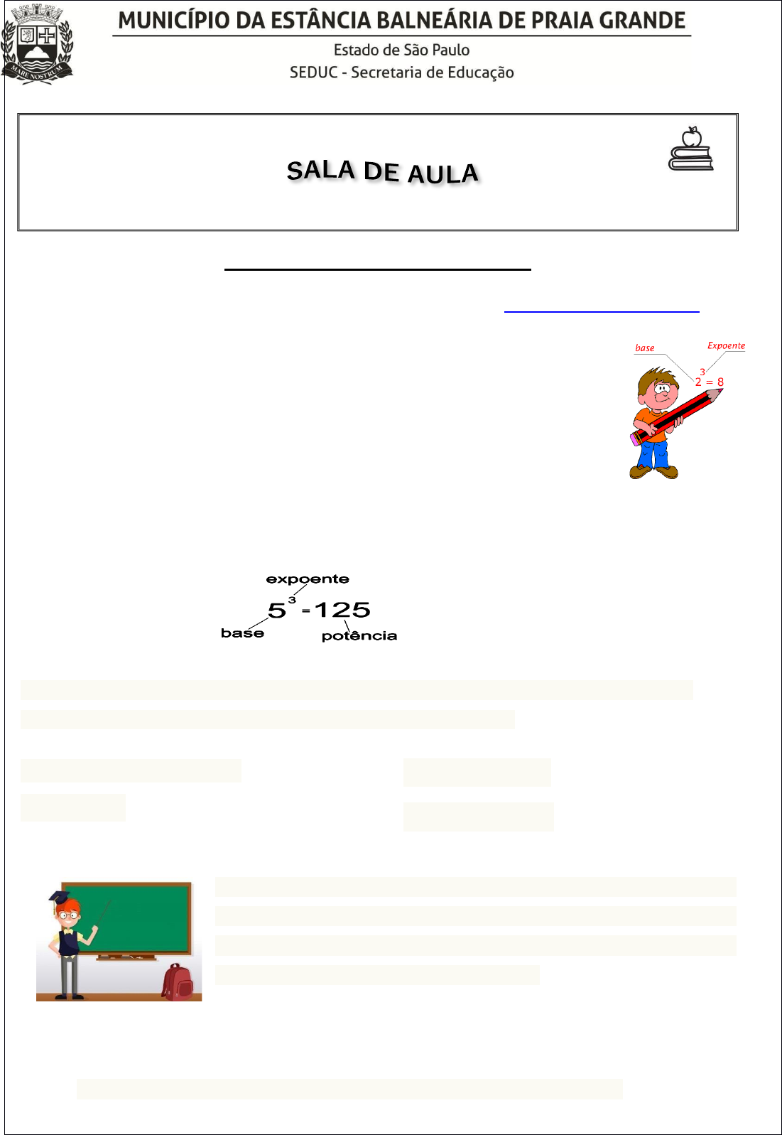 Potenciação Com Números Racionais Sugestão de vídeo sobre Potenciação com números racionais: https://youtu.be/YadqPP1UJwk Vamos relembrar alguns conceitos importantes sobre a Potenciação: A potenciação é a operação matemática que representa a multiplicação de fatores iguais. Ou seja, usamos a potenciação quando um número é multiplicado por ele mesmo várias vezes. Exemplo: A multiplicação 5 x 5 x 5 = 125 pode ser expressa da seguinte maneira: 5³ = 125, em que 5 é a base, 3 é o expoente e 125 é a potência (resultado da multiplicação). O expoente possui um papel fundamental na potenciação, pois ele é quem define quantas vezes a base será multiplicada por ela mesma. Observe: 26 = 2 x 2 x 2 x 2 x 2 x 2 = 64 4 ² = 4 x 4 = 16 10 ² = 10 x 10 = 100 12 ² = 12 x 12 = 144 Agora, que já relembramos a ideia principal da Potenciação, vamos aprender mais sobre como calcular uma potenciação, durante a realização das questões abaixo. Fiquem atentos às dicas e aos exemplos em cada questão: QUESTÃO 1- Determine o valor de cada uma das potências abaixo: Exemplo: 7³ = 7 x 7 x 7 = 343. Dicas: Todo número diferente de zero e elevado a zero é um. Exemplo: 40 = 1. Disciplina: Matemática 7ª Série - Ensino Fundamental EJA Semanas 6 e 7- 2º SEMESTRE 2021 https://youtu.be/YadqPP1UJwk Todo número diferente de zero e elevado a um é o próprio número. Exemplo: 201 = 20. Base zero e qualquer número no expoente, o resultado será zero. Exemplo: 𝟎𝟏𝟎𝟎 = 0. a) 1250 = b) 121 = c) 012 = d) 025 = e) 100 = f) 05 = g) 34 = h) 24 = i) 102 = j) 203 = QUESTÃO 2- Calcule as potências, observando as regras de sinais para os números inteiros: Regras: 1- Quando o expoente for par, a potência é um número positivo. Exemplo: (+7)² = (+7) . (+7) = +49. 2- Quando o expoente é impar, a potência tem o mesmo sinal da base. Exemplos: 1) (+4)³ = (+4) . (+4) . (+4) = + 64. 2) (-4)³ = (-4) . (-4) . (-4) = - 64. 3- Para que a base seja negativa, ela deve estar entre parênteses. Se não estiver, o resultado da potenciação tem o mesmo sinal da base. Exemplos: 1) (- 2)⁶ = 64 2) -2⁶ = - 64. a) (-6)² = b) (+3)⁴ = d) -10² = e) (+10)² = g) (-1)⁶ = j) (+11)³ = h) (-11)³ = c) (-6)³ = f) (-3)⁵ = i) (-21)² = QUESTÃO 3- Calcule as potências dos números racionais, observando as mesmas regras de sinais utilizadas para os números inteiros: Dica: Na potenciação dos números racionais devemos aplicar o expoente aos dois elementos da fração, o numerador e o denominador. Exemplo: (+ 𝟒 𝟔 ) 𝟐 = 𝟒𝟐 𝟔𝟐 = 𝟏𝟔 𝟑𝟔 a)(+ 1 3 ) 2 = b)(− 3 5 ) 2 = c) (+ 2 6 ) 3 = d)(+ 7 10 ) 2 = e)(− 1 5 ) 2 = f) (+ 4 7 ) 3 = Agora vamos conhecer sobre algumas Propriedades da Potenciação: a) Multiplicação de Potências de mesma base: QUESTÃO 4- Reduza a uma só potência: Dica: Quando o número não tem nenhum expoente, consideramos o expoente como 1. a) 4³ x 4 ²= b) 74 x 75= c) 26 x 24= d) 6³ x 6 = e) 33 x 3² = b) Divisão de Potência de mesma base: QUESTÃO 5- Reduza a uma só potência: a) 54 : 52= b) 87 : 8³ = c) 99 : 9² = d) 4³ : 4² = e) 96: 9³ = c) Potência de Potência: QUESTÃO 6- Reduza a uma só potência: a) (5³)²= b) (82)5= c) (3²)² = d) (74)² = Fonte:https://www.todamateria.com.br/potenciacao/ https://alunosonline.uol.com.br/matematica/potenciacao.html Para multiplicar, mantém-se a base e somam-se os expoentes. Exemplo: 𝟐𝟑. 𝟐𝟐= 𝟐𝟑+𝟐= 𝟐𝟓 Ao dividir potências de mesma base, repetimos a base e subtraímos os expoentes. Exemplos: a) 84 : 8² = 84−2 = 82 b) 54 : 5 = 54−1 = 5³ Ao elevar uma potência a um outro expoente, repetimos a base e multiplicamos os expoentes. Exemplo: (7²)³ = 72x3= 76 https://www.todamateria.com.br/potenciacao/ https://alunosonline.uol.com.br/matematica/potenciacao.html