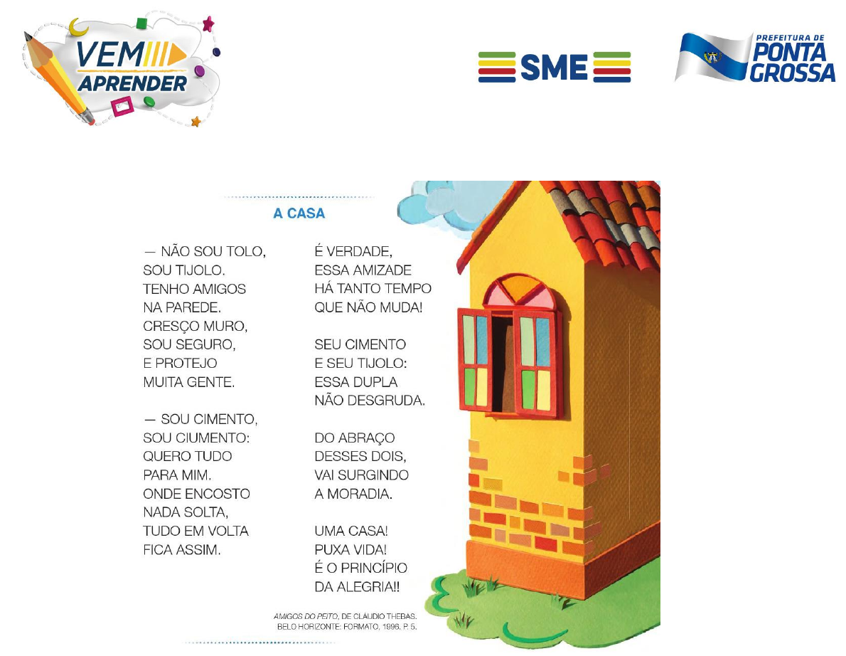 Atividade 5º ano Leia o poema a seguir: Disponível em: https://issuu.com/ed_moderna/docs/projeto-presente1/18 1- Encontre palavras que rimam com: A) Tolo rima com _______________________. B) Muro rima com ________________________. C) Cimento rima com _____________________. D) Mim rima com _________________________. E) Verdade rima com ______________________. 2- Agora você é o autor... Após a leitura do poema, você esta sendo desafiado a escrever um pequeno texto que apresente rimas, como no poema acima. Não se esqueça de colocar um titulo para o seu texto e atente para a composição de um texto, o mesmo deve conter um começo, um meio e um fim. Utilize o quadro a seguir para lhe ajudar na escrita do texto. Disponível em: https://www.google.com/search?q=produ%C3%A7%C3%A3o+textual,+come %C3%A7o+meio+e+fim&tbm=isch&source=iu&ictx=1&fir=3nE5mQ2rg99onM %253A%252CclIW5VwG423a3M%252C_&vet=1&usg=AI4_- kQquDvScyao6CCCZ- 0dTuz6vcEESg&sa=X&ved=2ahUKEwjwq9nK7fzoAhX5IbkGHb7fBcwQ9QEw BHoECAoQJQ#imgrc=3nE5mQ2rg99onM. Acesso em 22 de abril de 2020. https://www.google.com/search?q=produ%C3%A7%C3%A3o+textual,+come%C3%A7o+meio+e+fim&tbm=isch&source=iu&ictx=1&fir=3nE5mQ2rg99onM%253A%252CclIW5VwG423a3M%252C_&vet=1&usg=AI4_-kQquDvScyao6CCCZ-0dTuz6vcEESg&sa=X&ved=2ahUKEwjwq9nK7fzoAhX5IbkGHb7fBcwQ9QEwBHoECAoQJQ#imgrc=3nE5mQ2rg99onM https://www.google.com/search?q=produ%C3%A7%C3%A3o+textual,+come%C3%A7o+meio+e+fim&tbm=isch&source=iu&ictx=1&fir=3nE5mQ2rg99onM%253A%252CclIW5VwG423a3M%252C_&vet=1&usg=AI4_-kQquDvScyao6CCCZ-0dTuz6vcEESg&sa=X&ved=2ahUKEwjwq9nK7fzoAhX5IbkGHb7fBcwQ9QEwBHoECAoQJQ#imgrc=3nE5mQ2rg99onM https://www.google.com/search?q=produ%C3%A7%C3%A3o+textual,+come%C3%A7o+meio+e+fim&tbm=isch&source=iu&ictx=1&fir=3nE5mQ2rg99onM%253A%252CclIW5VwG423a3M%252C_&vet=1&usg=AI4_-kQquDvScyao6CCCZ-0dTuz6vcEESg&sa=X&ved=2ahUKEwjwq9nK7fzoAhX5IbkGHb7fBcwQ9QEwBHoECAoQJQ#imgrc=3nE5mQ2rg99onM https://www.google.com/search?q=produ%C3%A7%C3%A3o+textual,+come%C3%A7o+meio+e+fim&tbm=isch&source=iu&ictx=1&fir=3nE5mQ2rg99onM%253A%252CclIW5VwG423a3M%252C_&vet=1&usg=AI4_-kQquDvScyao6CCCZ-0dTuz6vcEESg&sa=X&ved=2ahUKEwjwq9nK7fzoAhX5IbkGHb7fBcwQ9QEwBHoECAoQJQ#imgrc=3nE5mQ2rg99onM https://www.google.com/search?q=produ%C3%A7%C3%A3o+textual,+come%C3%A7o+meio+e+fim&tbm=isch&source=iu&ictx=1&fir=3nE5mQ2rg99onM%253A%252CclIW5VwG423a3M%252C_&vet=1&usg=AI4_-kQquDvScyao6CCCZ-0dTuz6vcEESg&sa=X&ved=2ahUKEwjwq9nK7fzoAhX5IbkGHb7fBcwQ9QEwBHoECAoQJQ#imgrc=3nE5mQ2rg99onM https://www.google.com/search?q=produ%C3%A7%C3%A3o+textual,+come%C3%A7o+meio+e+fim&tbm=isch&source=iu&ictx=1&fir=3nE5mQ2rg99onM%253A%252CclIW5VwG423a3M%252C_&vet=1&usg=AI4_-kQquDvScyao6CCCZ-0dTuz6vcEESg&sa=X&ved=2ahUKEwjwq9nK7fzoAhX5IbkGHb7fBcwQ9QEwBHoECAoQJQ#imgrc=3nE5mQ2rg99onM