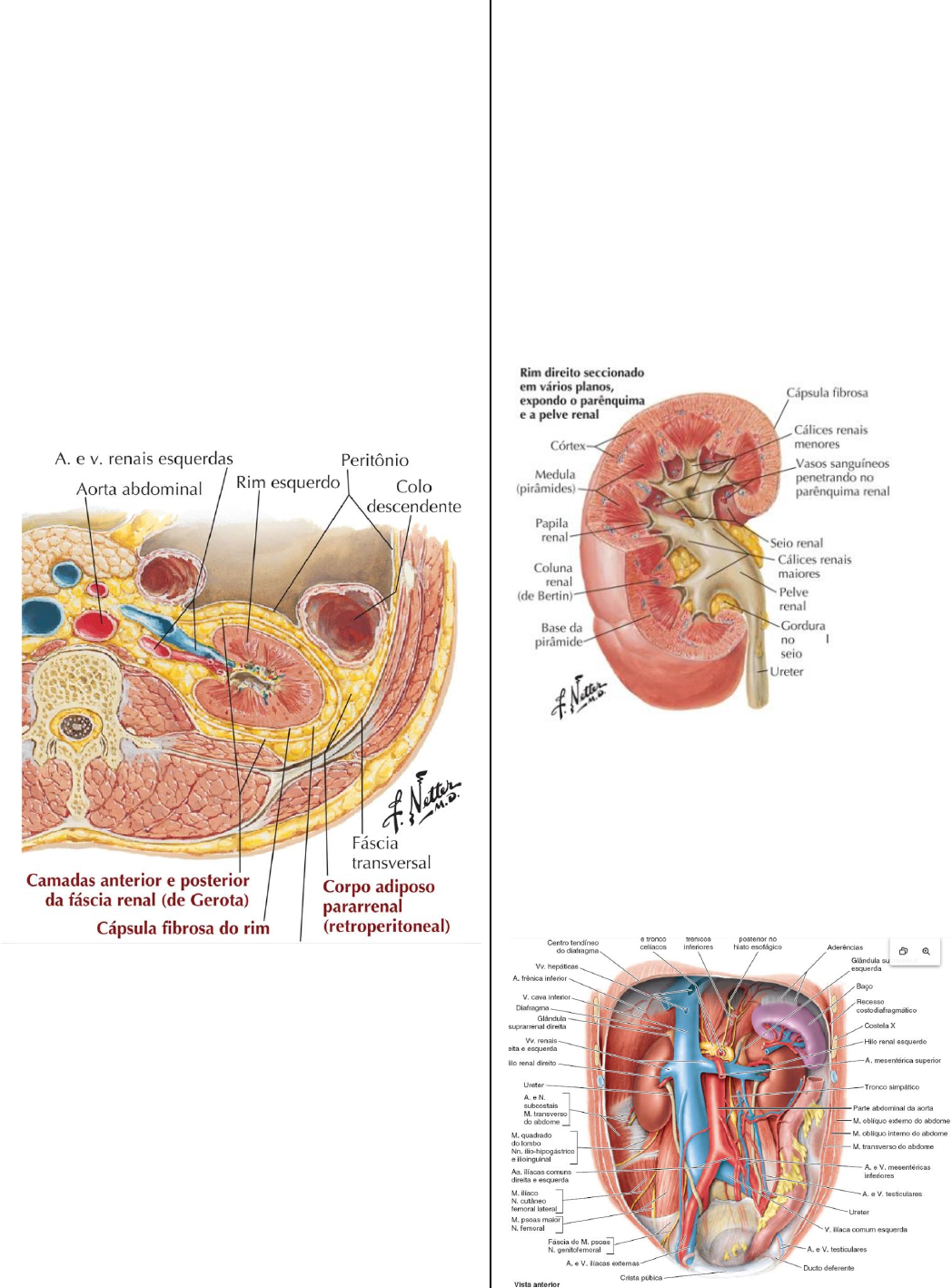 Victor Velloso – FASAI 24.1 1 Sistema urinário e infecção urinária Rins ⇀ Os rins são órgãos retroperitoneais com formato de feijão que se situam na altura da costela 11~12. possuem em média 12 cm de altura, 6 cm de largura e 3 cm de espessura. O rim direito localiza-se mais abaixo (aproximadamente metade de uma vértebra abaixo) devido ao desvio promovido pela presença do fígado. O seu polo superior localiza-se um pouco abaixo do nível da costela XI. A posição dos rins também é dependente da respiração, devido à sua proximidade com o diafragma, de modo que ambos os rins podem descer até 3 cm durante a inspiração. Possuem uma face convexa e uma face côncava, também chamada de hilo. Dos hilos renais saem as veias, vasos linfáticos e ureteres e entram os vasos sanguíneos e alguns nervos. Possui íntima relação com as glândulas suprarrenais, situadas acima de cada rim. ⇀ Uma camada fina e rígida de tecido conjuntivo denso, chamada cápsula fibrosa, adere diretamente à superfície do rim, mantendo sua forma e constituindo uma barreira que pode inibir a disseminação de infecção. Possui gordura perirrenal, uma fáscia renal de tecido conjuntivo (Fáscia de Gerota) e gordura pararrenal. A cápsula adiposa fixa o rim durante a movimentação da respiração. Quando essa cápsula é fortemente reduzida, em casos de anorexia, por exemplo, pode ocorrer um deslocamento do rim no sentido caudal (nefroptose) ou uma rotação do órgão, e o ureter pode ser contorcido e danificado, o que leva a danos renais devido à retenção urinária. ⇀ A anatomia interna do rim é complexa. Após a cápsula fibrosa, adentra-se ao córtex renal, onde se localizam os néfrons. Mais adentro, encontra-se a medula renal, constituída pelos ductos coletores e dispostas em formato de pirâmides renais. Essas pirâmides drenam o filtrado para os cálices renais menores, que confluem para um cálice renal maior. Os cálices renais maiores, por sua vez, confluem para a pelve renal que drena para o ureter. O rim humano possui aproximadamente 7 a 9 (4 a 18) pirâmides renais. Cada pirâmide, associada à região cortical adjacente e às colunas renais formam um lobo renal. Vascularização ⇀ Os rins são supridos pelas artérias renais, que são ramos da aorta abdominal, sendo a artéria renal direita (4-5cm) um pouco maior que a esquerda (2- 3cm). Cada artéria renal se divide em +/- 5 segmentos que irão vascularizar regiões diferentes do rim As veias renais drenam para a veia cava inferior. Victor Velloso – FASAI 24.1 2 Inervação ⇀ Os rins e as glândulas suprarrenais são inervados pelo SNA. Os nervos simpáticos são oriundos dos níveis espinais T10-L2. Os nervos parassimpáticos para os rins e as glândulas suprarrenais trafegam com o nervo vago e estabelecem sinapses sobre neurônios pós- ganglionares no interior do rim e do córtex suprarrenal • excreção de urina e de substâncias endógenas e exógenas • função endócrina (eritropoietina, renina, calcitriol) Aparelho justaglomerular: É um aparelho que controla em parte a pressão arterial. No túbulo contorcido distal, células especializadas denominadas células da mácula densa são capazes de detectar o conteúdo iônico do plasma e estimulam as células justaglomerulares por hormônios parácrinos a secretarem renina. A renina age sobre a secreção de aldosterona, um hormônio da camada cortical da glândula adrenal que aumenta a pressão arterial (ao promover a reabsorção de sódio nos rins). Além disso, ela converte o angiotensinogênio em angiotensina I no plasma sanguíneo. A angiotensina I pode ser convertida em angiotensina II (potente vasoconstritor) na presença de ECA, presente nos capilares pulmonares e no plasma. As células do interstício do córtex renal produzem 85% da eritropoetina do organismo, um hormônio glicoproteico que estimula a produção de eritrócitos pelas células da medula óssea hematopoética. O fígado sintetiza os 15% restantes da eritropoetina necessária para o bom funcionamento Néfron ⇀ A unidade funcional do rim são os túbulos uriníferos, formados por um néfron e um ducto coletor. Em cada rim há mais de 1 milhão de néfrons. Cada néfron é formado por uma porção inicial dilatada, o corpúsculo renal ou corpúsculo de Malphigi, e por uma sequência de túbulos: o túbulo contorcido proximal; as duas porções espessas da alça de Henle, entre as quais se situa a porção delgada da alça de Henle; e o túbulo contorcido distal. Se subdividem em néfrons justamedulares, intermediários ou superficiais. ⇀ O epitélio dos túbulos uriníferos repousa sobre uma lamina basal que está recoberta por interstício renal. No interstício há células intersticiais que liberam hormônios parácrinos e endócrinos. Essas células produzem 85% da eritropoetina do corpo. Problemas renais causam anemia por deficiência de EPO. ⇀ Os corpúsculos renais ou corpúsculos de Malphigi são a primeira parte do néfron e possuem 2 polos: vascular, por onde entram e saem as arteríolas e urinário, dando origem ao túbulo contorcido proximal. O sangue chega pela arteríola aferente, passa por capilares fenestrados recobertos pela camada visceral da cápsula de Bowman (podócitos) e sai pela arteríola eferente. A arteríola eferente possui mais musculatura lisa, então exerce mais controle sobre a pressão no interior dos capilares (em torno de 45- 60mmHg). A diferença de pressão entre os capilares e o glomérulo (10mmHg) faz com que haja uma produção contínua de filtrado que drena para o TCP. A resistência é contraposta pela pressão osmótica coloidal do sangue no glomérulo (32 mmHg) e pela pressão hidrostática do líquido, conhecida como pressão oncótica, no espaço urinário (18 mmHg). Portanto, há uma pressão de filtração efetiva (ou resultante, líquida) de 10 mmHga resistência é contraposta pela pressão osmótica coloidal do sangue no glomé