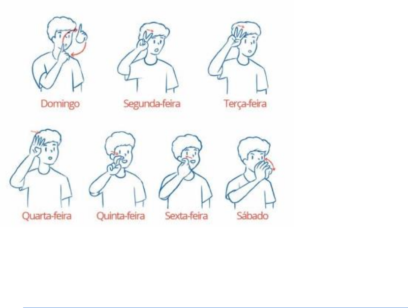 1. Em Libras, existem sinais que representam o tempo e o calendário. É possível situar na língua de sinais a passagem do tempo e dizer algo que acontecerá em breve, bem como situar onde estamos no tempo. Veja a figura a seguir: Figura - Dias da semana em Libras Fonte: LIBRAS(2020, on-line). LIBRAS: calendário. Trabalhando com surdos, [2020].Disponível em: http://trabalhandocomsurdos.blogspot.com/2013/01/libras-calendario.html. Acesso em: 15 dez. 2020. #PraCegoVer: a imagem apresenta um quadro com um título, em português, “Dias da semana” e o desenho de sete avatares representando os dias da semana em Libras. Esses avatares estão desenhados com uma camisa vermelha e se assemelham a um menino de cabelo preto e pele clara. O primeiro avatar sinaliza o sinal “domingo”, com uma configuração de mão em D, em frente a boca, fazendo movimentos circulares anti-horário. O segundo avatar faz o sinal correspondente à “segunda-feira” em Libras, com a mão fechada e os dedos indicador e médio levantados, fazendo-se dois leves toques na lateral da testa. Os sinais de “terça-feira” e “quarta-feira” seguem a mesma lógica do sinal de “segunda-feira”, no entanto, para “terça-feira”, são três dedos levantados, e, para “quarta-feira”, são quatro. O sinal de “quinta- feira” é representado por uma mão fechada, com os dedos indicador e médio encurvados, fazendo-se dois leves toques na lateral da testa. O sinal de “sexta- feira” tem a configuração de mão em X, fazendo-se dois toques leves ao lado da boca. O sinal de “sábado” tem a configuração de mão em C, em frente à boca, fazendo-se um movimento de fechar e abrir duas vezes. Para cada sinal desenhado em Libras, há uma legenda abaixo com o nome do respectivo sinal em português. http://trabalhandocomsurdos.blogspot.com/2013/01/libras-calendario.html A partir da análise do quadro acima, leia as afirmativas a seguir e assinale V para a(s) verdadeira(s) e F para a(s) falsa(s). I. ( ) Os sinais dos dias da semana, salvo algumas variações regionais, são feitos na região do rosto. II. ( ) Na Libras, não há representação, em sinais, para os dias da semana, dessa forma, eles precisam ser soletrados. III. ( ) O sinal de “sábado”, em outro contexto, pode significar, também, o sinal da cor “laranja” ou da fruta “laranja”. IV. ( ) Os sinais que representam os dias da semana não podem ser utilizados em outros contextos, pois eles são fixos. Resposta correta V, F, V, F Resposta correta. A alternativa está correta, pois os sinais em Libras sobre os dias da semana geralmente são feitos no rosto. Em algumas regiões do país, ele pode ser feito à frente do corpo. Além disso, alguns sinais dos dias da semana podem ser utilizados em outros contextos, com outros significados comoo sinal de “sexta-feira”, que, em outra situação comunicacional, pode representar a palavra “peixe”. Isso demonstra como os sinais feitos em Libras modificam-se sob influência das variações regionais e como um sinal pode mudar de significado, dependendo do contexto. 2. Na Libras, é possível expressar sinais que simbolizem o tempo e o calendário, como: dia, semana, mês e ano, tanto no passado quanto no presente e no futuro. Veja a imagem a seguir sobre os meses do ano em Libras: Figura - Meses do ano em Libras Fonte: DIAS…(2014, on-line). DIAS da semana e meses do ano em Libras para aula de Língua Inglesa. Oficina de Libras, 2014. Disponível em: http://oficinadelibras.blogspot.com/2014/08/dias-da-semana-e-meses-do- ano-em-libras.html. Acesso em: 15 dez. 2020. #PraCegoVer: a figura apresenta desenhos de avatares que representam os meses do ano em Libras, bem como o próprio sinal “mês”. O sinal de “janeiro” é representado pela configuração de mão em J à frente do corpo. O sinal de “fevereiro” é uma mão aberta, com os dedos afastados, levemente flexionados, com movimento trêmulo à frente do rosto. O sinal de “março” é uma soletração rápida à frente do corpo. O sinal “abril” é uma configuração de mão em A que faz um movimento saindo da lateral do rosto para o lado e para cima em simultâneo. O sinal de “maio” é uma soletração rápida em frente ao corpo. O sinal “junho” são duas mãos com a configuração de mão em U, em frente ao corpo, movimentando-se alternadamente para cima e para baixo, sendo que as duas mãos se tocam durante o movimento. O sinal “julho” é feito com duas configurações de mão em sequência, primeiro a configuração de mão em J e, depois, em L. O sinal de “agosto” é uma mão aberta encostada no peito, do lado oposto à mão, e faz um movimento de esfregar para cima e para baixo. O sinal de “setembro” é feito com os dois antebraços à frente do corpo, direcionados para um dos lados, com as mãos abertas e com os dedos fazendo um movimento de abrir e fechar, simultaneamente. O sinal de “outubro” é feito com a configuração de mão em “O”, com um movimento trêmulo de punho. O sinal de “novembro” é feito com a configuração de mão em N e com um movimento para cima e para baixo. O sinal de “dezembro” é feito com a mão em configuração de mão em C, sendo que as pontas dos dedos encostam no queixo e fazem um movimento de repetição de cima para baixo. Cada desenho representando um sinal do mês em Libras e tem logo abaixo o nome escrito em português e em inglês. Considerando a figura acima, analise as asserções a seguir e a relação proposta entre elas. I. Os meses dos sinais, em Libras, correspondem ao número do mês Pois, II. Assim, fica mais fácil a identificação dos sinais em Libras com os meses correspondentes. A seguir, assinale a alternativa correta: Resposta correta As asserções I e II são falsas. Resposta correta. A alternativa está correta, pois, na Libras, os meses do ano não são representados pela ordem numérica do calendário. Os sinais podem se