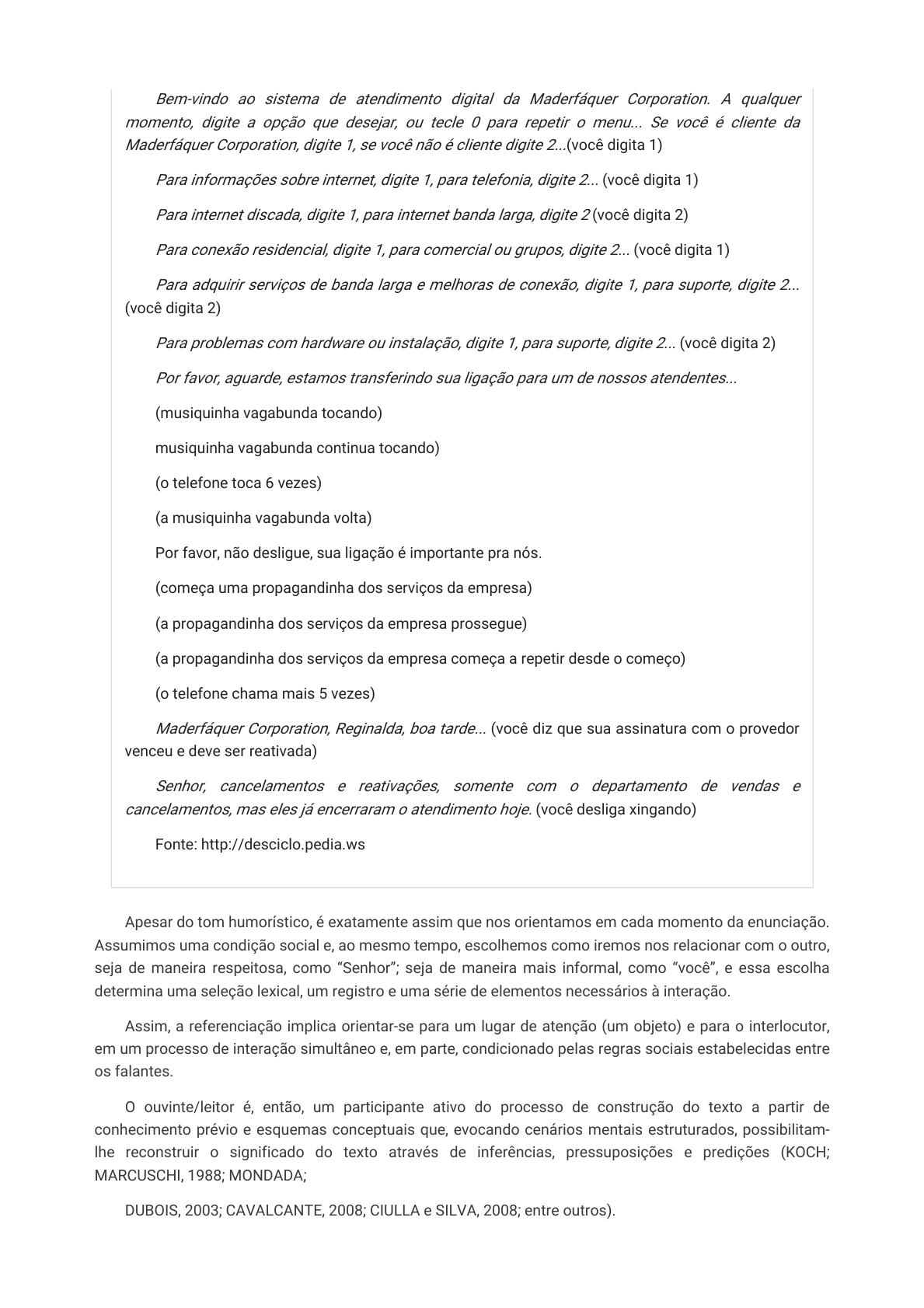 Bem-vindo ao sistema de atendimento digital da Maderfáquer Corporation. A qualquer momento, digite a opção que desejar, ou tecle 0 para repetir o menu... Se você é cliente da Maderfáquer Corporation, digite 1, se você não é cliente digite 2...(você digita 1) Para informações sobre internet, digite 1, para telefonia, digite 2... (você digita 1) Para internet discada, digite 1, para internet banda larga, digite 2 (você digita 2) Para conexão residencial, digite 1, para comercial ou grupos, digite 2... (você digita 1) Para adquirir serviços de banda larga e melhoras de conexão, digite 1, para suporte, digite 2... (você digita 2) Para problemas com hardware ou instalação, digite 1, para suporte, digite 2... (você digita 2) Por favor, aguarde, estamos transferindo sua ligação para um de nossos atendentes... (musiquinha vagabunda tocando) musiquinha vagabunda continua tocando) (o telefone toca 6 vezes) (a musiquinha vagabunda volta) Por favor, não desligue, sua ligação é importante pra nós. (começa uma propagandinha dos serviços da empresa) (a propagandinha dos serviços da empresa prossegue) (a propagandinha dos serviços da empresa começa a repetir desde o começo) (o telefone chama mais 5 vezes) Maderfáquer Corporation, Reginalda, boa tarde... (você diz que sua assinatura com o provedor venceu e deve ser reativada) Senhor, cancelamentos e reativações, somente com o departamento de vendas e cancelamentos, mas eles já encerraram o atendimento hoje. (você desliga xingando) Fonte: http://desciclo.pedia.ws Apesar do tom humorístico, é exatamente assim que nos orientamos em cada momento da enunciação. Assumimos uma condição social e, ao mesmo tempo, escolhemos como iremos nos relacionar com o outro, seja de maneira respeitosa, como “Senhor”; seja de maneira mais informal, como “você”, e essa escolha determina uma seleção lexical, um registro e uma série de elementos necessários à interação. Assim, a referenciação implica orientar-se para um lugar de atenção (um objeto) e para o interlocutor, em um processo de interação simultâneo e, em parte, condicionado pelas regras sociais estabelecidas entre os falantes. O ouvinte/leitor é, então, um participante ativo do processo de construção do texto a partir de conhecimento prévio e esquemas conceptuais que, evocando cenários mentais estruturados, possibilitam- lhe reconstruir o significado do texto através de inferências, pressuposições e predições (KOCH; MARCUSCHI, 1988; MONDADA; DUBOIS, 2003; CAVALCANTE, 2008; CIULLA e SILVA, 2008; entre outros). 25