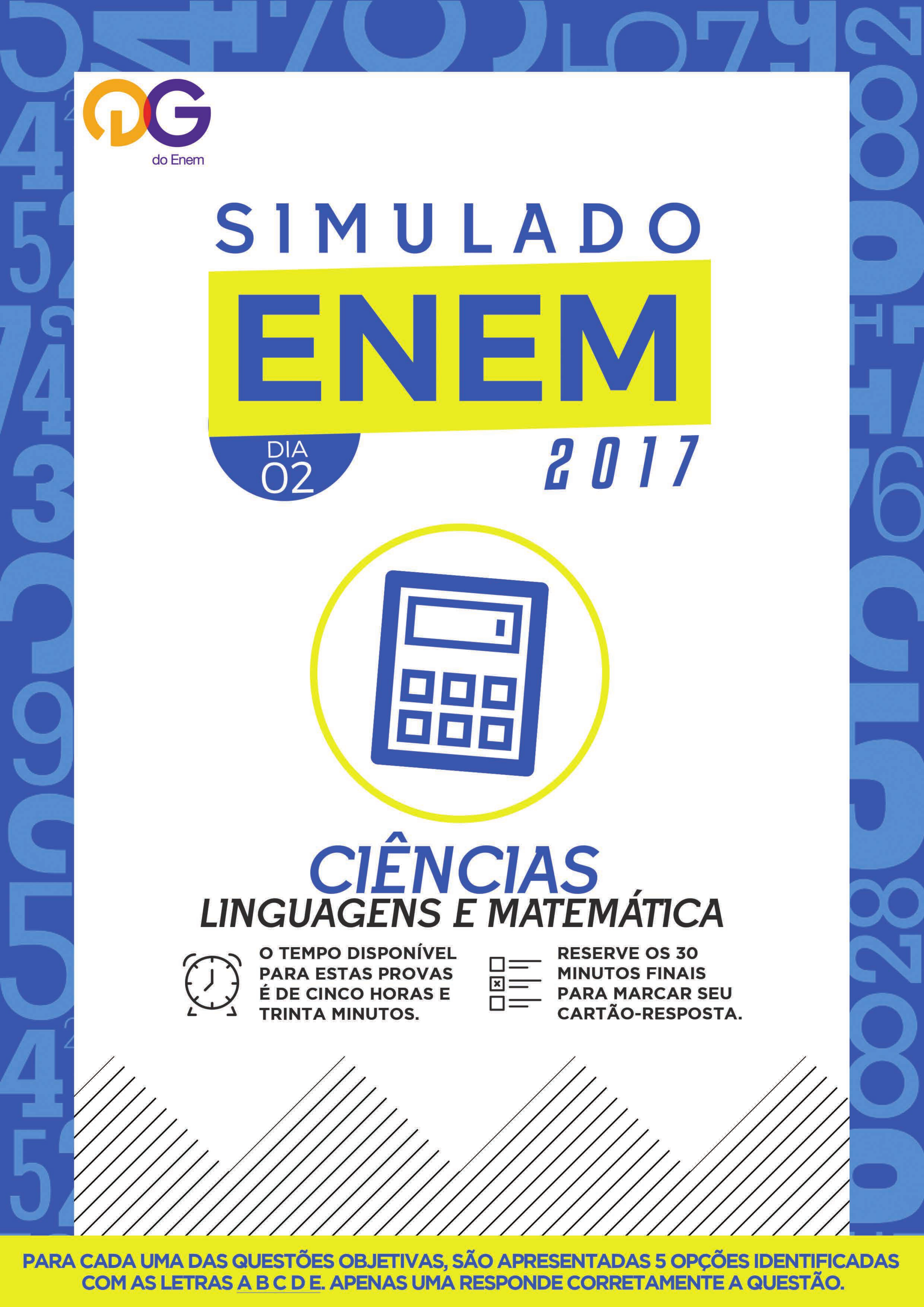 Leia atentamente as seguintes instruções: 1. Você deve receber do fiscal o material abaixo: a) este CADERNO, com 90 questões objetivas (de nos 1 a 90) b) 01 (um) CARTÃO-RESPOSTA, destinado à marcação das respostas. c) Você deve assinalar apenas UMA ALTERNATIVA PARA CADA QUESTÃO. A marcação em mais de uma alternativa anula a questão. d) No CARTÃO-RESPOSTA, a marcação das letras, correspondentes às respostas de sua opção, deve ser feita preenchendo todo o espaço compreendido no retângulo, com caneta esferográfica de tinta preta ou azul, com um traço contínuo e denso, como no exemplo acima. 2. Reserve os 30 (trinta) minutos finais para marcar seu cartão-resposta. Os rascunhos e as marcações assinaladas no caderno de questões não serão levados em conta. 3. O tempo disponível para a prova é de 5 horas e 30 minutos. LEIA ATENTAMENTE AS INSTRUÇÕES SEGUINTES 2O DIA CADERNO 1 AMARELO PROVA DE LINGUAGENS, CÓDIGOS E SUAS TECNOLOGIAS PROVA DE MATEMÁTICA E SUAS TECNOLOGIAS 1o SIMULADO ENEM 2016 1 Este CADERNO DE QUESTÕES contém uma prova de Redação e 90 questões numeradas de 1 a 90, dispostas da seguinte maneira: a. prova de Redação; b. as questões de número 1 a 45 são relativas à área de Linguagens, Códigos e suas Tecnologias; c. as questões de número 46 a 90 são relativas à área de Matemática e suas Tecnologias. ATENÇÃO: as questões de 1 a 5 são relativas à língua estrangeira. Você deverá responder apenas às questões relativas à língua estrangeira (inglês ou espanhol) escolhida. 2 Confira se o seu CADERNO DE QUESTÕES contém a quantidade de questões e se essas questões estão na ordem mencionada na instrução anterior. Caso o caderno esteja incompleto, tenha qualquer defeito ou apresente divergência, comunique ao aplicador da sala, para que ele tome as providências cabíveis. 3 Preencha corretamente os seus dados no CARTÃO- -RESPOSTA. 4 ATENÇÃO: após o preenchimento, escreva e assine seu nome nos espaços próprios do CARTÃO-RESPOSTA com caneta esferográfica de tinta preta. 5 Marque no CARTÃO-RESPOSTA, no espaço apropriado, o CÓDIGO DA PROVA abaixo. CÓDIGO DA PROVA (INGLÊS): 31004 CÓDIGO DA PROVA (ESPANHOL): 31204 6 Não dobre, não amasse nem rasure o CARTÃO- -RESPOSTA, pois ele não poderá ser substituído. 7 Para cada uma das questões objetivas, são apresentadas 5 opções identificadas com as letras , , , e . Apenas uma responde corretamente à questão. 8 No CARTÃO-RESPOSTA, preencha todo o espaço compreendido no círculo correspondente à opção escolhida para a resposta. A marcação em mais de uma opção anula a questão, mesmo que uma das respostas esteja correta. 9 O tempo disponível para esta prova é de cinco horas e trinta minutos. 10 Reserve os 30 minutos finais para marcar seu CARTÃO- -RESPOSTA. Os rascunhos e as anotações assinaladas no CADERNO DE QUESTÕES não serão considerados na avaliação. 11 Quando terminar as provas, acene para chamar o aplicador e entregue o CARTÃO-RESPOSTA. 12 Você poderá deixar o local de prova somente após decorridas duas horas do início da aplicação. 13 Você será eliminado do Simulado, a qualquer tempo, no caso de: a. prestar, em qualquer documento, declaração falsa ou inexata; b. perturbar, de qualquer modo, a ordem no local de aplicação das provas, incorrendo em comportamento indevido durante a realização do Simulado; c. comunicar-se, durante as provas, com outro participante verbalmente, por escrito ou por qualquer outra forma; d. portar qualquer tipo de equipamento eletrônico e de comunicação após ingressar na sala de provas; e. utilizar ou tentar utilizar meio fraudulento, em benefício próprio ou de terceiros, em qualquer etapa do Simulado; f. utilizar livros, notas ou impressos durante a realização do Simulado; g. ausentar-se da sala de provas levando consigo o CARTÃO-RESPOSTA a qualquer tempo. LG – 2o dia | Caderno 1 - Amarelo - Página 2 TEXTO I Segundo Marcos Bagno, autor do livro “Preconceito Linguístico – o que é, como se faz.”, esse tipo de preconceito nasce da ideia de que há uma única língua portuguesa correta, que é a ensinada nas escolas, está presente nos livros e dicionários e baseia-se na gramática normativa. Disponível em: poeticadepensee.wordpress.com. TEXTO II Não existe homem sem língua. Mesmo as pessoas com deficiências diversas adotam um sistema de comunicação. Quem é surdo, por exemplo, usa a linguagem de sinais. Sendo assim, não existe razão para que tenhamos preconceito com relação a qualquer variedade linguística diferente da nossa. Preconceito linguístico é o julgamento depreciativo, desrespeitoso, jocoso e, consequentemente, humilhante da fala do outro ou da própria fala. O problema maior é que as variedades mais sujeitas a esse tipo de preconceito são, normalmente, as com características associadas a grupos de menos prestígio na escala social ou a comunidades da área rural ou do interior. Historicamente, isso ocorre pelo sentimento e pelo comportamento de superioridade dos grupos vistos como mais privilegiados, econômica e socialmente. Disponível em: revistagalileu.globo.com. TEXTO III Disponível em: grupobeatrizeviva.blogspot.com.br. TEXTO IV O Censo 2010, do Instituto Brasileiro de Geografia e Estatística (IBGE), revelou que 274 línguas indígenas são faladas no país por 37,4% dos índios com mais de cinco anos de idade. Do total, seis mil deles falam mais de duas línguas. A fluência em pelo menos uma delas foi verificada em 57,3% dos índios que vivem em terras indígenas reconhecidas. Fora delas, o índice cai para 12,7%. O português não é falado por cerca de 130 mil pessoas, ou 17,5% do total. Disponível em: noticias.terra.com.br. INSTRUÇÕES: • O rascunho da redação deve ser feito no espaço apropriado. • A redação que apresentar cópia dos textos da Proposta de Redação ou do Caderno de Questões terá o número de linhas copiadas des