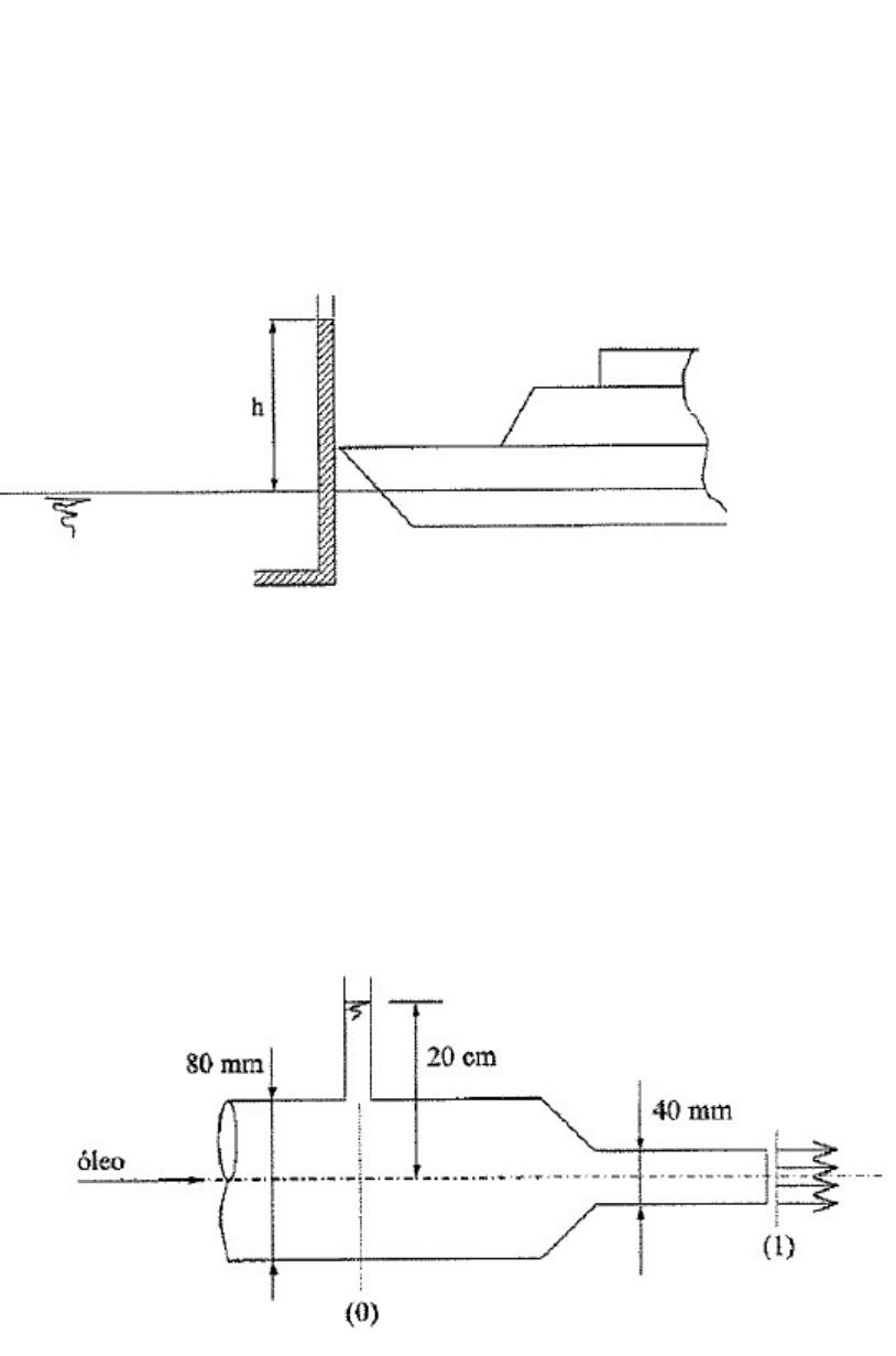 Lista 5 Dinâmica dos Fluidos Professor LIMA Mecânica dos Fluidos 1. Um tubo de Pitot é preso num barco que se desloca com 45 km/h. qual será a altura h alcançada pela água no ramo vertical. R: 7,8 m/s 2. Quais são as vazões de óleo em massa e em peso no tubo convergente da figura, para elevar uma coluna de 20 cm de óleo no ponto (0)? Dados; desprezar as perdas; γóleo= 8.000 N/m³; R: Q = 2,6L/s; Qm = 2,1 kg/s; QG = 20,6 N/s 3. A velocidade de um líquido(água) no ponto (1) é 2m/s. Encontre a pressão manométrica do ponto (1) sabendo que a pressão manométrica no ponto (2) 5.105Pa. A área do ponto (2) é metade da área do ponto (1). R: 306 MPa 4. Medidor Venturi consiste em um conduto convergente, seguido de um conduto de diâmetro constante chamado garganta e, posteriormente, de uma porção gradualmente divergente. É utilizado para determinar a vazão num conduto. Figura 1: Esquema do Tubo de Venturi Figura 2: Tubo de Venturi industrial Encontre a relação matemática de forma literal para cálculo de velocidade no ponto 2 e a vazão. R: 𝑉 = 𝐴 𝐴 − 𝐴 2𝑔∆ℎ 𝑄 = . 2𝑔∆ℎ 5. Na figura abaixo mostra-se um sifão utilizado para retirar água de um reservatório de grande porte. O duto que forma parte do sifão tem um diâmetro de 40mm e termina num bocal de 25mm de diâmetro. Considerando que não existem perdas de energia no sistema a) determine a vazão através do sifão e b) a pressão nos pontos B,C,D e F. R: Q = 3,77 L/s pA = 0 pB = -4,5kPa pC = -16,3kPa pD = -4,5kPa pF = 24,9kPa