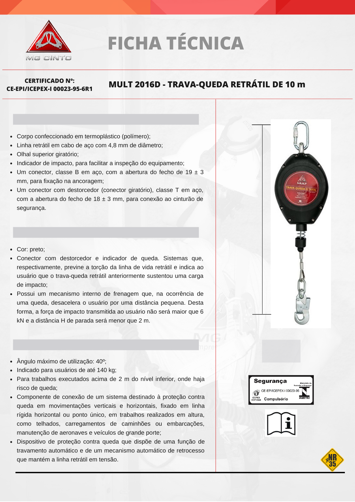 Empresa do Grupo MULT Corpo confeccionado em termoplástico (polímero); Linha retrátil em cabo de aço com 4,8 mm de diâmetro; Olhal superior giratório; Indicador de impacto, para facilitar a inspeção do equipamento; Um conector, classe B em aço, com a abertura do fecho de 19 ± 3 mm, para fixação na ancoragem; Um conector com destorcedor (conector giratório), classe T em aço, com a abertura do fecho de 18 ± 3 mm, para conexão ao cinturão de segurança. Ângulo máximo de utilização: 40º; Indicado para usuários de até 140 kg; Para trabalhos executados acima de 2 m do nível inferior, onde haja risco de queda; Componente de conexão de um sistema destinado à proteção contra queda em movimentações verticais e horizontais, fixado em linha rígida horizontal ou ponto único, em trabalhos realizados em altura, como telhados, carregamentos de caminhões ou embarcações, manutenção de aeronaves e veículos de grande porte; Dispositivo de proteção contra queda que dispõe de uma função de travamento automático e de um mecanismo automático de retrocesso que mantém a linha retrátil em tensão. MULT 2016D - TRAVA-QUEDA RETRÁTIL DE 10 m ABNT NBR 14628:2020 15837:2020 Cor: preto; Conector com destorcedor e indicador de queda. Sistemas que, respectivamente, previne a torção da linha de vida retrátil e indica ao usuário que o trava-queda retrátil anteriormente sustentou uma carga de impacto; Possui um mecanismo interno de frenagem que, na ocorrência de uma queda, desacelera o usuário por uma distância pequena. Desta forma, a força de impacto transmitida ao usuário não será maior que 6 kN e a distância H de parada será menor que 2 m. Pág. 1-2 FT.SGQ.152 - 12/11/2021 - Versão 01 www.mgcinto.com.br CERTIFICADO Nº: CE-EPI/ICEPEX-I 00023-95-6R1 DESCRIÇÃO DO PRODUTO CARACTERÍSTICAS E ESPECIFICAÇÕES TÉCNICAS INDICAÇÕES DE USO E FINALIDADE "LEIA O MANUAL" FICHA TÉCNICAFICHA TÉCNICA Co m pr im en to L 1: 1 0, 0 m O equipamento deve ser armazenado em local seco, limpo, longe da luz solar e calor; A higienização do trava-queda é de responsabilidade do usuário, portanto, certifique-se de que as características do equipamento não foram alteradas; O equipamento deve ser transportado em embalagem adequada, protegendo-o de possíveis danos; Sempre duplique seus sistemas de segurança contra quedas; Previamente e durante o uso, os equipamentos e elementos de engate e fixação deverão ser inspecionados visualmente quanto ao estado geral de conservação e funcionamento. Caso o equipamento apresente irregularidades, deverá ser suspenso o seu uso, seguido de avaliação por um profissional apto; Utilize apenas com os cinturões indicados acima; Leia o manual de instruções. www.mgcinto.com.br ARMAZENAMENTO, HIGIENIZAÇÃO E PRECAUÇÃO GARANTIA Desgaste normal de uso e/ou por exposição a fatores deteriorantes; Modificações e/ou retoques; Falta de manutenção conforme previsto no manual do produto; Falta de revisões obrigatórias realizadas em um intervalo menor que 12 meses; Utilizações para as quais este produto não está destinado; Oxidação por salinidade e/ou exposição a agentes químicos. Este produto é garantido contra qualquer defeito de fabricação. Estão excluídos desta garantia: VIDA ÚTIL A vida útil está estimada em 5 anos, a partir da data de aquisição do produto, observando-se as variáveis da atividade, conservação e armazenamento. Pág. 2-2 FT.SGQ.152 - 12/11/2021 - Versão 01 MULT 1132, MULT 1133, MULT 1884, MULT 1884B, MULT 1885A, MULT 1891, MULT 1891C, MULT 1891D, MULT 1891E, MULT 2009A, MULT 2010, MULT 2010A, MULT 2010B, MULT 2010C, MULT 2011, MULT 2011A, MULT 2012A, MULT 2013, MULT 1234, MULT 1235, MULT 1236, MULT 1237, MULT 1260, MULT 1270, MULT 1242, MULT 1226. UTILIZADO COM OS SEGUINTES CINTURÕES Empresa do Grupo MULT FICHA TÉCNICAFICHA TÉCNICA MULT 2016D - TRAVA-QUEDA RETRÁTIL DE 10 mCERTIFICADO Nº: CE-EPI/ICEPEX-I 00023-95-6R1