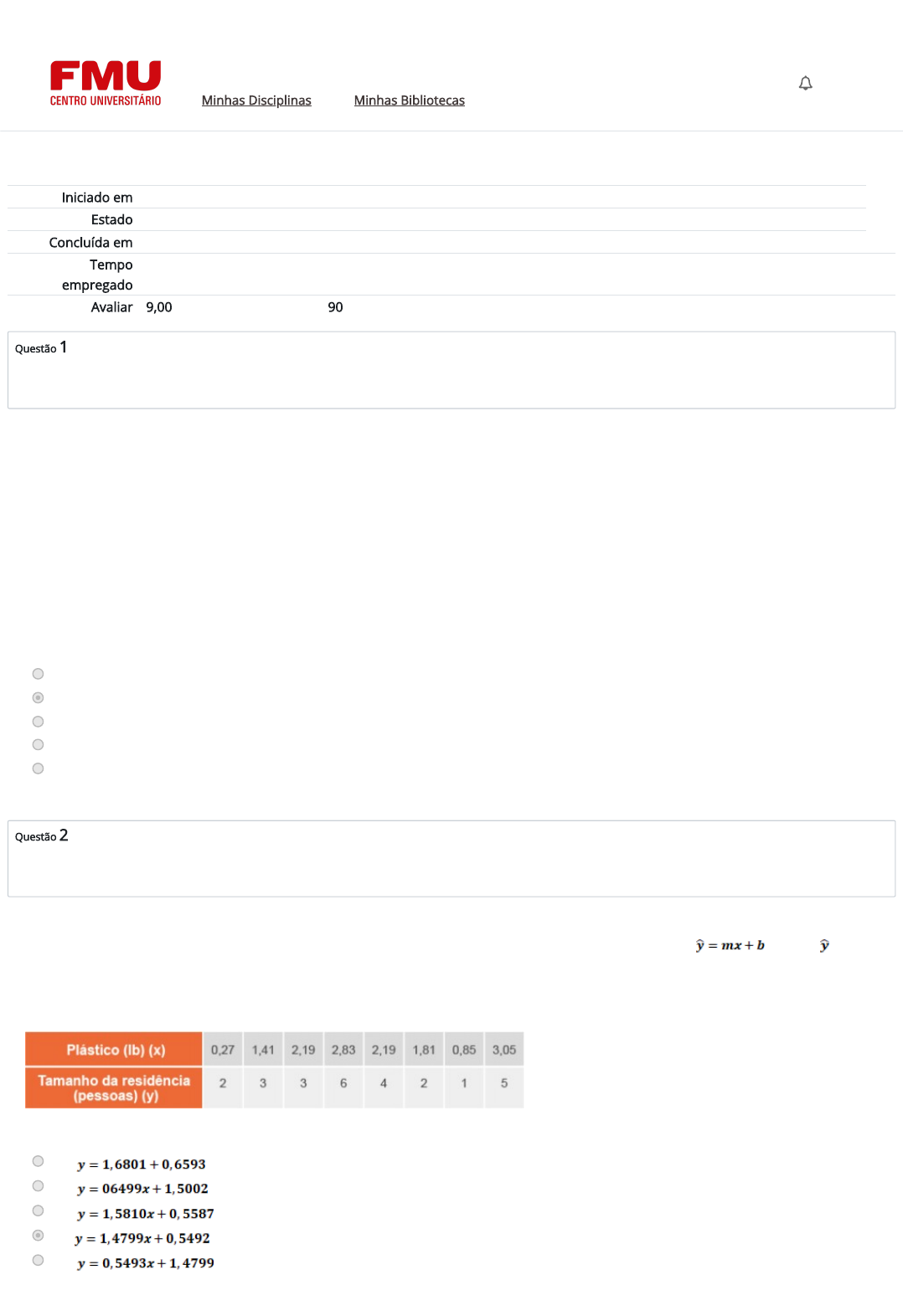 03/06/2024, 10:33 Atividade 2 (A2): Revisão da tentativa https://ambienteacademico.com.br/mod/quiz/review.php?attempt=4489281&cmid=1381550 1/7 Iniciado em segunda, 3 jun 2024, 10:23 Estado Finalizada Concluída em segunda, 3 jun 2024, 10:32 Tempo empregado 9 minutos 1 segundo Avaliar 9,00 de um máximo de 10,00(90%) Questão 1 Incorreto Atingiu 0,00 de 1,00 Questão 2 Correto Atingiu 1,00 de 1,00 A análise de correlação tem por objetivo medir a intensidade de relação entre as variáveis a partir de valores que estão compreendidos no intervalo -1 a 1. Conforme aponta Larson e Farber (2016), quanto mais próximo dos extremos, maior é a correlação entre as variáveis e à medida que o coe�ciente se aproxima de zero signi�ca que não há correlação. LARSON, R.; FARBER, B. Estatística Aplicada. 6. ed. São Paulo: Pearson, 2016. Sobre os tipos de correlação avalie as a�rmativas a seguir. I. Correlação linear positiva ocorre quando a variável dependente está diretamente relacionada com a variável independente. II. Correlação linear negativa ocorre quando a variável dependente tem relação inversamente proporcional com a variável independente III. Há correlação entre as variáveis quando existir uma relação diretamente e inversamente proporcional, de maneira simultânea. É correto o que se a�rma em: a. I e II, apenas. b. I, apenas. c. II e III, apenas. d. I, II e III. e. I e III, apenas. Dada uma coleção de dados amostrais emparelhados, a equação de regressão é expressa a partir da relação , em que é o valor previsto a partir de um valor de x, de m que é a inclinação da reta e de b que é o intercepto em y, ou seja, é o valor de y no ponto onde a reta cruza esse eixo. Diante esse contexto, apresentamos a relação entre a variável peso (em libras) do plástico descartado (x) e a variável tamanho das residências (em pessoas) que o descartam (y): Mediante os calculo efetuado, a equação da reta de regressão linear que melhor ajusta esses valores é igual a: a. b. c. d. e. Guia Digital Carreiras e Internacionalização NAP CPA Responsabilidade Socioambiental Minhas Disciplinas Minhas Bibliotecas GS Aces Recu https://codely-fmu-content.s3.amazonaws.com/Moodle/GuiaDigital/Guia+digital/index.html https://carreiras.fmu.br/ https://codely-fmu-content.s3.amazonaws.com/Moodle/NAP/inicial/nap/fmu/index.html https://codely-fmu-content.s3.amazonaws.com/Moodle/CPA/landing_CPA/index.html https://portal.fmu.br/sustentabilidade https://ambienteacademico.com.br/ https://ambienteacademico.com.br/ https://ambienteacademico.com.br/course/view.php?id=236 03/06/2024, 10:33 Atividade 2 (A2): Revisão da tentativa https://ambienteacademico.com.br/mod/quiz/review.php?attempt=4489281&cmid=1381550 2/7 Questão 3 Correto Atingiu 1,00 de 1,00 De acordo com Triola (2017), o desvio-padrão de um conjunto de valores amostrais é uma medida de variação dos valores em relação à média, sendo calculado pela relação: . TRIOLA, M. Introdução à Estatística. Rio de Janeiro: LTC, 2017 Diante desse contexto e do conjunto de dados 420, 450, 380, 510, 580, 392 e 388, é correto a�rmar que o desvio-padrão referente a esses valores é igual a: a. 435. b. 4769,28. c. 446. d. 69,06. e. 33380. Guia Digital Carreiras e Internacionalização NAP CPA Responsabilidade Socioambiental Minhas Disciplinas Minhas Bibliotecas GS Aces Recu https://codely-fmu-content.s3.amazonaws.com/Moodle/GuiaDigital/Guia+digital/index.html https://carreiras.fmu.br/ https://codely-fmu-content.s3.amazonaws.com/Moodle/NAP/inicial/nap/fmu/index.html https://codely-fmu-content.s3.amazonaws.com/Moodle/CPA/landing_CPA/index.html https://portal.fmu.br/sustentabilidade https://ambienteacademico.com.br/ https://ambienteacademico.com.br/ https://ambienteacademico.com.br/course/view.php?id=236 03/06/2024, 10:33 Atividade 2 (A2): Revisão da tentativa https://ambienteacademico.com.br/mod/quiz/review.php?attempt=4489281&cmid=1381550 3/7 Questão 4 Correto Atingiu 1,00 de 1,00 De acordo com Larson e Farber (2016), o coe�ciente de correlação linear mede a força entre duas variáveis e estabelece sua direção, sendo expresso pela equação: . Esse valor se concentra dentro do intervalo -1 a 1 que expressa a intensidade da relação entre as variáveis, que pode ser forte, moderada ou fraca. LARSON, R.; FARBER, B. Estatística Aplicada. 6. ed. São Paulo: Pearson, 2016. Observe os dados tabelados. Agora, avalie as a�rmativas a seguir. I. II. III. o coe�ciente de correlação linear é IV. V. Está correto o que se a�rma em: a. I, II e III, apenas. b. I, IV e V, apenas. c. III e V, apenas. d. I e II, apenas. e. II, III e IV, apenas. Guia Digital Carreiras e Internacionalização NAP CPA Responsabilidade Socioambiental Minhas Disciplinas Minhas Bibliotecas GS Aces Recu https://codely-fmu-content.s3.amazonaws.com/Moodle/GuiaDigital/Guia+digital/index.html https://carreiras.fmu.br/ https://codely-fmu-content.s3.amazonaws.com/Moodle/NAP/inicial/nap/fmu/index.html https://codely-fmu-content.s3.amazonaws.com/Moodle/CPA/landing_CPA/index.html https://portal.fmu.br/sustentabilidade https://ambienteacademico.com.br/ https://ambienteacademico.com.br/ https://ambienteacademico.com.br/course/view.php?id=236 03/06/2024, 10:33 Atividade 2 (A2): Revisão da tentativa https://ambienteacademico.com.br/mod/quiz/review.php?attempt=4489281&cmid=1381550 4/7 Questão 5 Correto Atingiu 1,00 de 1,00 Questão 6 Correto Atingiu 1,00 de 1,00 De acordo com Triola (2017), o coe�ciente de correlação linear r mede o grau de relacionamento linear entre os valores emparelhados x e y em uma amostra. Esse coe�ciente também recebe a denominação de coe�ciente de correlação momento-produto de Pearson, em homenagem a Karl Pearson (1857-1936). TRIOLA, M. Introdução à Estatística. Rio de Janeiro: LTC, 2017 De acordo com a tabela a seguir, é correto a�rmar que o coe�ciente de correlação linear é igual a: a. 0,797 b. 0,597 