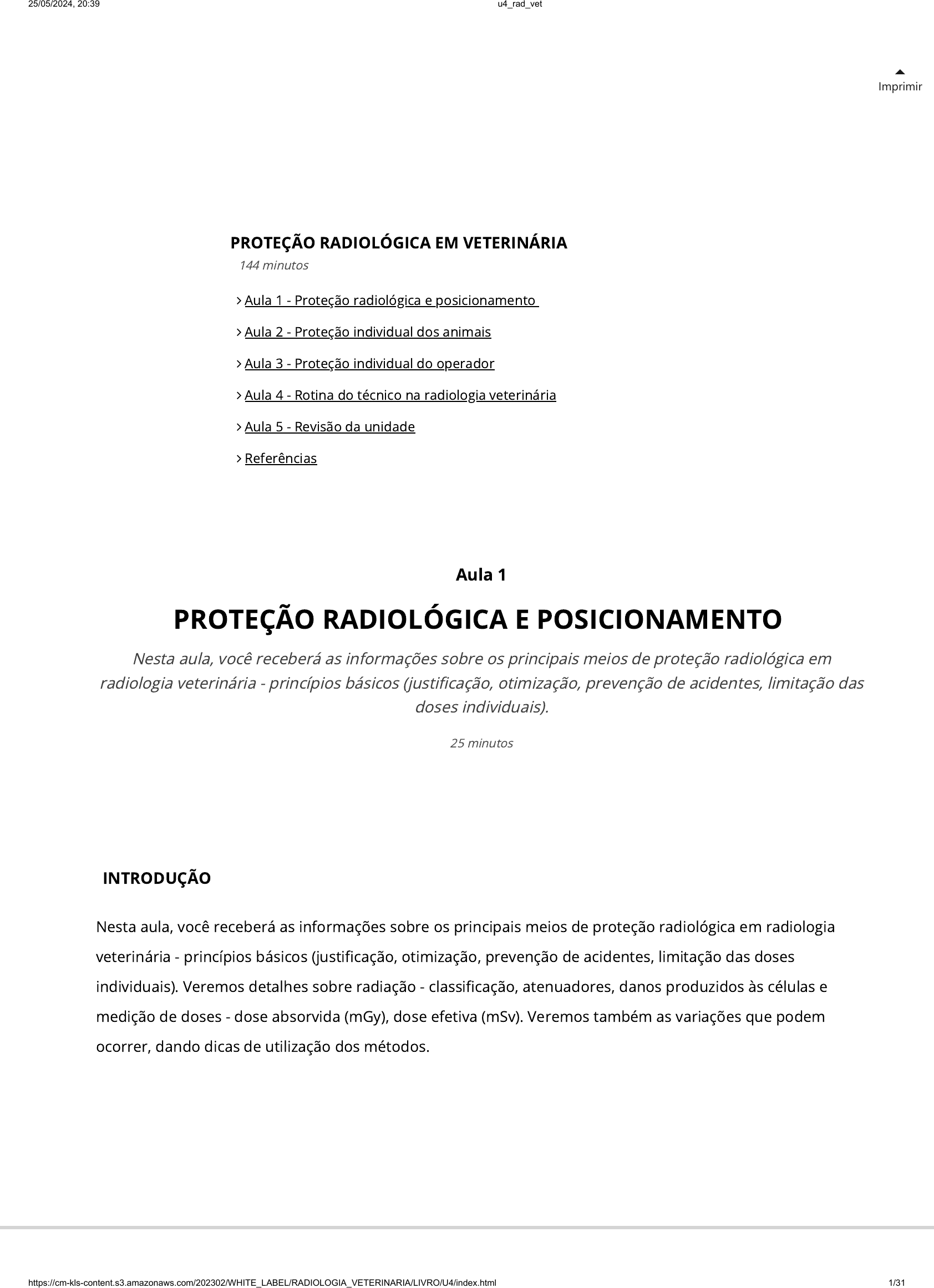 Imprimir INTRODUÇÃO Nesta aula, você receberá as informações sobre os principais meios de proteção radiológica em radiologia veterinária - princípios básicos (justi�cação, otimização, prevenção de acidentes, limitação das doses individuais). Veremos detalhes sobre radiação - classi�cação, atenuadores, danos produzidos às células e medição de doses - dose absorvida (mGy), dose efetiva (mSv). Veremos também as variações que podem ocorrer, dando dicas de utilização dos métodos. Aula 1 PROTEÇÃO RADIOLÓGICA E POSICIONAMENTO Nesta aula, você receberá as informações sobre os principais meios de proteção radiológica em radiologia veterinária - princípios básicos (justi�cação, otimização, prevenção de acidentes, limitação das doses individuais). 25 minutos PROTEÇÃO RADIOLÓGICA EM VETERINÁRIA Aula 1 - Proteção radiológica e posicionamento Aula 2 - Proteção individual dos animais Aula 3 - Proteção individual do operador Aula 4 - Rotina do técnico na radiologia veterinária Aula 5 - Revisão da unidade Referências 144 minutos 25/05/2024, 20:39 u4_rad_vet https://cm-kls-content.s3.amazonaws.com/202302/WHITE_LABEL/RADIOLOGIA_VETERINARIA/LIVRO/U4/index.html 1/31 PRINCÍPIOS BÁSICOS DE PROTEÇÃO RADIOLÓGICA Na rotina da medicina veterinária, temos os pacientes (animais) e os agentes de saúde (humanos) que operam os aparelhos. É muito importante que os princípios de radioproteção sejam seguidos, buscando opções de redução da dose no paciente (animal) e, consequentemente, no corpo técnico também, de forma que a qualidade da imagem não se altere. A proteção radiológica é um instrumento utilizado para proteger os seres humanos dos possíveis danos causados pela radiação, buscando impedir os efeitos determinísticos e diminuir a probabilidade de ocorrência dos efeitos estocásticos em seu uso. O sistema de proteção radiológica está baseado em três princípios gerais: a justi�cação, que determina que nenhum uso de radiação deve ser realizado, a menos que o benefício do seu uso exceda os possíveis riscos a ele atribuídos, tanto para o indivíduo exposto quanto para a sociedade em geral, e que, sempre que possível, deve-se empregar métodos alternativos de diagnóstico que não usem radiação ionizante. Ainda podemos observar a justi�cação sob dois níveis distintos: a justi�cação genérica, determinando que os tipos de práticas existentes devem ser revistos sempre que se adquiram novos dados signi�cativos acerca de sua e�cácia ou de suas consequências, a �m de estabelecer novos parâmetros mais seguros à prática radiológica; e a justi�cação da exposição individual, na qual qualquer exposição funcional deve ser justi�cada de acordo com cada indivíduo, levando em conta os objetivos especí�cos da exposição e as características do indivíduo envolvido, estabelecendo proibições à exposição que não possa ser justi�cada, como uso com objetivos de demonstrações e treinamentos ou para �ns de pesquisa biomédica, com exceção dos alinhados às resoluções do Conselho Nacional de Saúde (CNS). A otimização determina que as doses utilizadas durante os procedimentos radiológicos devem ser tão baixas quanto razoavelmente possível, mantendo a qualidade da imagem, e aplicada a dois níveis na rotina: relacionada aos projetos e construções de equipamentos e instalações e aos procedimentos em si. Por �m, a limitação das doses individuais determina que as doses recebidas pelos operadores e indivíduos em geral não devem exceder os limites estabelecidos pelas normas de radioproteção vigente, no intuito de manter os riscos da exposição dentro dos limites considerados aceitáveis, e deve-se considerar a totalidade das exposições do indivíduo de todas as práticas a que ele possa estar exposto. De modo geral, a dose efetiva média não deve exceder 20 mSv em um ano, em qualquer período de 5 anos consecutivos, e a dose equivalente não deve exceder 500 mSv para extremidades e 150 mSv para o cristalino, no período de um ano. A �m de reduzir a probabilidade de ocorrência de acidentes, todo projeto de operação de equipamentos radiológicos e de instalações deve desenvolver alternativas e aplicar ações para reduzir a possibilidade de falhas técnicas humanas que culminem em exposição acidental desnecessária, como manter as portas do local fechadas durante a execução do exame, utilizar as proteções individuais e evitar a presença de pessoas de forma desnecessária dentro da sala, além de monitorar a exposição à radiação com o uso do monitor individual no período de atividade laboral (CNEN, 2014). Figura 1 | Luz de atenção 25/05/2024, 20:39 u4_rad_vet https://cm-kls-content.s3.amazonaws.com/202302/WHITE_LABEL/RADIOLOGIA_VETERINARIA/LIVRO/U4/index.html 2/31 Fonte: acervo do autor. A Figura 1 ilustra a luz de atenção, informando que a sala está sendo utilizada e a porta deve permanecer fechada. 25/05/2024, 20:39 u4_rad_vet https://cm-kls-content.s3.amazonaws.com/202302/WHITE_LABEL/RADIOLOGIA_VETERINARIA/LIVRO/U4/index.html 3/31 RADIAÇÃO - CLASSIFICAÇÃO, ATENUADORES, DANOS PRODUZIDOS ÀS CÉLULAS A radiação é caracterizada por um processo físico de emissão (saída) e de propagação (deslocamento) de energia por meio de partículas ou de ondas eletromagnéticas em movimento. A radiação eletromagnética é uma combinação de campos elétricos e magnéticos que viajam juntos, oscilando em planos ortogonais em forma de ondas senoidais caracterizadas por dois parâmetros relacionados: frequência e comprimento de onda. A velocidade da radiação eletromagnética é constante, como a velocidade da luz, e é produto da frequência e comprimento de onda. Como a velocidade da radiação eletromagnética é constante, a frequência e o comprimento de onda são inversamente proporcionais; portanto, à medida que a frequência au