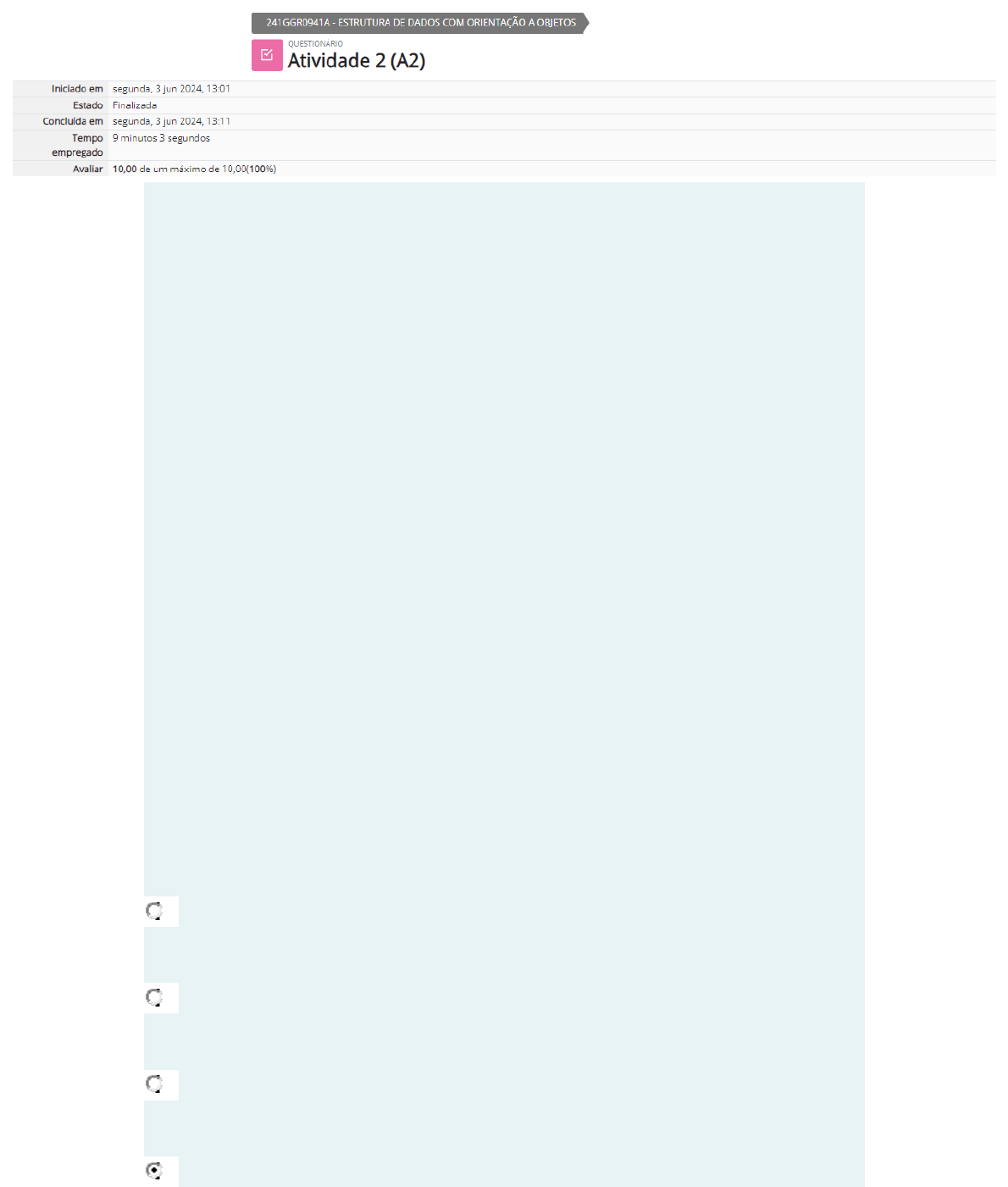 QUESTÃO 1 A árvore de pesquisa binária é uma árvore binária ordenada. Todos os elementos na subárvore esquerda são menores que a raiz, enquanto os elementos presentes na subárvore direita são maiores ou iguais ao elemento do nó raiz. Considerando essas informações e conteúdo estudado sobre as vantagens de se utilizar árvores de pesquisa binárias, analise as afirmativas a seguir e assinale V para a(s) verdadeira(s) e F para a(s) falsa(s). I. A pesquisa é mais eficiente, uma vez que se obtém, em cada etapa, uma dica sobre qual subárvore contém o elemento desejado. II. No processo de pesquisa, ela remove metade da subárvore em cada etapa, se comparada a arrays e listas encadeadas. III. Acelera as operações de inserção e exclusão em comparação com o array e a lista encadeada. IV. Como faz o balanceamento automático de seus elementos, consegue ser mais rápida que as demais árvores binárias. Agora, assinale a alternativa que apresenta a sequência correta. a. F, F, V, V. b. F, V, F, V. c. V, F, F, V. d. V, V, V, F. e. V, F, F, F. Questão 2 Correto Atingiu 1,00 de 1,00 Texto da questão Bianchi et al (2014) afirma que “a manipulação de uma árvore B é possível por meio de diferentes operações. [...] A árvore B é uma árvore N-ária com a restrição de ser balanceada”. Dessa forma, as operações de percurso e de busca por determinado elemento (chave) são idênticas às das árvores N-árias. Fonte: BIANCHI, F.; FREITAS, R.; JUNIOR, D. Estrutura de dados e técnicas de programação. Rio de Janeiro: Elsevier, 2014, p.328. Considerando essas informações e conteúdo estudado sobre a operação de inclusão em Árvore B, pode-se afirmar que são etapas para a inclusão de elementos: I. As chaves são inseridas nos nós folha. II. No caso de precisar verificar o valor do nó raiz e se este valor for nulo, deve-se alocar um nó na raiz; se o valor do nó raiz for maior que o elemento buscado, incluir à esquerda, se não, incluir à direita. III. Se o nó ficar cheio, divida a folha em duas partes e suba a chave central para o nó pai. III. Se o nó pai ficar cheio, repita o processo. No pior caso, repita até a raiz. IV. Se necessário, o nó raiz deverá ser divido e a chave central será transformada em nova raiz. Está correto apenas o que se afirma em: a. III e IV. b. II e III. c. I, II e IV. d. I, III e IV. e. I e II. Questão 3 Correto Atingiu 1,00 de 1,00 Texto da questão Este tipo de árvore é utilizado quando se tem necessidade de manipular uma quantidade maior de dados, principalmente aqueles que se encontram em armazenamento secundário. Neste tipo de estrutura, todas as folhas estão no mesmo nível e todas as chaves de um nó são classificadas em ordem crescente.Esse tipo de árvore cresce e diminui a partir da raiz, característica que a diferencia da árvore de pesquisa binária, que cresce e diminui para baixo. Além disso, a raiz pode conter no mínimo 1 chave e todos os nós (incluindo a raiz) podem conter no máximo t - 1 chaves. Considerando essas informações e conteúdo estudado sobre árvores balanceadas, responda: de qual estrutura de dados estamos falando? a. Árvore genérica. b. Árvore AVL. c. Árvore binária. d. Árvore B. e. Árvore N-ária. Questão 4 Correto Atingiu 1,00 de 1,00 Texto da questão “[...] são árvores binárias em que a distribuição dos elementos é feita respeitando determinadas condições, que vão garantir o balanceamento dessa árvore. [...] O balanceamento é definido a partir das alturas das subárvores nela existentes. Nesse tipo de árvore, a diferença entre as alturas das subárvores esquerda e direita de qualquer nó é de no máximo 1, ou seja, se a altura da subárvore esquerda é N, então, a altura da subárvore direita será igual a N, N-1 ou N+1.” Trata-se de uma árvore binária de busca balanceada. Fonte: BIANCHI, F.; FREITAS, R.; JUNIOR, D. Estrutura de dados e técnicas de programação. Rio de Janeiro: Elsevier, 2014.p.317 Considerando essas informações e conteúdo estudado sobre árvores binárias balanceadas, responda: a que tipo de estrutura específica o texto se refere? a. Árvore N-ária. b. Árvore binária. c. Árvores AVL. d. Árvore B. e. Árvore genérica. Questão 5 Correto Atingiu 1,00 de 1,00 Texto da questão Árvores B são árvores de pesquisa, ordenada, balanceadas e projetadas para funcionar bem em discos magnéticos ou outros dispositivos de armazenamento secundário. É indicada para quando se precisa armazenar um número muito grande de dados e não se pode fazê-lo na memória primária. Existem algumas propriedades específicas para que uma árvore seja considerada uma árvore B. Assim, considerando essas informações e o conteúdo estudado, analise as afirmativas a seguir: I. Neste tipo de estrutura, assegura-se que todas as folhas estejam no mesmo nível. II. Seus nós têm uma chave e sua raiz deve ter dois filhos não vazios. III. Quando os dados são grandes demais para caber na memória, o número de acessos a disco se torna importante. IV. A altura da árvore deve ser o mais baixo possível para aumentar a performance da busca. Agora, assinale a alternativa que apresenta a sequência correta. a. II e IV. b. I, II e III. c. III e IV. d. I e II. e. I, III e IV. Questão 6 Correto Atingiu 1,00 de 1,00 Texto da questão Criadas por Bayes e McCreight em 1972, as árvores binárias são utilizadas em algumas aplicações em que a quantidade de dados é muito grande para que as chaves possam ser armazenadas somente em memória, obrigando a utilização de memória secundária, o que aumenta o tempo de acesso a um só nó de dados. Tais árvores podem ser implementadas de forma estática e dinâmica. Em relação à implementação de árvores binárias, analise as afirmativas a seguir e assinale V para a(s) verdadeira(s) e F para a(s) falsa(s). I. A implementação sequencial usa uma estrutura estática tipo array. II. Na implementação estát