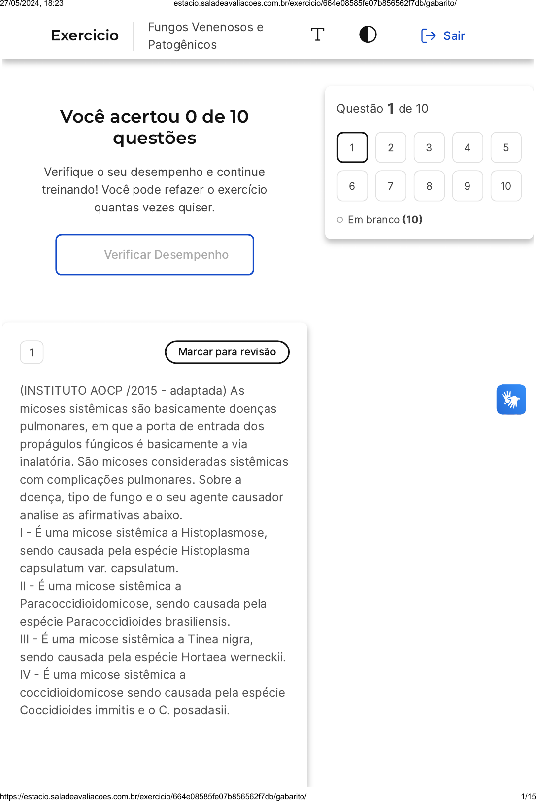 Você acertou 0 de 10 questões Verifique o seu desempenho e continue treinando! Você pode refazer o exercício quantas vezes quiser. Verificar Desempenho 1 Marcar para revisão �INSTITUTO AOCP /2015 � adaptada) As micoses sistêmicas são basicamente doenças pulmonares, em que a porta de entrada dos propágulos fúngicos é basicamente a via inalatória. São micoses consideradas sistêmicas com complicações pulmonares. Sobre a doença, tipo de fungo e o seu agente causador analise as afirmativas abaixo. I � É uma micose sistêmica a Histoplasmose, sendo causada pela espécie Histoplasma capsulatum var. capsulatum. II � É uma micose sistêmica a Paracoccidioidomicose, sendo causada pela espécie Paracoccidioides brasiliensis. III � É uma micose sistêmica a Tinea nigra, sendo causada pela espécie Hortaea werneckii. IV � É uma micose sistêmica a coccidioidomicose sendo causada pela espécie Coccidioides immitis e o C. posadasii. Questão 1 de 10 Em branco �10� 1 2 3 4 5 6 7 8 9 10 Exercicio Fungos Venenosos e Patogênicos Sair 27/05/2024, 18:23 estacio.saladeavaliacoes.com.br/exercicio/664e08585fe07b856562f7db/gabarito/ https://estacio.saladeavaliacoes.com.br/exercicio/664e08585fe07b856562f7db/gabarito/ 1/15 A B C D E Marque a alternativa que apresenta a(s) afirmativa(s) correta(s). As afirmativas I, II e IV estão corretas. Apenas as afirmativas I e IV estão corretas. Apenas as afirmativas I e II estão corretas. Apenas as afirmativas I, II e III estão corretas. Apenas as afirmativas I e III estão corretas. Questão não respondida Opa! A alternativa correta é a letra A. Confira o gabarito comentado! Gabarito Comentado A afirmativa III está incorreta pois a Tinea nigra é uma micose superficial, os fungos causadores das micoses superficiais atingem apenas as camadas mais superficiais da pele. Por não invadirem os tecidos vivos, podem não disparar reações inflamatórias no hospedeiro. 2 Marcar para revisão 27/05/2024, 18:23 estacio.saladeavaliacoes.com.br/exercicio/664e08585fe07b856562f7db/gabarito/ https://estacio.saladeavaliacoes.com.br/exercicio/664e08585fe07b856562f7db/gabarito/ 2/15 A B C D E _____________ é uma micose subcutânea granulomatosa com evolução lenta também causada a partir de um trauma cutâneo. Os agentes causadores dessa micose são fungos demáceos pertencente aos gêneros _____________ , _____________, _____________ e _____________. Selecione as palavras que preenchem corretamente as lacunas. Cromoblastomicose; Fonsecaea; Rhinocladiella; Cladophialophora; Phialophora. Micetoma; Pseudallescheria; Pirenochaeta; Madurella; Acremonium. Esporotricose; S. brasiliensis; S. schenckii; S. globosa; S. albicans. Cromoblastomicose; Sporothrix; Madurella; Fonsecaea; Alternaria. Micetoma; Fonsecaea; Pirenochaeta; Pseudallescheria; Rhinocladiella. Questão não respondida Opa! A alternativa correta é a letra A. Confira o gabarito comentado! Gabarito Comentado A resposta correta é: Cromoblastomicose; Fonsecaea; Rhinocladiella; Cladophialophora; Phialophora. 27/05/2024, 18:23 estacio.saladeavaliacoes.com.br/exercicio/664e08585fe07b856562f7db/gabarito/ https://estacio.saladeavaliacoes.com.br/exercicio/664e08585fe07b856562f7db/gabarito/ 3/15 A B C D E 3 Marcar para revisão A criptococose é uma micose oportunista causada pela levedura Cryptococcus neoformans, a forma mais grave dessa micose é a meningoencefalite. Sobre essa levedura, assinale a alternativa incorreta: Esse fungo tem tropismo pelo sistema nervoso central. O Cryptococcus neoformans pode ser encontrado nas fezes dos pombos O gênero Cryptococcus está restrito ao continente americano. O Cryptococcus neoformans produz uma cápsula polissacarídica. A transmissão ocorre pela inalação das células fúngicas. Questão não respondida Opa! A alternativa correta é a letra C. Confira o gabarito comentado! Gabarito Comentado A alternativa C é a incorreta. A afirmação de que o gênero Cryptococcus está restrito ao continente americano não é verdadeira. Na realidade, o Cryptococcus neoformans, causador da criptococose, é encontrado em todo o mundo, não estando restrito a uma região geográfica específica. Este fungo é comumente encontrado em solos 27/05/2024, 18:23 estacio.saladeavaliacoes.com.br/exercicio/664e08585fe07b856562f7db/gabarito/ https://estacio.saladeavaliacoes.com.br/exercicio/664e08585fe07b856562f7db/gabarito/ 4/15 A B contaminados com fezes de aves, especialmente pombos, e pode ser inalado, levando à infecção. 4 Marcar para revisão �AMEOSC/2021 � adaptada) As micoses subcutâneas são infecções que acomentem camadas da pele mais profundas do que aquelas acometidas nas micoses superficiais. Uma doença dessa categoria é a esporotricose cujos esporos podem entrar por meio de cortes e abrasões na pele e infectar tecidos subcutâneos. Com relação à esporotricose, marque a alternativa correta. É uma doença fúngica, e o organismo causador, Sporothrix schenckii uma levedura e tem alto risco de transmissão pela mordedura e/ou arranhadura de animais infectados, como os morcegos. É uma doença fúngica, e o organismo causador, Sporothrix schenckii é um fungo dimórfico. É considerada uma zoonose emergente, de impactos à saúde pública, sendo os gatos os principais animais afetados e associados à transmissão aos humanos. 27/05/2024, 18:23 estacio.saladeavaliacoes.com.br/exercicio/664e08585fe07b856562f7db/gabarito/ https://estacio.saladeavaliacoes.com.br/exercicio/664e08585fe07b856562f7db/gabarito/ 5/15 C D E É causada pelo fungo Histoplasma capsulatum, um protozoário esporulado que nos eqüinos apresenta distribuição mundial. É uma doença causada pelo protozoário Trichophyton e infecções nos pés e em outras superfícies úmidas da pele são bastante comuns, que, em geral, não invadem o tecido subcutâneo, ficando suas infecções restritas aos extratos queratinizados da pele e anexos. É uma doença fúngica, e o organismo causador,