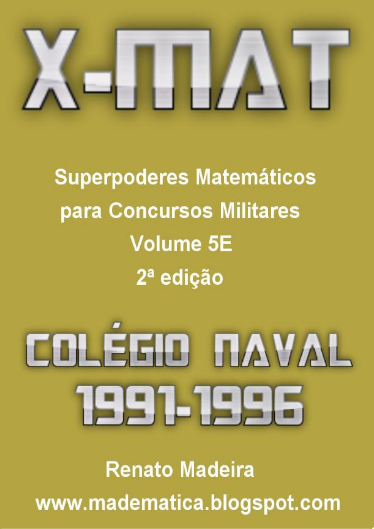 www.madematica.blogspot.com 1 X-MAT: Superpoderes Matemáticos para Concursos Militares Renato Madeira www.madematica.blogspot.com 1 Sumário INTRODUÇÃO ..................................................................................................................................... 2 CAPÍTULO 1 - ENUNCIADOS ........................................................................................................... 3 PROVA DE MATEMÁTICA – COLÉGIO NAVAL – 1995-1996 .................................................. 3 PROVA DE MATEMÁTICA – COLÉGIO NAVAL – 1994/1995 .................................................. 9 PROVA DE MATEMÁTICA – COLÉGIO NAVAL – 1993/1994 ................................................ 14 PROVA DE MATEMÁTICA – COLÉGIO NAVAL – 1991/1992 ................................................ 20 PROVA DE MATEMÁTICA – COLÉGIO NAVAL – 1990/1991 ................................................ 26 CAPÍTULO 2 ....................................................................................................................................... 32 RESPOSTAS E CLASSIFICAÇÃO DAS QUESTÕES ..................................................................... 32 QUADRO RESUMO DAS QUESTÕES DE 1984 A 2016 ........................................................ 35 CLASSIFICAÇÃO DAS QUESTÕES POR ASSUNTO ........................................................... 36 CAPÍTULO 3 ....................................................................................................................................... 40 ENUNCIADOS E RESOLUÇÕES ..................................................................................................... 40 PROVA DE MATEMÁTICA – COLÉGIO NAVAL – 1995/1996 ................................................ 40 NOTA 1: REGRA DE TRÊS ....................................................................................................... 52 PROVA DE MATEMÁTICA – COLÉGIO NAVAL – 1994/1995 ................................................ 56 NOTA 2: FÓRMULA DE NEWTON: ........................................................................................ 66 PROVA DE MATEMÁTICA – COLÉGIO NAVAL – 1993/1994 ................................................ 70 NOTA 3: TERCEIRA PROPORCIONAL E QUARTA PROPORCIONAL ............................. 73 NOTA 4: ÁREA DE TRIÂNGULOS.......................................................................................... 75 PROVA DE MATEMÁTICA – COLÉGIO NAVAL – 1991/1992 ................................................ 97 NOTA 5: REPRESENTAÇÃO DECIMAL DE FRAÇÕES ..................................................... 105 PROVA DE MATEMÁTICA – COLÉGIO NAVAL – 1990/1991 .............................................. 113 NOTA 6: JUROS SIMPLES ...................................................................................................... 118 X-MAT: Superpoderes Matemáticos para Concursos Militares Renato Madeira www.madematica.blogspot.com 2 INTRODUÇÃO Esse livro é uma coletânea com as questões das Provas de Matemática do Concurso de Admissão ao Colégio Naval (CN) dos anos de 1984 a 2016, mais uma “faixa bônus” com 40 questões anteriores a 1984, detalhadamente resolvidas e classificadas por assunto. Na parte E serão apresentadas as provas de 1991 a 1996, totalizando 100 questões (não houve o concurso 1992-1993). No capítulo 1 encontram-se os enunciados das provas, para que o estudante tente resolvê-las de maneira independente. No capítulo 2 encontram-se as respostas às questões e a sua classificação por assunto. É apresentada também uma análise da incidência dos assuntos nesses 35 anos de prova. No capítulo 3 encontram-se as resoluções das questões. É desejável que o estudante tente resolver as questões com afinco antes de recorrer à sua resolução. Espero que este livro seja útil para aqueles que estejam se preparando para o concurso da Colégio Naval ou concursos afins e também para aqueles que apreciam Matemática. Renato de Oliveira Caldas Madeira é engenheiro aeronáutico pelo Instituto Tecnológico de Aeronáutica (ITA) da turma de 1997 e Mestre em Matemática Aplicada pelo Fundação Getúlio Vargas (FGV-RJ); participou de olimpíadas de Matemática no início da década de 90, tendo sido medalhista em competições nacionais e internacionais; trabalha com preparação em Matemática para concursos militares há 20 anos e é autor do blog “Mademática”. AGRADECIMENTOS Gostaria de agradecer aos professores que me inspiraram a trilhar esse caminho e à minha família pelo apoio, especialmente, aos meus pais, Cézar e Sueli, pela dedicação e amor. Gostaria ainda de dedicar esse livro à minha esposa Poliana pela ajuda, compreensão e amor durante toda a vida e, em particular, durante toda a elaboração dessa obra e a meus filhos Daniel e Davi que eu espero sejam futuros leitores deste livro. Renato Madeira Acompanhe o blog www.madematica.blogspot.com e fique sabendo do lançamento dos próximos volumes da coleção X-MAT! Volumes já lançados: Livro X-MAT Volume 1 EPCAr 2011-2015 Livro X-MAT Volume 2 AFA 2010-2015 Livro X-MAT Volume 3 EFOMM 2009-2015 Livro X-MAT Volume 4 ESCOLA NAVAL 2010-2015 Livro X-MAT Volume 6 EsPCEx 2011-2016 http://www.madematica.blogspot.com/ X-MAT: Superpoderes Matemáticos para Concursos Militares Renato Madeira ENUNCIADOS CN 1995-1996 www.madematica.blogspot.com 3 CAPÍTULO 1 - ENUNCIADOS PROVA DE MATEMÁTICA – COLÉGIO NAVAL – 1995-1996 1) Sejam os triângulos ABC e MPQ , tais que: I - ˆˆMPQ ACB 90 II - ˆPQM 70 III - ˆBAC 50 IV - AC MP Se PQ x e BC y , então AB é igual a: (A) x y (B) 2 2x y (C) 2 2xy x y (D) 2 xy x y (E) 2x y 2) No triângulo ABC , retângulo em A , da figura, AB c , AC b , AM 2 e AH é a altura relativa ao lado BC . Qual é a área do triângulo AHM ? (A) 2 2 bc b c (B) 2 2 2 2 b c b c (C) 2 2 2 bc b c X-MAT: Superpoderes Matemáticos para Con
