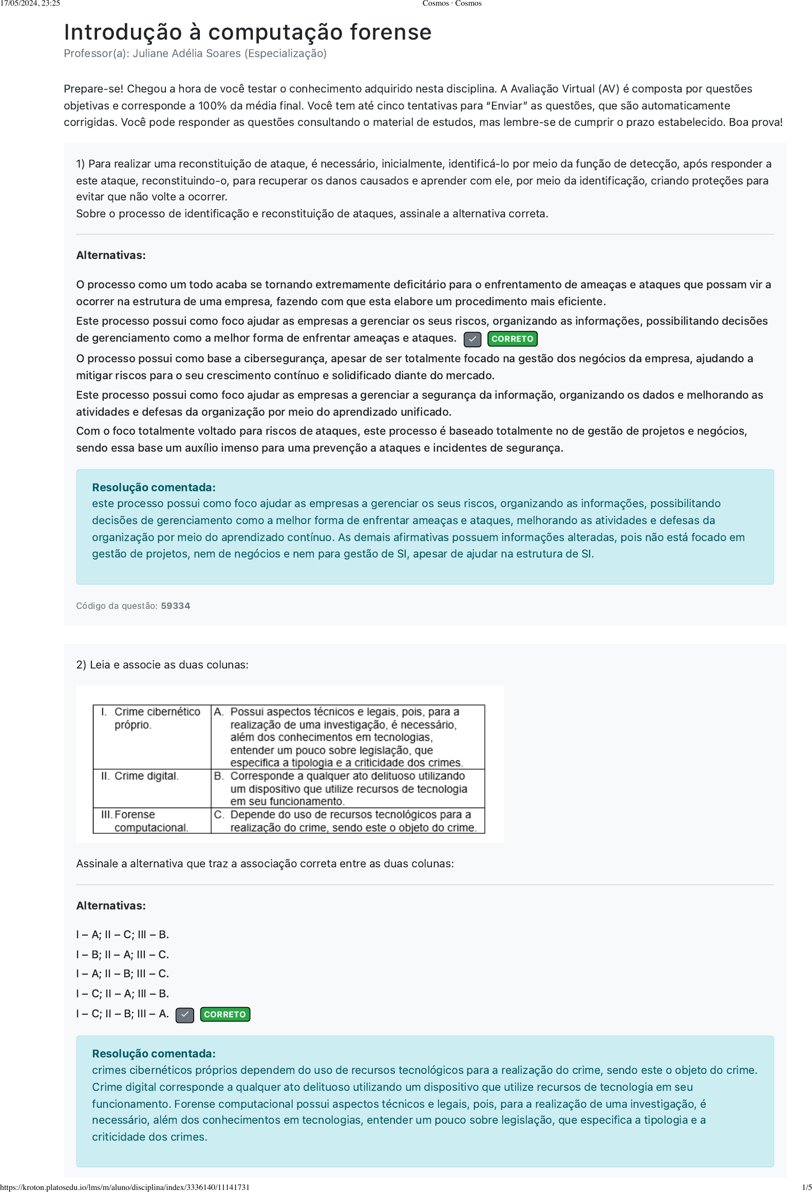 Introdução à computação forense Professor(a): Juliane Adélia Soares (Especialização) 1) 2) Prepare-se! Chegou a hora de você testar o conhecimento adquirido nesta disciplina. A Avaliação Virtual (AV) é composta por questões objetivas e corresponde a 100% da média final. Você tem até cinco tentativas para “Enviar” as questões, que são automaticamente corrigidas. Você pode responder as questões consultando o material de estudos, mas lembre-se de cumprir o prazo estabelecido. Boa prova! Para realizar uma reconstituição de ataque, é necessário, inicialmente, identificá-lo por meio da função de detecção, após responder a este ataque, reconstituindo-o, para recuperar os danos causados e aprender com ele, por meio da identificação, criando proteções para evitar que não volte a ocorrer. Sobre o processo de identificação e reconstituição de ataques, assinale a alternativa correta. Alternativas: O processo como um todo acaba se tornando extremamente deficitário para o enfrentamento de ameaças e ataques que possam vir a ocorrer na estrutura de uma empresa, fazendo com que esta elabore um procedimento mais eficiente. Este processo possui como foco ajudar as empresas a gerenciar os seus riscos, organizando as informações, possibilitando decisões de gerenciamento como a melhor forma de enfrentar ameaças e ataques. CORRETO O processo possui como base a cibersegurança, apesar de ser totalmente focado na gestão dos negócios da empresa, ajudando a mitigar riscos para o seu crescimento contínuo e solidificado diante do mercado. Este processo possui como foco ajudar as empresas a gerenciar a segurança da informação, organizando os dados e melhorando as atividades e defesas da organização por meio do aprendizado unificado. Com o foco totalmente voltado para riscos de ataques, este processo é baseado totalmente no de gestão de projetos e negócios, sendo essa base um auxílio imenso para uma prevenção a ataques e incidentes de segurança. Código da questão: 59334 Leia e associe as duas colunas: Assinale a alternativa que traz a associação correta entre as duas colunas: Alternativas: I – A; II – C; III – B. I – B; II – A; III – C. I – A; II – B; III – C. I – C; II – A; III – B. I – C; II – B; III – A. CORRETO Resolução comentada: este processo possui como foco ajudar as empresas a gerenciar os seus riscos, organizando as informações, possibilitando decisões de gerenciamento como a melhor forma de enfrentar ameaças e ataques, melhorando as atividades e defesas da organização por meio do aprendizado contínuo. As demais afirmativas possuem informações alteradas, pois não está focado em gestão de projetos, nem de negócios e nem para gestão de SI, apesar de ajudar na estrutura de SI. Resolução comentada: crimes cibernéticos próprios dependem do uso de recursos tecnológicos para a realização do crime, sendo este o objeto do crime. Crime digital corresponde a qualquer ato delituoso utilizando um dispositivo que utilize recursos de tecnologia em seu funcionamento. Forense computacional possui aspectos técnicos e legais, pois, para a realização de uma investigação, é necessário, além dos conhecimentos em tecnologias, entender um pouco sobre legislação, que especifica a tipologia e a criticidade dos crimes. 17/05/2024, 23:25 Cosmos · Cosmos https://kroton.platosedu.io/lms/m/aluno/disciplina/index/3336140/11141731 1/5 3) 4) Código da questão: 59325 Sobre a computação forense e o processo de perícia a ser realizado, podemos afirmar que: I. A procura de evidências é necessária para examinar e encontrar vestígios de alguma prova de invasão, alteração em arquivos ou nos sistemas de computadores. II. A utilização de métodos-padrão para preservar, coletar, restaurar, identificar, documentar e apresentar as evidências será capaz de determinar se um sistema foi violado ou não. III. O procedimento de engenharia computacional é necessário para examinar e encontrar vestígios de alguma prova de invasão, alteração em arquivos ou nos sistemas de computadores. IV. No processo de segurança da informação, a evidência é baseada em vestígios tecnológicos e transforma esses itens encontrados em provas. V. O procedimento de coleta de dados segue as seguintes etapas: obtenção de informações e coleta dos dados, identificação, preservação, análise e apresentação dos dados. São verdadeiras: Alternativas: I – II – V. CORRETO I – II – III. I – III – IV. II – V. I – II – IV. Código da questão: 59317 Sobre o plano de DR e sua capacidade de análise diante das fragilidades de uma organização, considere as seguintes afirmações e classifique-as como verdadeiras (V) ou falsas (F): ( ) Para garantir a eficiência do plano de DR após um desastre, é necessário que a estrutura já esteja restabelecida. ( ) Cada etapa deverá ser considerada para o restabelecimento da estrutura na execução dos procedimentos do plano de DR. ( ) A perda parcial é um dos cenários que deverão ser levados em conta durante as estratégias de DR. ( ) Na ativação de contingência, a avaliação se dará pela análise dos dados finais. ( ) No cenário da perda parcial, leva-se em conta o restabelecimento mínimo. Assinale a alternativa que contenha a sequência correta: Alternativas: F – V – F – F – V. F – V – V – F – V. CORRETO V – F – F – V – V. V – V – V – F – V. F – F – V – F – F. Código da questão: 59344 Resolução comentada: a afirmação I é verdadeira, pois a procura de evidências é necessária para examinar e encontrar vestígios de alguma prova de invasão, alteração em arquivos ou nos sistemas de computadores. A II é verdadeira, pois, com a utilização de métodos padronizados, é possível determinar se um sistema foi violado ou não. Já a III está incorreta, pois a procura de evidências é necessária para examinar