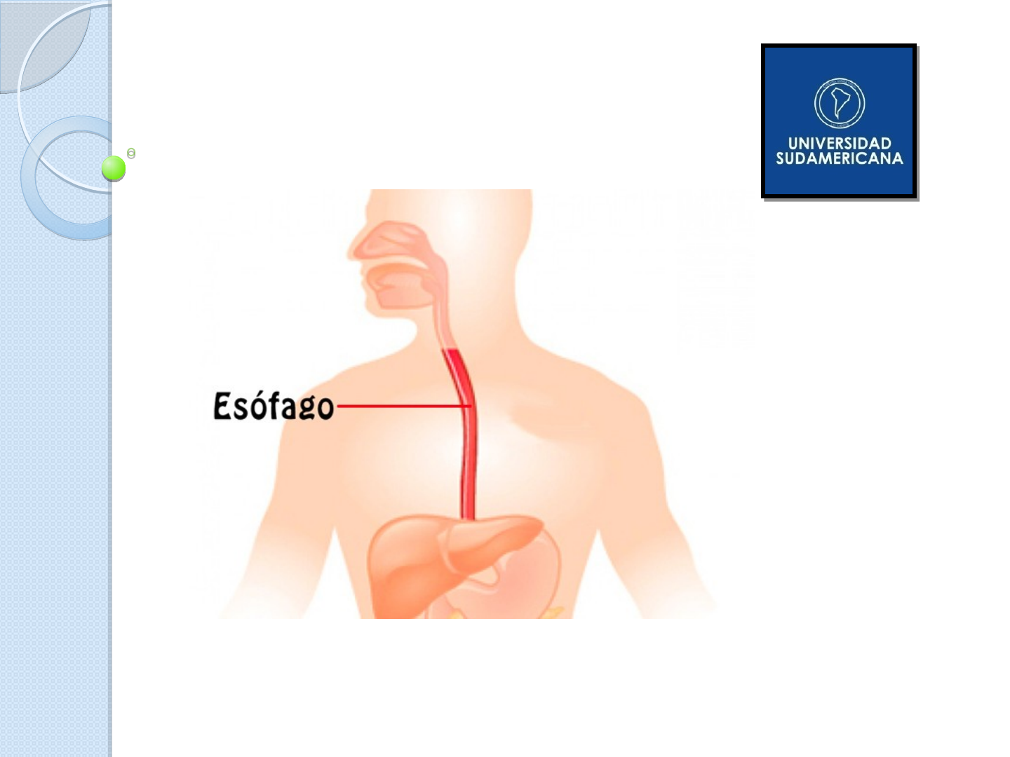 TRASTORNOS DEL ESÓFAGO Dr. Donoband Melgarejo Jefe de Cátedra– FCS-US Introducción Existen esfínteres en ambos extremos del esófago El esfínter esofágico superior, o faringoesofágico Capa circular de músculo estriado, el músculo cricofaríngeo.. El esfínter esofágico inferior, o gastroesofágico, Área de 3 cm por encima de la unión con el estómago Más que una estructura anatómica real, es de tipo fisiológico (actúa como válvula, pero la única evidencia estructural de la existencia de un esfínter es un engrosamiento discreto del músculo liso circular. En esta porción el músculo liso, por lo regular, permanece en contracción tónica, lo que genera una presión intraluminal cercana a 30 mm Hg, en contraste con la porción intermedia del esófago, que en condiciones normales permanece relajada. El esfínter esofágico inferior pasa a través de una abertura, o hiato, en el diafragma, al tiempo que se une al estómago, que se ubica dentro del abdomen. La porción del diafragma que circunda al esfínter esofágico inferior ayuda a mantener la zona de alta presión necesaria para evitar el reflujo del contenido gástrico.. Introducción Función: Conducto para el paso de los alimentos y líquidos desde la faringe hasta el estómago. Sus paredes están conformadas por una capa mucosa, una submucosa, una muscular externa y una adventicia, La capa mucosa interna contiene epitelio estratificado no queratinizado. En la unión esofagogástrica, el epitelio resistente a la abrasión experimenta una transformación abrupta para convertirse en el epitelio cilíndrico simple del estómago. La capa submucosa contiene glándulas secretoras de moco que aportan fluidos que contienen mucina, que lubrican la pared esofágica y facilitan el paso de los alimentos. La capa muscular externa está compuesta por músculo esquelético en el tercio proximal del esófago, una mezcla de músculo esquelético y liso en su tercio medio, y músculo liso en su tercio distal. La capa adventicia fibrosa externa está constituida en su totalidad por tejido conectivo, que se mezcla con las estructuras circundantes a lo largo de su recorrido. Anomalías congénitas Son incompatibles con la vida. La atresia esofágica (AE) y la fístula traqueoesofágica (FTE) . En la variante más común de la AE, que representa el 85% de los casos, la porción proximal del esófago termina en una bolsa ciega y existe una FTE conectada a la tráquea. Tasa de sobrevivencia superior a el 90% Los neonatos con peso inferior a 1 500 g al nacer tienen un riesgo más alto de mortalidad, en particular si la anomalía esofágica coexiste con una cardíaca. Anomalías congénitas Disfagia Disfagia Dificultad para la deglución. El acto de deglutir depende de la acción coordinada de la lengua y la faringe. Inervadas por los pares craneales V, IX, X y XII. Odinofagia La disfagia puede derivar de causas neuromusculares o estructurales. Estrechamiento del esófago, falta de secreción salival, debilidad de las estructuras musculares que impulsan el bolo alimentario hacia el estómago, o interrupción de las redes neurales que coordinan el mecanismo de la deglución. Lesiones del SNC (ACV) - cáncer y estenosis del esófago - escleroderma – acalasia. Divertículo esofágico Es una herniación de la pared esofágica que deriva de un debilitamiento de su capa muscular. Tiende a retener alimentos. El alimento atrapado puede inducir esofagitis y ulceración. Divertículo esofágico Desgarros (síndrome de Mallory-Weiss) Desgarros longitudinales, en la unión esofagogástrica que, con frecuencia, se extienden en dirección distal Alcoholismo crónico después de un período de arqueo o vómito intensos También pueden durante algún cuadro patológico agudo con emesis intensa. Se presume, deriva de una relajación inadecuada del esfínter esofágico durante el vómito, con distensión y desgarro de la unión esofágica en el momento de la expulsión propulsiva del contenido gástrico. Pueden afectar sólo a la mucosa o penetrar la pared del esófago. La infección puede conducir a la formación de una úlcera inflamatoria o a una mediastinitis. Con mayor frecuencia la hemorragia no es intensa y no se requiere intervención quirúrgica. La hemorragia grave suele responder al consumo de medicamentos vasoconstrictores, transfusiones y compresión con balón. La cicatrización suele ser rápida, con efectos residuales mínimos o nulos. Desgarros (síndrome de Mallory-Weiss) Hernia hiatal Protrusiónb o herniación del estómago a través del hiato esofágico del diafragma. Existen 2 patrones anatómicos de herniación hiatal: La hernia hiatal deslizante o axial: protrusión del estómago en forma de campana por encima del diafragma. Las pequeñas son comunes y se consideran insignificantes en personas asintomáticas. En casos de esofagitis erosiva grave en que coexisten el reflujo gastroesofágico y una hernia hiatal grande, ésta pudiera retrasar la eliminación del ácido a partir del esófago y contribuir a una esofagitis más grave, en particular al desarrollo de esófago de Barrett. En las hernias hiatales paraesofágicas o no axial: una porción independiente del estómago, por lo general ubicada a lo largo de la curva mayor de la víscera, ingresa al tórax a través de una abertura ampliada y luego aumenta de tamaño en forma progresiva. En casos extremos, la mayor parte del estómago se hernia hacia el tórax. Las grandes pueden requerir tratamiento quirúrgico. Hernia hiatal Reflujo gastroesofágico Desplazamiento retrógrado del contenido gástrico hacia el esófago, condición que genera ardor epigástrico o pirosis. Es probable que se trate del trastorno más frecuente que se origina en el tubo GI. Los síntomas asociados suelen presentarse después de comer, Tienen duración corta y rara vez generan problemas más graves. Reflujo gastroesofágico El esfínter esofágico inferior regula el flujo de alimentos del esófago haci