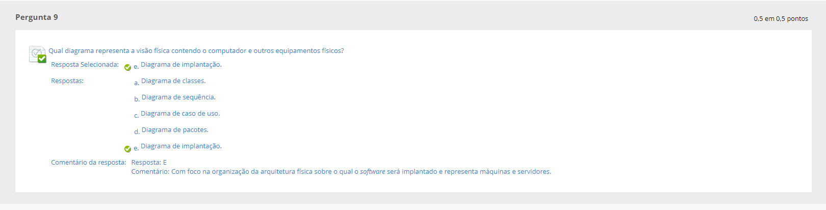 Com foco na organização da arquitetura física sobre qual o software será implantado e representa máquinas e servidores. Qual diagrama representa a visão física contendo computador e outros equipamentos físicos? a. Diagrama de classes. b. Diagrama de sequência. C. Diagrama de caso de uso. d. Diagrama de pacotes. e. Diagrama de implantação.