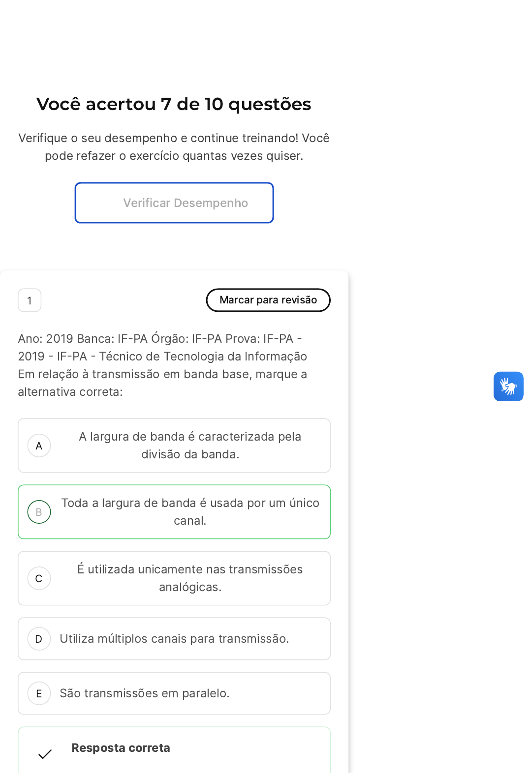 Você acertou 7 de 10 questões Verifique o seu desempenho e continue treinando! Você pode refazer o exercício quantas vezes quiser. Verificar Desempenho A B C D E 1 Marcar para revisão Ano: 2019 Banca: IF�PA Órgão: IF�PA Prova: IF�PA � 2019 � IF�PA � Técnico de Tecnologia da Informação Em relação à transmissão em banda base, marque a alternativa correta: A largura de banda é caracterizada pela divisão da banda. Toda a largura de banda é usada por um único canal. É utilizada unicamente nas transmissões analógicas. Utiliza múltiplos canais para transmissão. São transmissões em paralelo. Resposta correta A B Parabéns, você selecionou a alternativa correta. Confira o gabarito comentado! Gabarito Comentado A alternativa correta é a B, que afirma que toda a largura de banda é usada por um único canal. Isso ocorre na transmissão em banda base, onde a totalidade da largura de banda do meio de transmissão é utilizada por um único canal. Quando há a necessidade de dividir a largura de banda entre mais de um transmissor, é utilizada a técnica de multiplexação de canais. A multiplexação em frequência, por exemplo, é utilizada para canais analógicos. Portanto, a afirmação da alternativa B está correta e condiz com o conceito de transmissão em banda base. 2 Marcar para revisão O processo de comunicação tem por objetivo trocar informação entre o emissor e o receptor. Avalie as afirmações a seguir, relativas ao processo de comunicação: I. No processo de comunicação, o transmissor gera a informação, que é a mensagem que será transmitida. II. São quatro os componentes da comunicação de dados: mensagem, emissor, receptor e protocolo. III. Os dados a serem transmitidos por um canal de comunicação podem ser analógicos ou digitais. Está(ão) correta(s) a(s) afirmativa(s) I, apenas. II, apenas. C D E III, apenas. I e II, apenas. I e III, apenas. Resposta incorreta Opa! A alternativa correta é a letra E. Confira o gabarito comentado! Gabarito Comentado A alternativa I está correta, pois no processo de comunicação, o emissor (ou transmissor) é quem gera a informação, que é a mensagem a ser transmitida. A alternativa II, no entanto, está incorreta. O processo de comunicação de dados envolve cinco componentes, não quatro. Além da mensagem, do emissor, do receptor e do protocolo, também é necessário um meio de transmissão. Por fim, a alternativa III está correta. Os dados que são transmitidos por um canal de comunicação podem ser de dois tipos: analógicos, que são contínuos no tempo, ou digitais, que são discretos no tempo. Portanto, as afirmativas I e III estão corretas, o que faz da alternativa E a resposta correta para esta questão. 3 Marcar para revisão Ano: 2019 Banca: IF�PA Órgão: IF�PA Prova: IF�PA � 2019 � IF�PA � Técnico de Tecnologia da Informação Analise as alternativas: I. O sinal analógico é caracterizado pela contínua variação da onda eletromagnética. A B C D E II. O sinal analógico suporta um único canal de comunicação. III. O sinal digital é uma sequência de pulsos de voltagem. IV. O sinal digital pode ser transmitido sobre meios guiados. Somente as alternativas I, II e IV estão corretas. Somente as alternativas I e II estão corretas. Somente as alternativas II e IV estão corretas. Somente as alternativas I, III e IV estão corretas. Somente as alternativas II e III estão corretas. Resposta incorreta Opa! A alternativa correta é a letra D. Confira o gabarito comentado! Gabarito Comentado A alternativa II está incorreta, pois o sinal analógico pode ser multiplexado, o que permite a geração de mais de um canal no mesmo meio físico. As demais alternativas estão corretas. A alternativa I está correta porque o sinal analógico é caracterizado pela contínua variação da onda eletromagnética. A alternativa III está correta, pois o sinal digital é uma sequência de pulsos de voltagem. E a alternativa IV também está correta, pois o sinal digital pode ser transmitido sobre meios guiados. Portanto, as A B C D E alternativas I, III e IV estão corretas, o que faz da alternativa D a resposta correta para esta questão. 4 Marcar para revisão Ano: 2016 Banca: FUNIVERSA Órgão: IF�AP Prova: FUNIVERSA � 2016 � IF�AP � Tecnólogo Redes de Computadores Com base nos fundamentos da transmissão de dados, o termo que se refere à medida efetiva da rapidez com que se pode enviar dados em uma rede é Comprimento de bits. Jitter. Tempo de fila. Latência. Throughput. Resposta correta Parabéns, você selecionou a alternativa correta. Confira o gabarito comentado! Gabarito Comentado O termo "Throughput" é a medida efetiva da rapidez com que se pode enviar dados em uma rede. Ele é diferente da largura de banda, que é a capacidade teórica de transferência de dados. O Throughput determina a taxa de transferência de A B C D E dados real entre dois hosts, que pode ser afetada por diversos fatores, como congestionamentos, retardo e perda de pacotes. Portanto, é a alternativa correta para a questão. 5 Marcar para revisão Ano: 2016 Banca: IF�PA Órgão: IF�PA Prova: IF�PA � 2016 � IF�PA � Técnico de Tecnologia da informação Sobre a modalidade de transmissão de dados, pode-se dizer que a transmissão serial é Aquela em que todos os bytes são enviados de uma só vez e são recebidos de um em um. Aquela em que os bits são enviados paralelamente em um fio só. Feita somente em dispositivos de entrada de dados. Aquela que transmite bytes em série. Aquela em que os bits são transmitidos um por vez. Resposta correta Parabéns, você selecionou a alternativa correta. Confira o gabarito comentado! Gabarito Comentado A transmissão serial é caracterizada pela transmissão de bits de forma sequencial, ou seja, A B C um por vez. Diferentemente da transmissão paralela, onde todos os bits são enviados simultaneamente, a transmissão serial e
