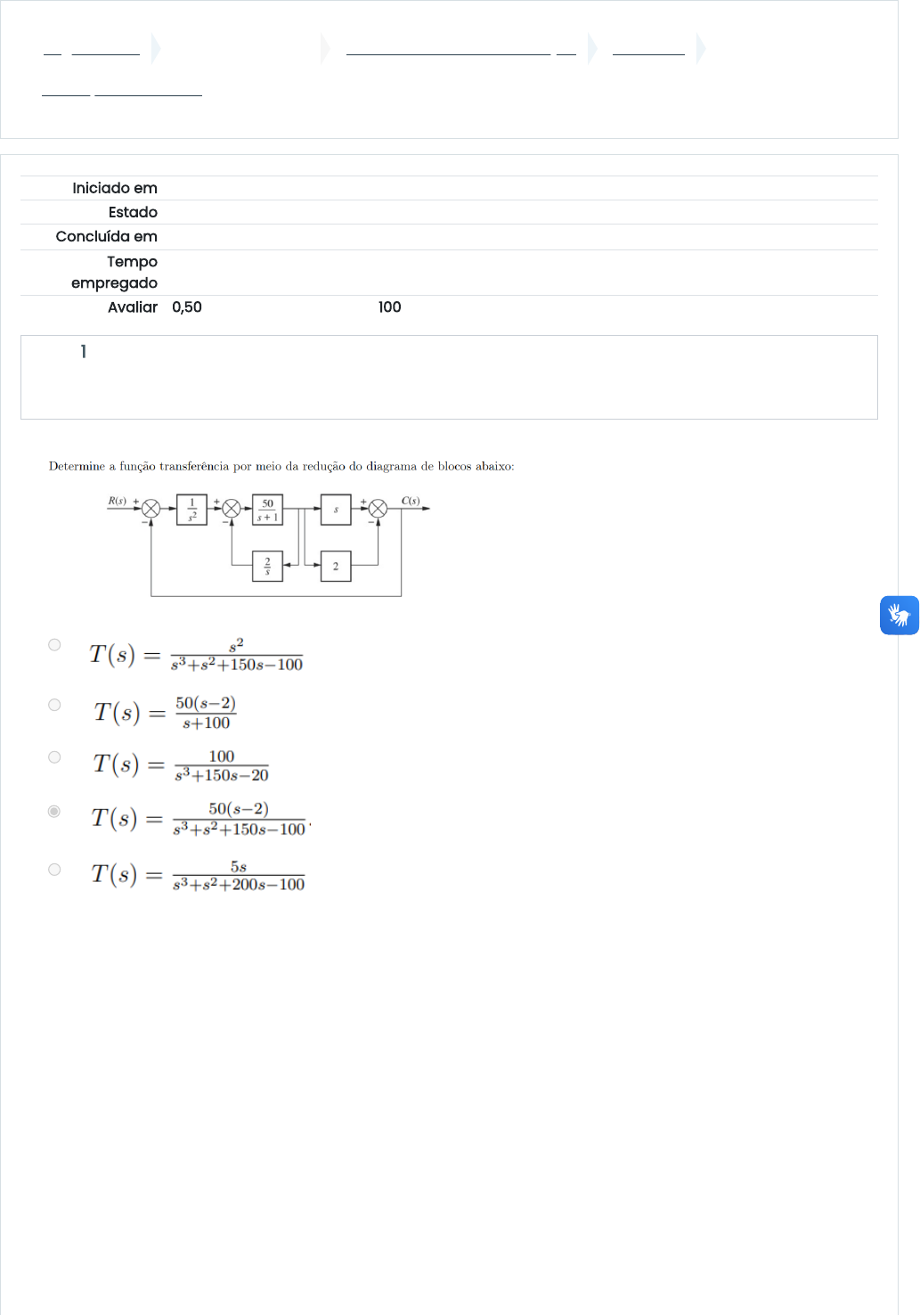 Página inicial Minhas disciplinas 2024/2 - Controle e Automação UNIDADE II Avaliação - Unidade II Iniciado em terça, 21 mai 2024, 19:47 Estado Finalizada Concluída em terça, 21 mai 2024, 19:55 Tempo empregado 7 minutos 58 segundos Avaliar 0,50 de um máximo de 0,50(100%) Questão 1 Correto Atingiu 0,05 de 0,05 a. b. c. d. e. 02/06/2024, 09:45 Avaliação - Unidade II: Revisão da tentativa https://ambienteonline.uninga.br/mod/quiz/review.php?attempt=2880321&cmid=725311 1/7 https://ambienteonline.uninga.br/ https://ambienteonline.uninga.br/course/view.php?id=27080 https://ambienteonline.uninga.br/course/view.php?id=27080§ion=4 https://ambienteonline.uninga.br/mod/quiz/view.php?id=725311 Questão 2 Correto Atingiu 0,05 de 0,05 Questão 3 Correto Atingiu 0,05 de 0,05 a. b. c. d. e. a. b. c. d. e. 02/06/2024, 09:45 Avaliação - Unidade II: Revisão da tentativa https://ambienteonline.uninga.br/mod/quiz/review.php?attempt=2880321&cmid=725311 2/7 Questão 4 Correto Atingiu 0,05 de 0,05 a. b. c. d. e. 02/06/2024, 09:45 Avaliação - Unidade II: Revisão da tentativa https://ambienteonline.uninga.br/mod/quiz/review.php?attempt=2880321&cmid=725311 3/7 Questão 5 Correto Atingiu 0,05 de 0,05 Questão 6 Correto Atingiu 0,05 de 0,05 a. b. c. d. e. a. b. c. d. e. 02/06/2024, 09:45 Avaliação - Unidade II: Revisão da tentativa https://ambienteonline.uninga.br/mod/quiz/review.php?attempt=2880321&cmid=725311 4/7 Questão 7 Correto Atingiu 0,05 de 0,05 Questão 8 Correto Atingiu 0,05 de 0,05 a. b. c. d. e. a. b. c. d. e. 02/06/2024, 09:45 Avaliação - Unidade II: Revisão da tentativa https://ambienteonline.uninga.br/mod/quiz/review.php?attempt=2880321&cmid=725311 5/7 Questão 9 Correto Atingiu 0,05 de 0,05 Questão 10 Correto Atingiu 0,05 de 0,05 a. b. c. d. e. . a. b. c. d. e. 02/06/2024, 09:45 Avaliação - Unidade II: Revisão da tentativa https://ambienteonline.uninga.br/mod/quiz/review.php?attempt=2880321&cmid=725311 6/7 Atividade anterior ◄ Slides Videoaula 3 Seguir para... Próxima atividade Videoaula 1 ► Manter contato UNINGÁ https://www.uninga.br Mobile : 0800 800 5009 Baixar o aplicativo móvel. 02/06/2024, 09:45 Avaliação - Unidade II: Revisão da tentativa https://ambienteonline.uninga.br/mod/quiz/review.php?attempt=2880321&cmid=725311 7/7 https://ambienteonline.uninga.br/mod/resource/view.php?id=725310&forceview=1 https://ambienteonline.uninga.br/mod/page/view.php?id=725312&forceview=1 https://www.uninga.br/ tel:Mobile : 0800 800 5009 https://www.facebook.com/uninga.edu.br/ https://www.youtube.com/channel/UCFfrZpSpL4DflIFl78P2TSQ https://www.instagram.com/uningaoficial/?hl=pt https://api.whatsapp.com/send?phone=44%2099710-2250 https://download.moodle.org/mobile?version=2020061502.11&lang=pt_br&iosappid=633359593&androidappid=com.moodle.moodlemobile