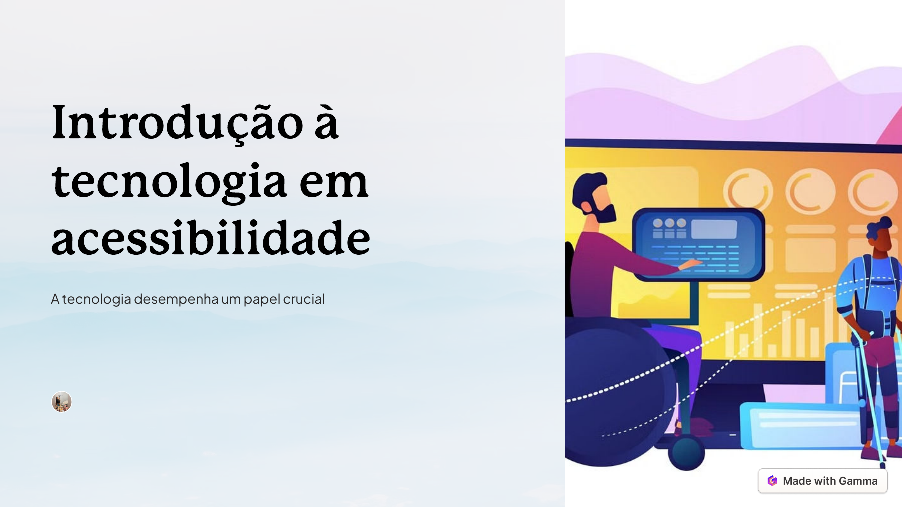 Introdução à tecnologia em acessibilidade A tecnologia desempenha um papel crucial em tornar o mundo mais acessível para pessoas com deficiências, permitindo que elas participem plenamente da sociedade e tenham acesso a oportunidades antes inacessíveis. by N. Esthefany Santos de Paula https://gamma.app Benefícios da acessibilidade para os usuários Inclusão A tecnologia acessível promove a inclusão social, permitindo que pessoas com deficiências tenham acesso a informações, serviços e oportunidades. Autonomia Soluções tecnológicas acessíveis aumentam a autonomia e independência das pessoas com deficiências em suas atividades diárias. Qualidade de Vida A tecnologia acessível melhora significativamente a qualidade de vida das pessoas com deficiências, ao facilitar o acesso a recursos essenciais. https://gamma.app Desafios enfrentados pela sociedade 1 Infraestrutura Inadequada Muitos espaços públicos e privados ainda não são totalmente acessíveis, dificultando o acesso de pessoas com deficiências. 2 Falta de Conscientização Há uma necessidade de aumentar a conscientização sobre a importância da acessibilidade na sociedade. 3 Barreiras Tecnológicas Algumas tecnologias ainda não são totalmente compatíveis com as necessidades das pessoas com deficiências. https://gamma.app Soluções tecnológicas para melhorar a acessibilidade Interfaces Adaptativas Tecnologias que se adaptam às necessidades dos usuários, como leitores de tela, controle de voz e ampliadores de tela. Dispositivos de Assistência Equipamentos como cadeiras de rodas, próteses e implantes que ajudam pessoas com deficiências a realizar tarefas diárias. Aplicativos Inclusivos Aplicativos e plataformas digitais que incorporam recursos de acessibilidade, como legendas, descrições de áudio e navegação simplificada. https://gamma.app Impacto da acessibilidade na inclusão social 1 Acesso a Oportunidades A tecnologia acessível permite que pessoas com deficiências tenham acesso a empregos, educação e serviços públicos. 2 Participação Ativa Soluções tecnológicas facilitam a participação de pessoas com deficiências em atividades sociais, culturais e políticas. 3 Empoderamento A tecnologia acessível empodera as pessoas com deficiências, dando-lhes mais controle sobre suas vidas e oportunidades. https://gamma.app Considerações sobre a implementação da acessibilidade Design Universal Projetar produtos e serviços que sejam acessíveis a todos, incluindo pessoas com deficiências. Conformidade Regulatória Cumprir com as leis e regulamentos sobre acessibilidade para garantir a inclusão. Envolvimento da Comunidade Colaborar com pessoas com deficiências e suas organizações para entender suas necessidades. Inovação Contínua Buscar constantemente novas soluções tecnológicas que melhorem a acessibilidade. https://gamma.app Conclusão e próximos passos Acessibilidade é fundamental A tecnologia desempenha um papel crucial em tornar o mundo mais inclusivo Benefícios transformadores A acessibilidade melhora a qualidade de vida, autonomia e inclusão social Desafios a serem superados Infraestrutura, conscientização e barreiras tecnológicas precisam ser abordadas Soluções inovadoras Interfaces adaptativas, dispositivos de assistência e aplicativos inclusivos são exemplos de avanços Ao avançar, a implementação da acessibilidade exige um esforço conjunto de governos, empresas e a sociedade civil. Apenas juntos podemos criar um mundo mais inclusivo e justo para todos. https://gamma.app