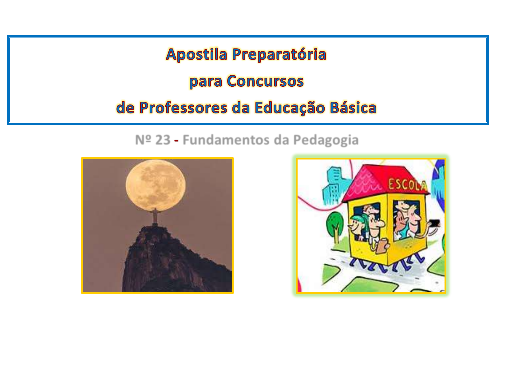 Nº 23 - Fundamentos da Pedagogia Foto da “Lua Cheia se pondo”, tirada de Niterói, na Região Metropolitana do Rio de Janeiro, por Leonardo Sens. Apostila Preparatória para Concursos de Professores da Educação Básica Nº 23 - Fundamentos da Pedagogia Organizador: Prof. Antonio Ferreira da Cruz Quem vive para alcançar o SER, quase sempre vem a TER; quem vive para alcançar o TER, quase nunca vem a SER. Organizador: Prof. Antonio Ferreira da Cruz Cabo Frio - RJ 2023 1974 2021 Se o Organizador puder ser útil, para auxiliar os seus estudos, por favor, comunique-se com ele pelo endereço eletrônico: profantcruz@gmail.com mailto:profantcruz@gmail.com Prezado(a) Professor(a) Concurseiro(a)! Remeto um Mapa Mental com o objetivo de facilitar a memorização dos assuntos mais cobrados em Concursos para o Magistério Público da Educação Básica, contendo 60 mapas sobre Pedagogia. Rogo ao nosso BOM DEUS para que vocês alcancem a VITÓRIA DA APROVAÇÃO! Assunto Páginas 1. Composição dos níveis escolares .............................................................................................................. 8 2. Educação Básica I. .......................................................................................................................... 9 3. Educação Básica II. ........................................................................................................................ 10 4. Educação Básica III - Currículo pedagógico ................................................................................................. 11 5. Educação Básica IV ....................................................................................................................... 12 6. Educação Infantil ............................................................................................................................ 13 7. Ensino Fundamental ........................................................................................................................14 8. Ensino Médio .............................................................................................................................15 9. Educação de Jovens e Adultos .......................................................................................................................................................................16 10. Educação Profissional Técnica Nível Médio ............................................................................................... 17 11. Planejamento. .............................................................................................................................. 18 12. Planejamento: o que é segundo ..........................................................................................................19 13. Planejamento: níveis ................................................................................................................ .......20 14. Planejamento: tipos: .................................................................... ............................................................................................................................................21 15. Planejamento: modalidades: ..........................................................................................................................................................................................22 16. Educação a distância: características ............................................................................................................................................................................23 17. Educação a distância: dificuldades ...............................................................................................................................................................................24 18. Origem e formação dos professores no Brasil I ...........................................................................................................................................................25 19. Origem e formação dos professores no Brasil II ...........................................................................................................................................................26 20. Ensaios intermitentes de formação de professores (1827-1890) ...........................................................................................................................27 21. Reforma das escolas normais (1890-1932) ..................................................................................................................................................................28 22. Institutos de Educação (1932-1939) .............................................................................................................................................................................29 23. Cursos de Pedagogia e de Licenciatura e substituição do modelo das Escolas Normais .........................................................................................30 24. Advento dos Institutos Superiores de Educação, o novo perfil do Curso de Pedagogia .............................................................................................31 25. Programas de governo de incentivo à formação continuada dos docentes I .......................................................................................................32 26. Programas de governo de incentivo à formação continuada dos docentes II ........................................................................................................33 27. Programas de governo de incentivo à formação continuada dos docentes III .................................................................................................................34 28. Programas de governo de incentivo à formação continuada dos docentes IV ...........................................................................