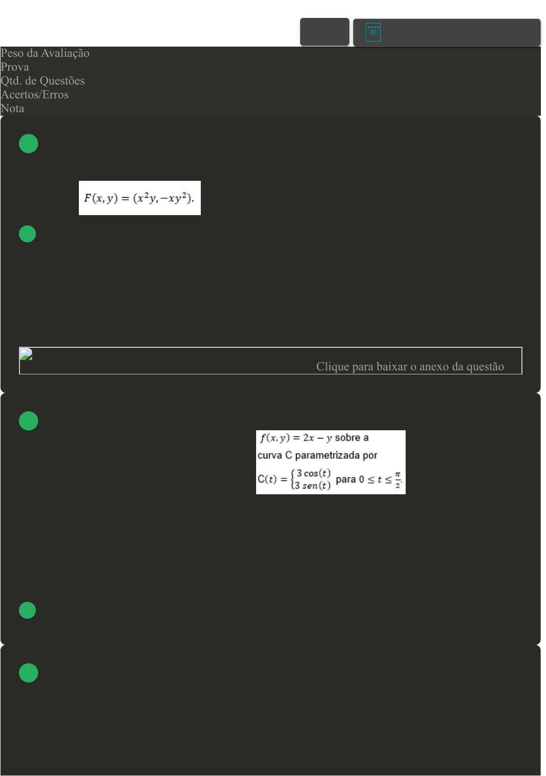 Prova Impressa GABARITO | Avaliação II - Individual (Cod.:955317) Peso da Avaliação 2,00 Prova 81360953 Qtd. de Questões 10 Acertos/Erros 10/0 Nota 10,00 Os campos vetoriais são altamente utilizados no estudo do comportamento de forças em um espaço. Por isso, é importante sabermos encontrar propriedades desses campos vetoriais através do cálculo de divergente e rotacional, por exemplo. Com relação ao campo vetorial, assinale a alternativa CORRETA: A O campo divergente é nulo em todos os pontos do plano. B O campo rotacional é um vetor nulo. C O campo divergente é diferente de zero no ponto (0, 0). D O divergente do rotacional do campo vetorial não é nulo. Tabela: Derivados, Integrais e Identidades Trigonométricas1Clique para baixar o anexo da questão Considere a curva C definida pelo um quarto da circunferência de raio 3 contida no primeiro quadrante e calcule a integral de linha da função A 6. B 3. C 0. D 9. Uma das aplicações de derivada na física é a velocidade de uma partícula, porém outra aplicação muito utilizada de derivada é a reta tangente. Determine a reta tangente da função vetorial: VOLTAR A+ Alterar modo de visualização 1 2 3 A A reta tangente é 2t + 3. B A reta tangente é 2 + 3t. C A reta tangente é (2t, 3). D A reta tangente é (2, 3t). Para determinar o escoamento de um fluido ao longo de uma curva em um campo de velocidades, podemos utilizar a integração de linha sobre campos vetoriais (campo de velocidades). O escoamento ao longo do campo vetorial A Somente a opção II está correta. B Somente a opção I está correta. C Somente a opção III está correta. D Somente a opção IV está correta. Os campos vetoriais são altamente utilizados no estudo do comportamento de forças em um espaço. Por isso, é importante sabermos encontrar propriedades desses campos vetoriais através do cálculo de divergente e rotacional, por exemplo. Com relação ao campo vetorial, assinale a alternativa CORRETA: A O campo divergente é nulo em todos os pontos do plano. B O divergente do rotacional do campo vetorial é nulo. 4 5 C O campo divergente é diferente de zero no ponto (0, 0). D O campo rotacional é um vetor nulo. O rotacional de uma função vetorial é um campo vetorial e calcula como os vetores de um campo vetorial se aproximam (afastam) de um vetor normal. Com relação ao rotacional, podemos afirmar que o rotacional da função vetorial A Somente a opção I está correta. B Somente a opção III está correta. C Somente a opção IV está correta. D Somente a opção II está correta. Para modelar matematicamente situações físicas, utilizamos o conceito de funções. Sabendo as propriedades da função, conseguimos encontrar respostas para o problema modelado. No entanto, para encontrar as respostas, é importante conhecer os vários tipos de funções e as suas propriedades. Com relação aos tipos de funções, podemos classificá-las dependendo do seu conjunto domínio e do seu conjunto imagem. Com relação às funções e seu domínio e imagem, associe os itens, utilizando o código a seguir: I- Função vetorial de uma variável. II- Função vetorial de n variáveis ou campos vetoriais. III- Função escalar ou função real de n variáveis. IV- Função real de uma variável. Assinale a alternativa que apresenta a sequência CORRETA: A III - II - IV - I. B III - II - I - IV. C II - IV - I - III. 6 7 D II - III - IV - I. O comprimento do arco da curva A Somente a opção I é correta. B Somente a opção IV é correta. C Somente a opção II é correta. D Somente a opção III é correta. O divergente de uma função vetorial mede como é a dispersão do campo de vetores. No caso de um fluido, o divergente pode indicar onde teria um sumidouro ou uma fonte dependendo do sinal já que o divergente de uma função vetorial é um escalar. Com relação ao divergente, podemos afirmar que o divergente da função vetorial A Somente a opção III está correta. B Somente a opção IV está correta. C Somente a opção II está correta. 8 9 D Somente a opção I está correta. Uma partícula está se movendo segundo a função posição que depende do tempo. Então o vetor tangente unitário da função posição A Somente a opção I é correta. B Somente a opção II é correta. C Somente a opção IV é correta. D Somente a opção III é correta. 10 Imprimir