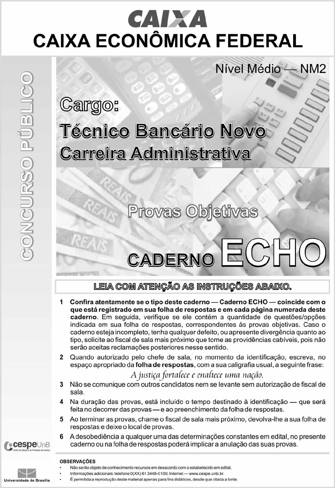 UnB/CESPE – CAIXA/NM2 Cargo: Técnico Bancário Novo Caderno ECHO – 1 – • Nas questões a seguir, marque, para cada uma, a única opção correta, de acordo com o respectivo comando. Para as devidas marcações, use a Folha de Respostas, único documento válido para a correção das suas respostas. C Nas questões que avaliam conhecimentos de informática, a menos que seja explicitamente informado o contrário, considere que: todos os programas mencionados estão em configuração-padrão, em português; o mouse está configurado para pessoas destras; expressões como clicar, clique simples e clique duplo referem-se a cliques com o botão esquerdo do mouse; teclar corresponde à operação de pressionar uma tecla e, rapidamente, liberá-la, acionando-a apenas uma vez. Considere também que não há restrições de proteção, de funcionamento e de uso em relação aos programas, arquivos, diretórios, recursos e equipamentos mencionados. ���������� � �� ��� Texto para as questoes de 1 a 8 Especialistas concordam que é papel do1 ensino fundamental e médio — e não apenas da universidade — cooperar de alguma forma com o processo de formação dos futuros profissionais. Isso não implica ensinar4 jovens estudantes a mexer com planilhas de cálculos ou a empreender um novo negócio. Requer, sim, dar-lhes recursos para lidar com a realidade e, por exemplo, com a competição7 que um dia virá. Então, a dúvida que permanece é: nossas escolas de fato cumprem essa tarefa? Carlos Alberto Ramos, professor do Departamento de10 Economia da Universidade de Brasília, aponta falhas nessa missão. Ele identifica um abismo na transição entre o sistema escolar e o mercado de trabalho. “Nosso modelo educacional13 é muito segmentado, e os conhecimentos de línguas e matemática, por exemplo, são muito diferentes dos valores compreendidos durante a vida profissional”, defende.16 O despreparo dos jovens, portanto, é patente. “Desde cedo, é preciso ensinar as crianças a pensar e a se adequar a novas realidades”, diz Ramos. “Elas contam, inclusive, com19 uma vantagem para isso: são mais flexíveis a mudanças e estão sempre abertas a novas tecnologias”. Infelizmente, conclui o especialista, não é isso o que acontece nas escolas.22 O mais curioso é que, a despeito de qualquer discussão sobre o dever das escolas, ajudar no desenvolvimento do aluno com vistas à sua colocação no25 mercado de trabalho é um fundamento no país, estabelecido pela Lei de Diretrizes e Bases da Educação Nacional, conjunto de normas que dá o norte ao sistema educacional brasileiro.28 Portanto, tal tarefa cabe a todos os níveis do ensino básico, dos cinco aos 17 anos. Para Claudio de Moura Castro, especialista em31 educação, as escolas de ensino infantil e fundamental oferecem aos estudantes, geralmente, a proposta correta para a capacitação para a vida profissional. Isso significa: ensinar a34 ler, escrever e falar adequadamente já durante a alfabetização infantil. O problema, segundo o especialista, aparece no ensino médio. “Nesse nível, as escolas são desmotivadoras,37 oferecendo conteúdos específicos para que os alunos estejam preparados para o vestibular”, afirma. “Mas, na verdade, não preparam o estudante para nada”.40 Moura Castro aponta três habilidades fundamentais aos profissionais de hoje e do futuro. Elas são decorrentes da boa leitura, da boa escrita e da capacidade de comunicar-se43 bem. “Todos os profissionais precisam saber resolver problemas, falar em público e trabalhar em equipe”, sentencia. “É nesse momento de aprendizado que se dissolve a fronteira46 entre o que é acadêmico — ensinado na escola — e o que é profissional e prático para o mercado de trabalho.” Marina Dias. Bom profissional se faz na escola, 4/9/2009. Internet: <veja.abril.com.br> (com adaptações). ������� Seriam mantidos o sentido original do texto e sua correção gramatical caso fosse A substituída a expressão “com o” (R.3) por ao. B inserida a preposição em imediatamente após a forma verbal “implica” (R.4). C suprimida a preposição ‘a’ que aparece logo após a conjunção ‘e’, na linha 18. D substituída a preposição “a” por em logo após a forma verbal “cabe” (R.29). E substituído o termo “aos” (R.33) por para os. ������� � No que se refere a aspectos linguísticos do texto, assinale a opção correta. A O vocábulo “jovens” (R.5) é empregado, no texto, como substantivo. B O sujeito da forma verbal “identifica” (R.12) é “Carlos Alberto Ramos” (R.10). C A expressão “a despeito de” (R.23) é sinônima de apesar de. D Na linha 28, o emprego da preposição a, em “ao”, é exigência sintática do substantivo “norte”. E No texto, há elipse do objeto direto exigido pela forma verbal “oferecem” (R.32). ������� � No que concerne à pontuação empregada no texto, assinale a opção correta. A O emprego de vírgulas imediatamente antes e depois da expressão “por exemplo”, em ambas as suas ocorrências, nas linhas 7 e 15, é facultativo. B A substituição da vírgula logo após o vocábulo ‘segmentado’ (R.14) por ponto e vírgula não prejudica a correção gramatical e a coerência do texto. C O emprego de dois-pontos na linha 20 justifica-se por introduzir, no período, uma explicação. D Na linha 37, o emprego da vírgula é obrigatório na primeira ocorrência e facultativo na segunda. E O emprego da vírgula imediatamente após o vocábulo ‘aprendizado’ (R.46) preserva o sentido e a correção gramatical do texto. UnB/CESPE – CAIXA/NM2 Cargo: Técnico Bancário Novo Caderno ECHO – 2 – ������� Em relação ao sentido do texto e aos seus aspectos linguísticos, assinale a opção correta. A O sujeito de “Requer” (R.6) retoma “o processo de formação dos futuros profissionais”