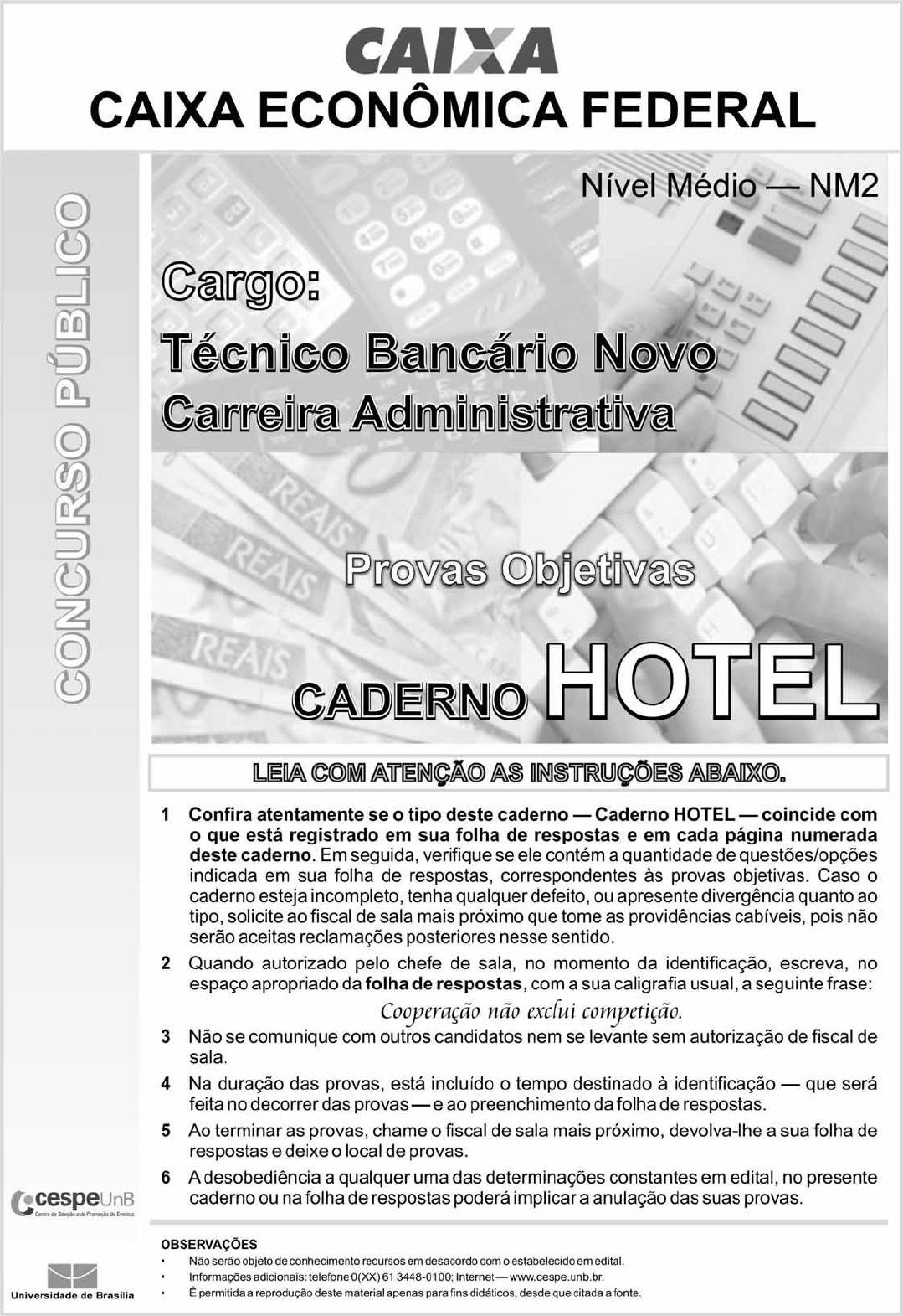 UnB/CESPE – CAIXA/NM2 Cargo: Técnico Bancário Novo Caderno HOTEL – 1 – • Nas questões a seguir, marque, para cada uma, a única opção correta, de acordo com o respectivo comando. Para as devidas marcações, use a Folha de Respostas, único documento válido para a correção das suas respostas. C Nas questões que avaliam conhecimentos de informática, a menos que seja explicitamente informado o contrário, considere que: todos os programas mencionados estão em configuração-padrão, em português; o mouse está configurado para pessoas destras; expressões como clicar, clique simples e clique duplo referem-se a cliques com o botão esquerdo do mouse; teclar corresponde à operação de pressionar uma tecla e, rapidamente, liberá-la, acionando-a apenas uma vez. Considere também que não há restrições de proteção, de funcionamento e de uso em relação aos programas, arquivos, diretórios, recursos e equipamentos mencionados. ���������� � �� ��� Texto para as questoes de 1 a 8 Especialistas concordam que é papel do1 ensino fundamental e médio — e não apenas da universidade — cooperar de alguma forma com o processo de formação dos futuros profissionais. Isso não implica ensinar4 jovens estudantes a mexer com planilhas de cálculos ou a empreender um novo negócio. Requer, sim, dar-lhes recursos para lidar com a realidade e, por exemplo, com a competição7 que um dia virá. Então, a dúvida que permanece é: nossas escolas de fato cumprem essa tarefa? Carlos Alberto Ramos, professor do Departamento de10 Economia da Universidade de Brasília, aponta falhas nessa missão. Ele identifica um abismo na transição entre o sistema escolar e o mercado de trabalho. “Nosso modelo educacional13 é muito segmentado, e os conhecimentos de línguas e matemática, por exemplo, são muito diferentes dos valores compreendidos durante a vida profissional”, defende.16 O despreparo dos jovens, portanto, é patente. “Desde cedo, é preciso ensinar as crianças a pensar e a se adequar a novas realidades”, diz Ramos. “Elas contam, inclusive, com19 uma vantagem para isso: são mais flexíveis a mudanças e estão sempre abertas a novas tecnologias”. Infelizmente, conclui o especialista, não é isso o que acontece nas escolas.22 O mais curioso é que, a despeito de qualquer discussão sobre o dever das escolas, ajudar no desenvolvimento do aluno com vistas à sua colocação no25 mercado de trabalho é um fundamento no país, estabelecido pela Lei de Diretrizes e Bases da Educação Nacional, conjunto de normas que dá o norte ao sistema educacional brasileiro.28 Portanto, tal tarefa cabe a todos os níveis do ensino básico, dos cinco aos 17 anos. Para Claudio de Moura Castro, especialista em31 educação, as escolas de ensino infantil e fundamental oferecem aos estudantes, geralmente, a proposta correta para a capacitação para a vida profissional. Isso significa: ensinar a34 ler, escrever e falar adequadamente já durante a alfabetização infantil. O problema, segundo o especialista, aparece no ensino médio. “Nesse nível, as escolas são desmotivadoras,37 oferecendo conteúdos específicos para que os alunos estejam preparados para o vestibular”, afirma. “Mas, na verdade, não preparam o estudante para nada”.40 Moura Castro aponta três habilidades fundamentais aos profissionais de hoje e do futuro. Elas são decorrentes da boa leitura, da boa escrita e da capacidade de comunicar-se43 bem. “Todos os profissionais precisam saber resolver problemas, falar em público e trabalhar em equipe”, sentencia. “É nesse momento de aprendizado que se dissolve a fronteira46 entre o que é acadêmico — ensinado na escola — e o que é profissional e prático para o mercado de trabalho.” Marina Dias. Bom profissional se faz na escola, 4/9/2009. Internet: <veja.abril.com.br> (com adaptações). ������� Seriam mantidos o sentido original do texto e sua correção gramatical caso fosse A suprimida a preposição ‘a’ que aparece logo após a conjunção ‘e’, na linha 18. B substituída a preposição “a” por em logo após a forma verbal “cabe” (R.29). C substituído o termo “aos” (R.33) por para os. D substituída a expressão “com o” (R.3) por ao. E inserida a preposição em imediatamente após a forma verbal “implica” (R.4). ������� � No que se refere a aspectos linguísticos do texto, assinale a opção correta. A Na linha 28, o emprego da preposição a, em “ao”, é exigência sintática do substantivo “norte”. B No texto, há elipse do objeto direto exigido pela forma verbal “oferecem” (R.32). C O vocábulo “jovens” (R.5) é empregado, no texto, como substantivo. D O sujeito da forma verbal “identifica” (R.12) é “Carlos Alberto Ramos” (R.10). E A expressão “a despeito de” (R.23) é sinônima de apesar de. ������� � No que concerne à pontuação empregada no texto, assinale a opção correta. A O emprego de dois-pontos na linha 20 justifica-se por introduzir, no período, uma explicação. B Na linha 37, o emprego da vírgula é obrigatório na primeira ocorrência e facultativo na segunda. C O emprego da vírgula imediatamente após o vocábulo ‘aprendizado’ (R.46) preserva o sentido e a correção gramatical do texto. D O emprego de vírgulas imediatamente antes e depois da expressão “por exemplo”, em ambas as suas ocorrências, nas linhas 7 e 15, é facultativo. E A substituição da vírgula logo após o vocábulo ‘segmentado’ (R.14) por ponto e vírgula não prejudica a correção gramatical e a coerência do texto. UnB/CESPE – CAIXA/NM2 Cargo: Técnico Bancário Novo Caderno HOTEL – 2 – ������� Em relação ao sentido do texto e aos seus aspectos linguísticos, assinale a opção correta. A A expressão “tal tarefa” (R.29) refere-se a “o dever das escolas” (R.24). B O sujeit